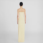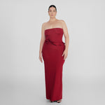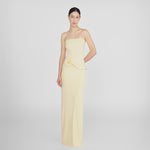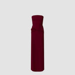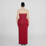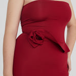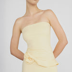 The Caracola dress boasts a sleek, strapless neckline, and a cinched silhouette that flows into a column-style skirt, accented by an asymmetric ruffle at the waist that unfurls into a delicate 3D floral embellishment on the side.