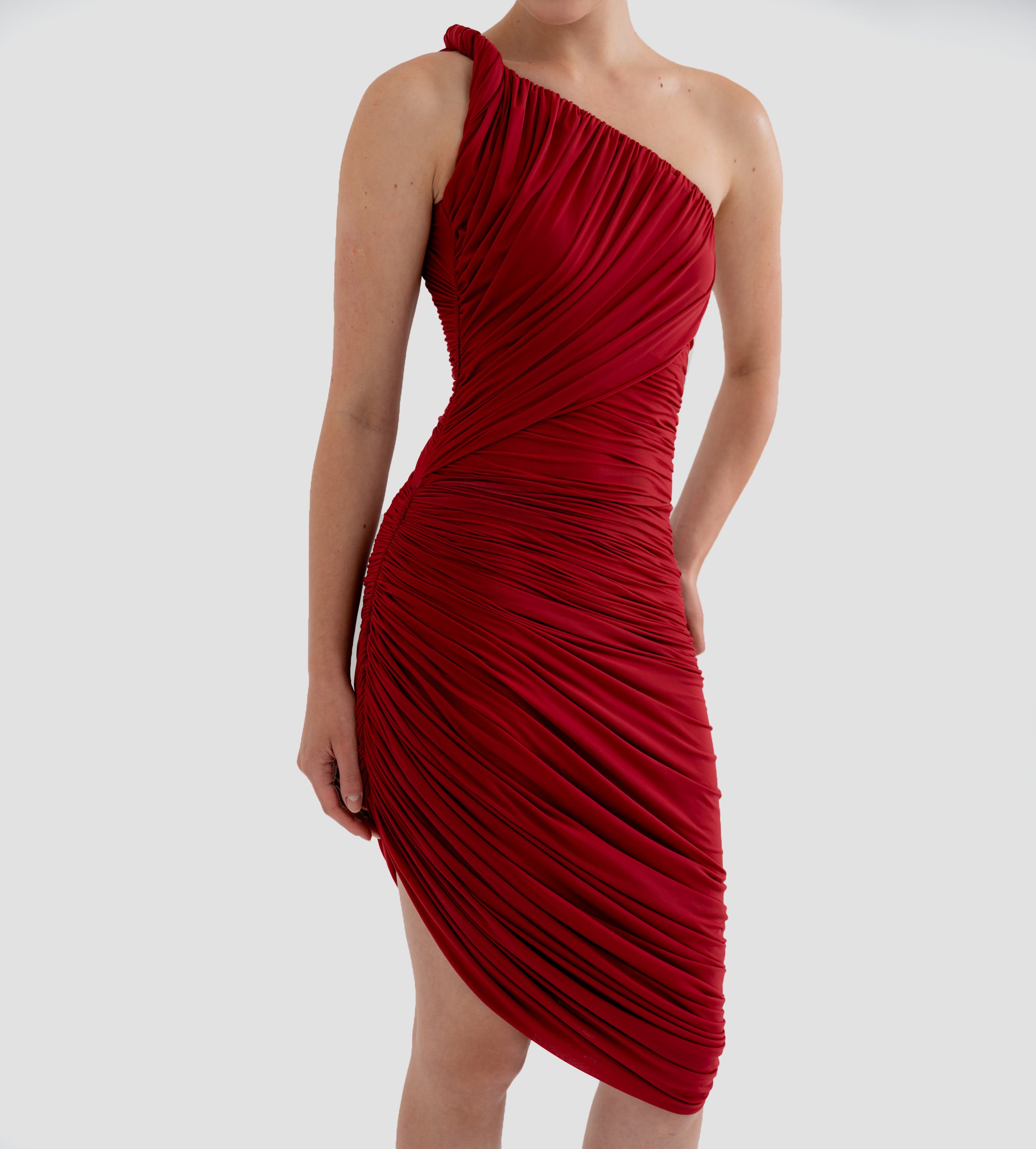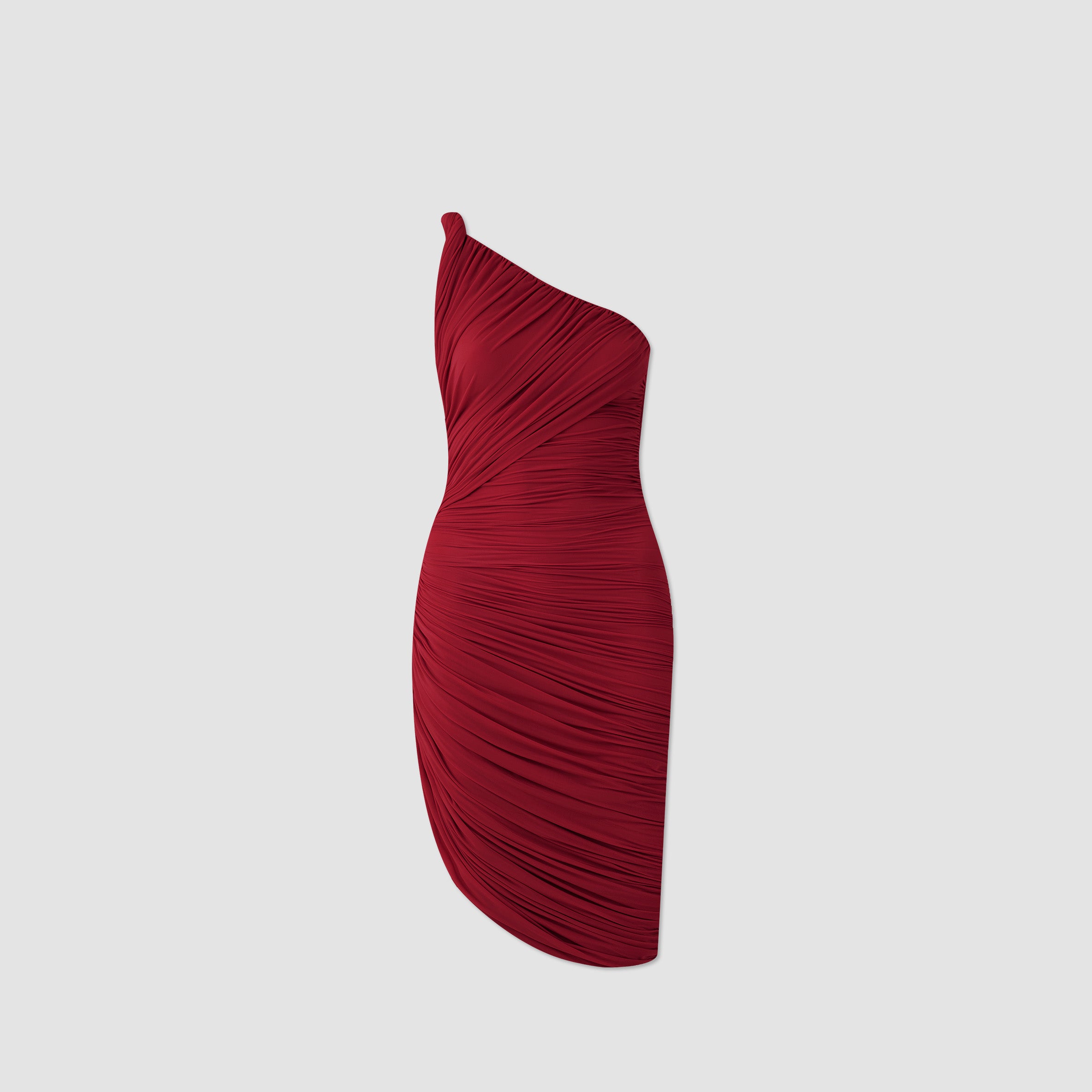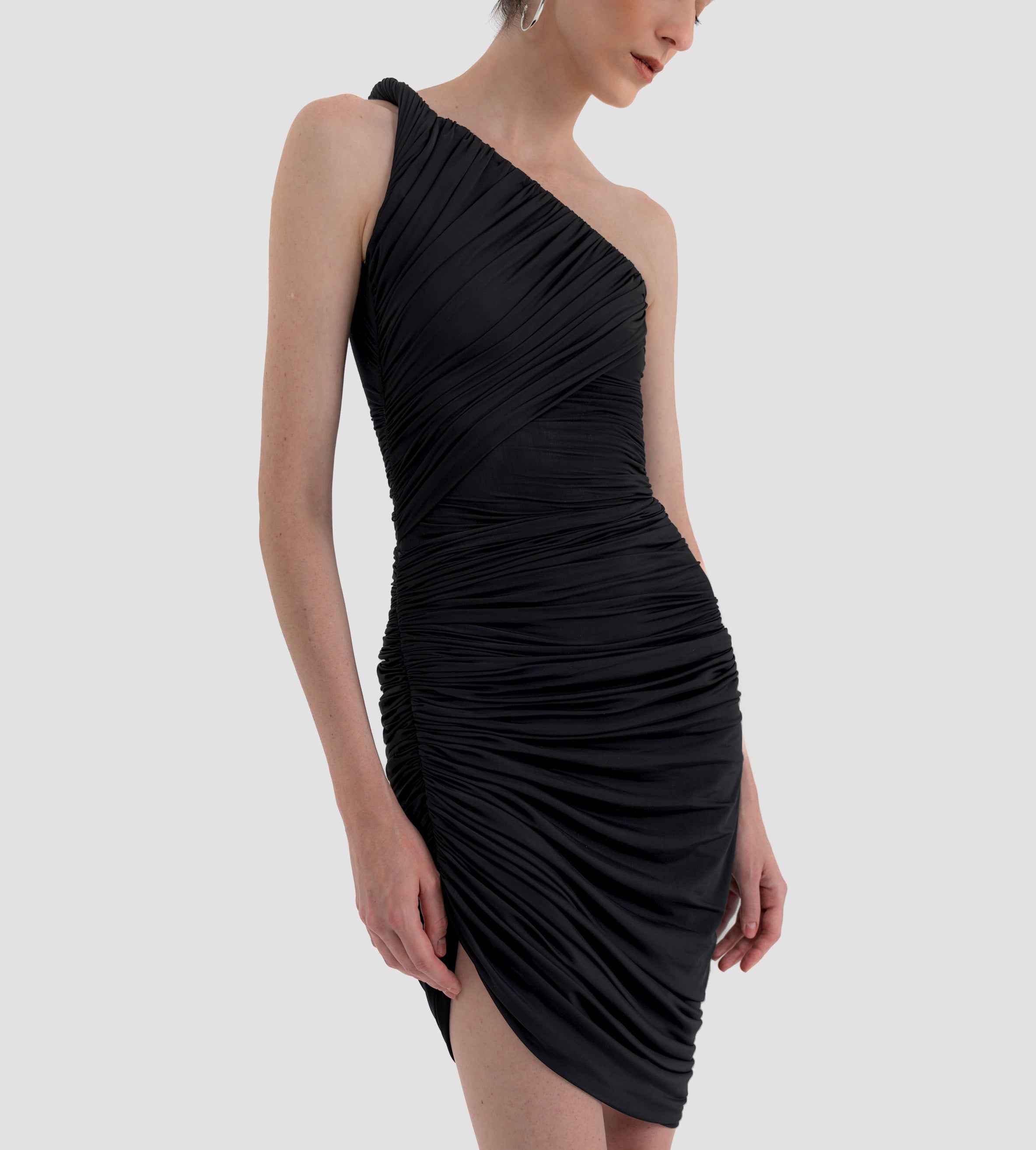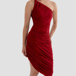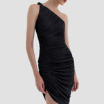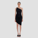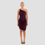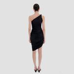 The Castillo mini dress showcases a sculptural design defined by a one-shoulder neckline and a twisted strap that flows into a dynamic fully ruched bodice and asymmetric skirt. At the back, soft draping merges with clean, unrushed zones to create a striking contrast that enhances the silhouette.