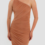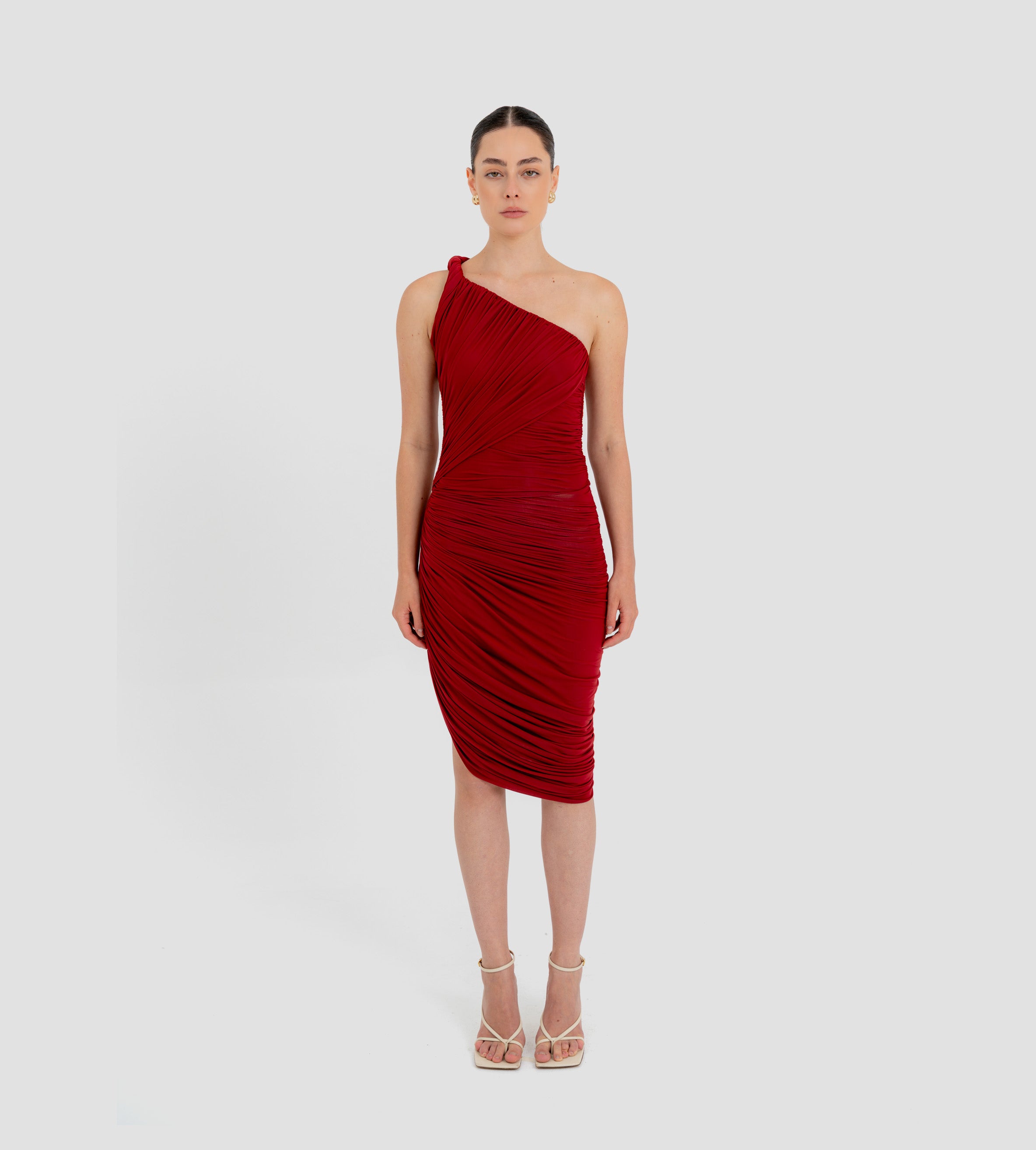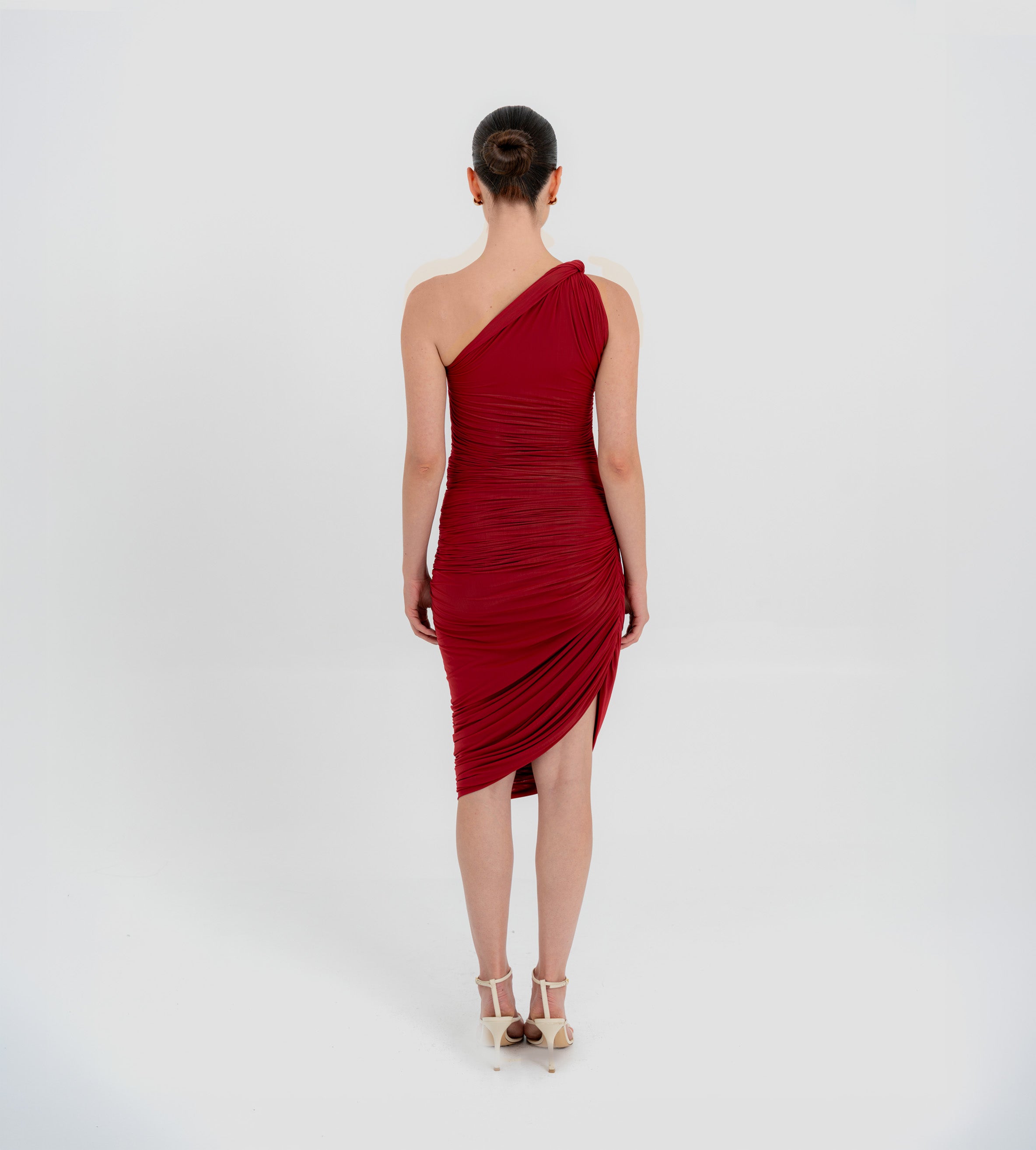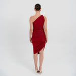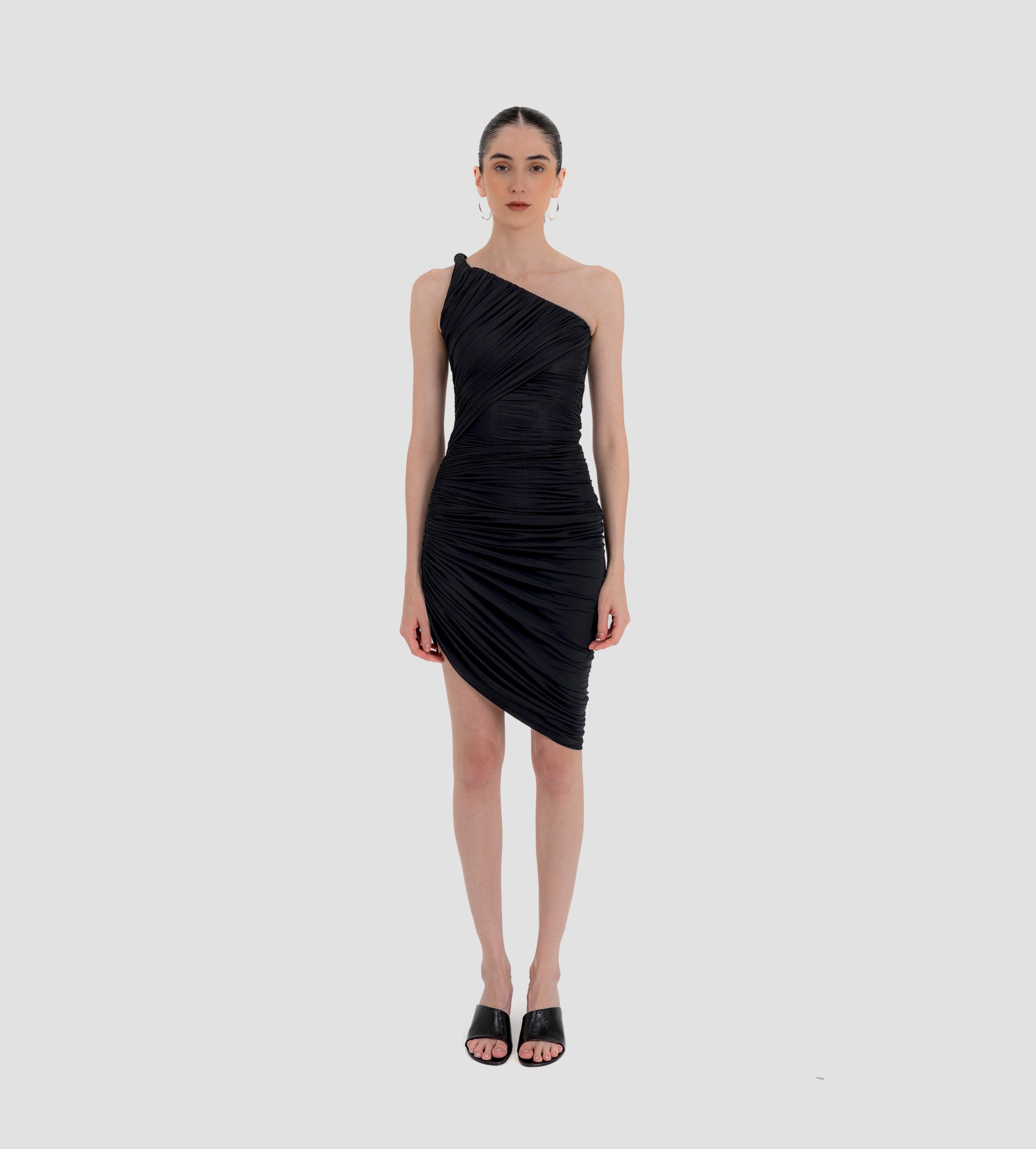 The Castillo mini dress showcases a sculptural design defined by a one-shoulder neckline and a twisted strap that flows into a dynamic fully ruched bodice and asymmetric skirt. At the back, soft draping merges with clean, unrushed zones to create a striking contrast that enhances the silhouette.