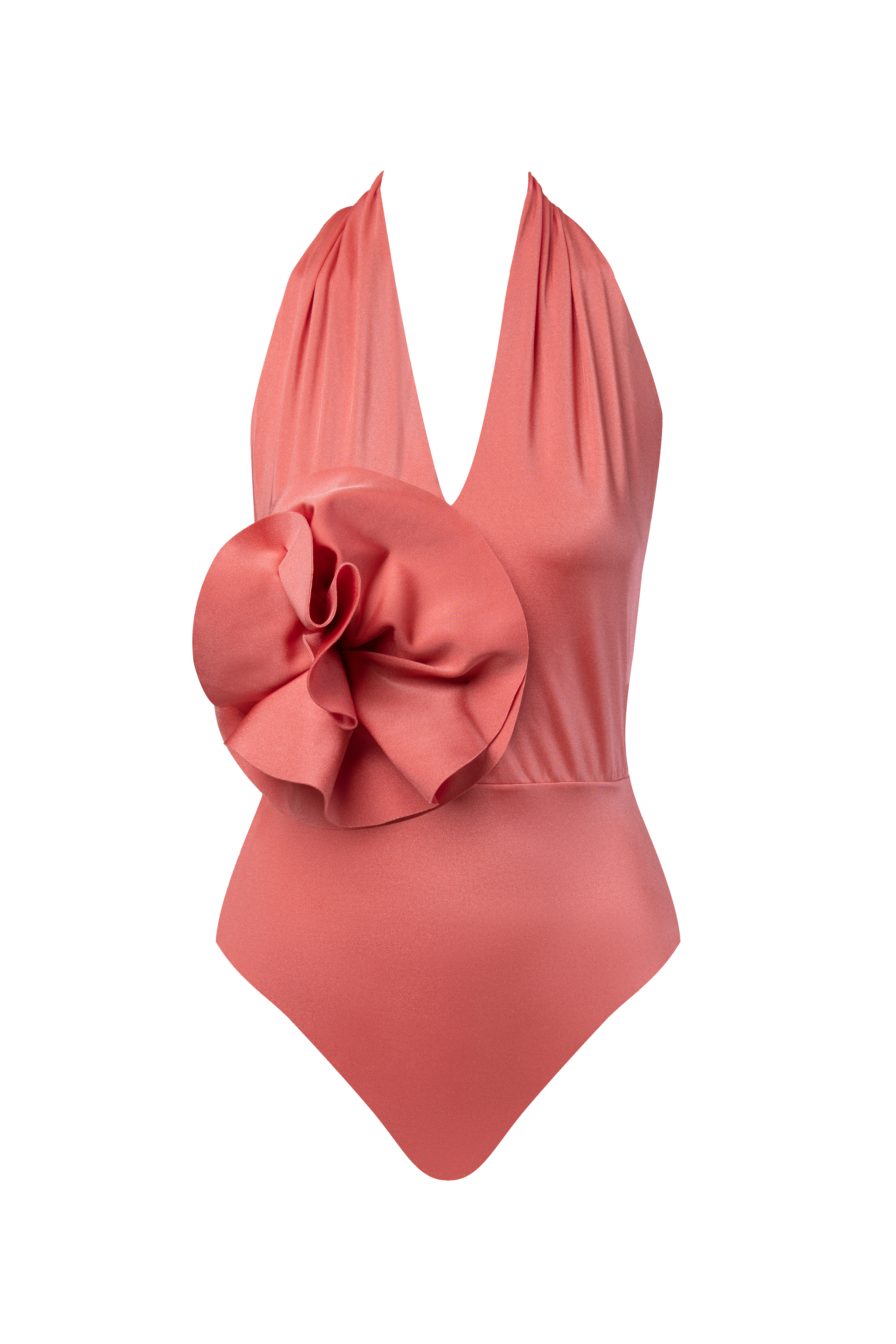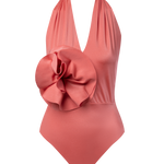 One-piece swimsuit with a halter silhouette and an open back, embellished with an oversized 3D floral detail.