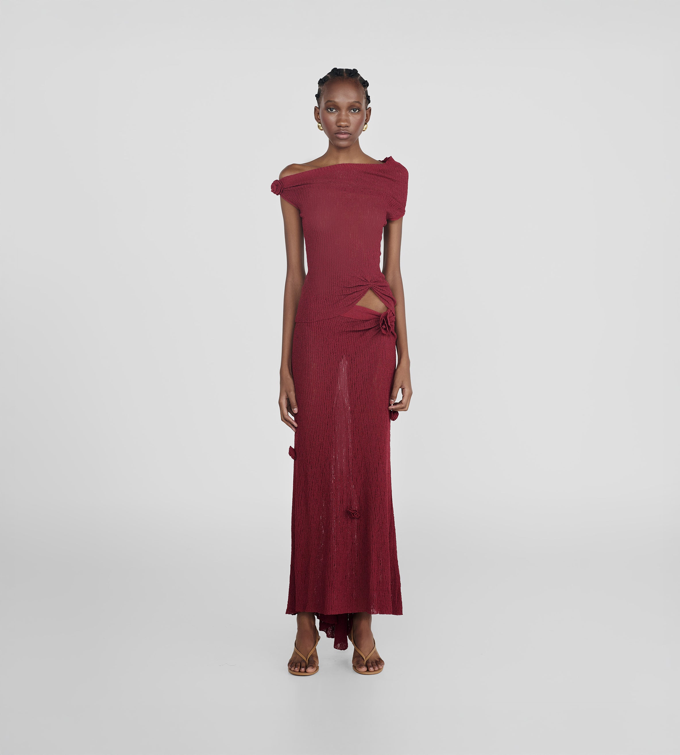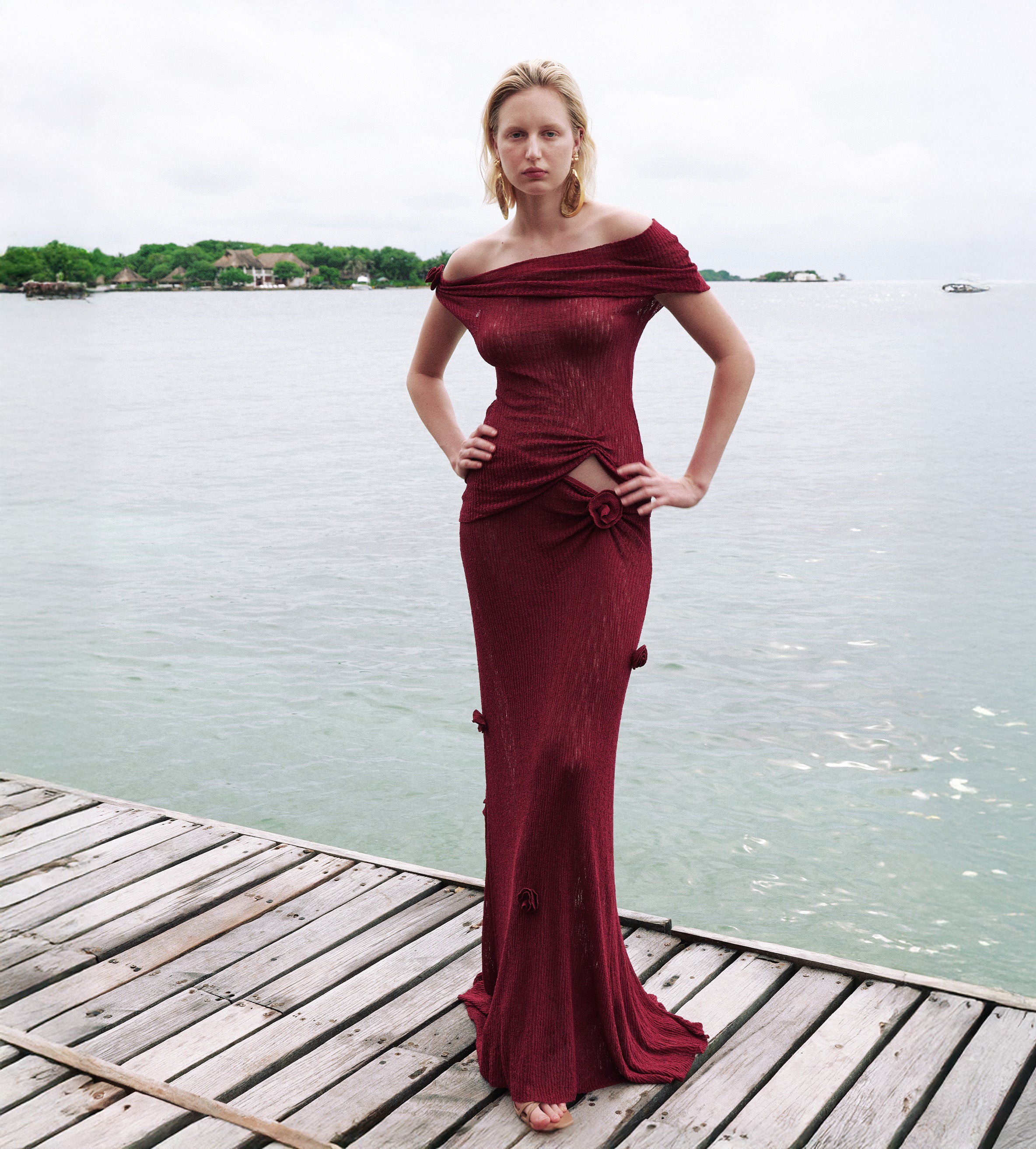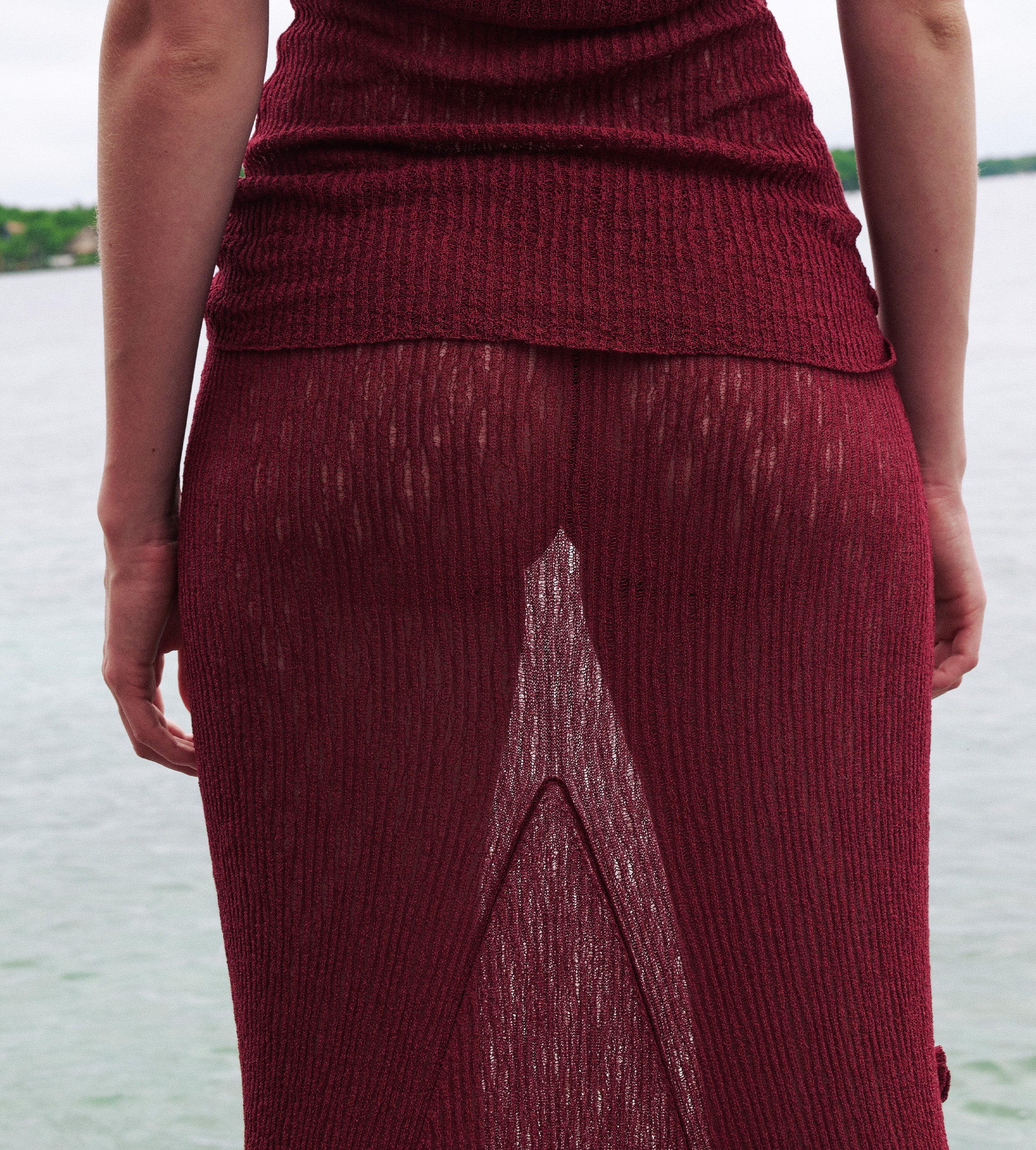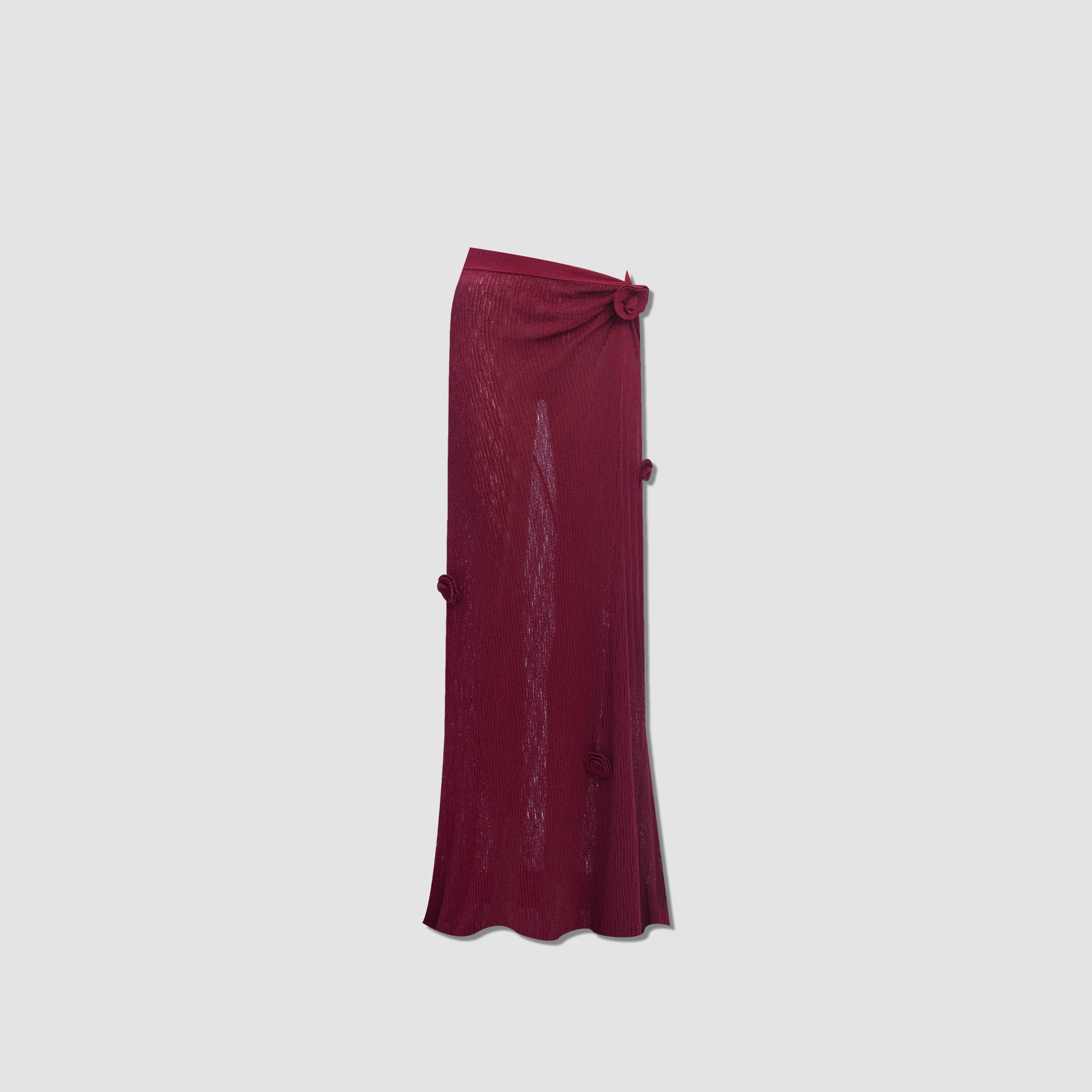 The Ceiba long skirt is meticulously crafted from a luxurious, structured Italian knit. It features an asymmetric waistband with soft ruching that seamlessly flows into an elegant A-line silhouette. Strategically placed 3D floral embellishments add a touch of artistry, embodying the essence of the brand and elevating the design with sophistication.