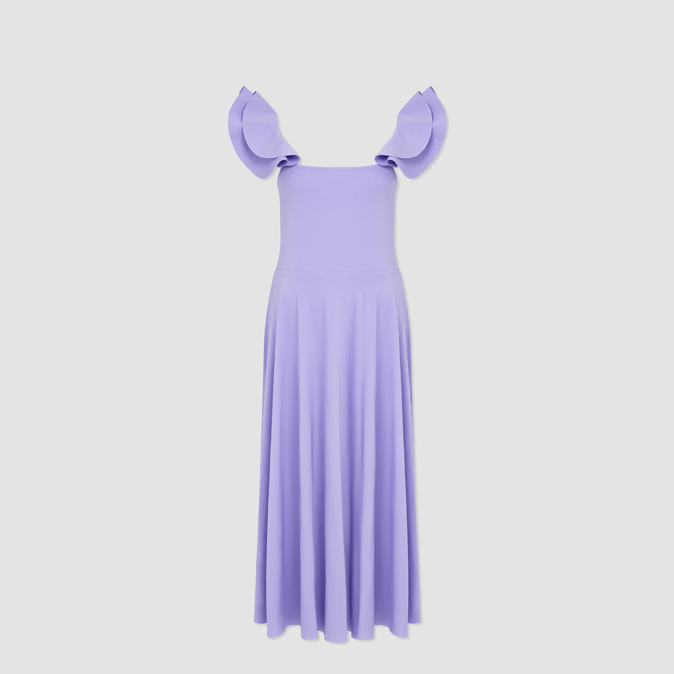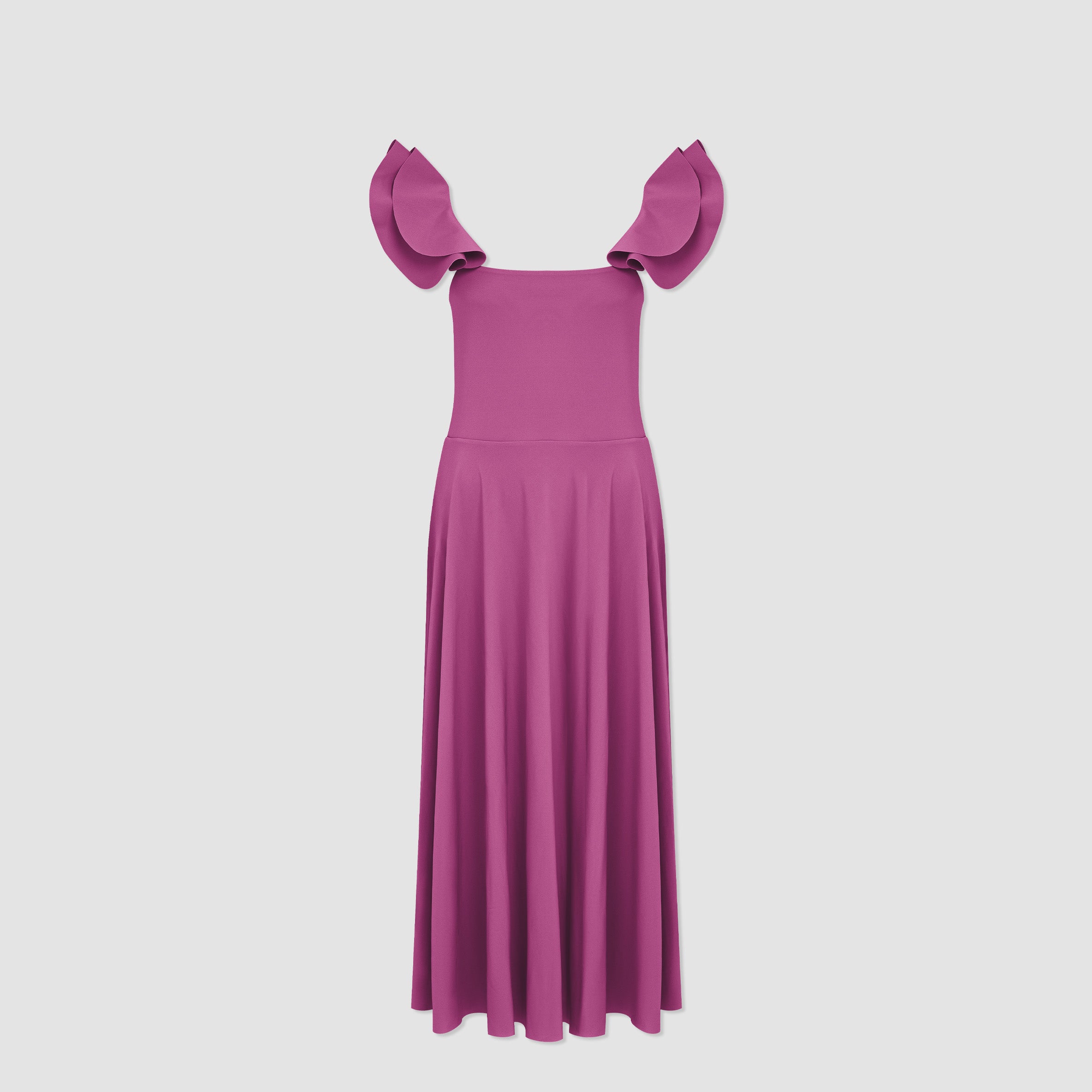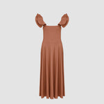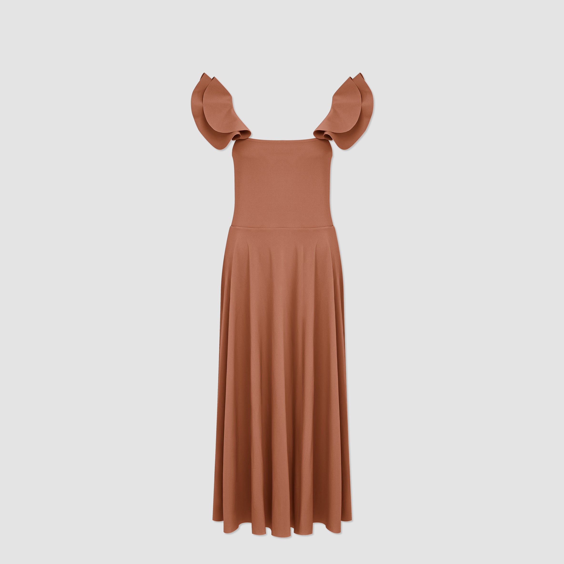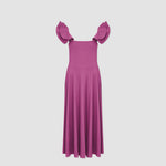 Long dress for girls featuring wide ruffled straps. It has a fitted bodice and a flowing skirt that adds movement. Elegant and comfortable design for special occasions.