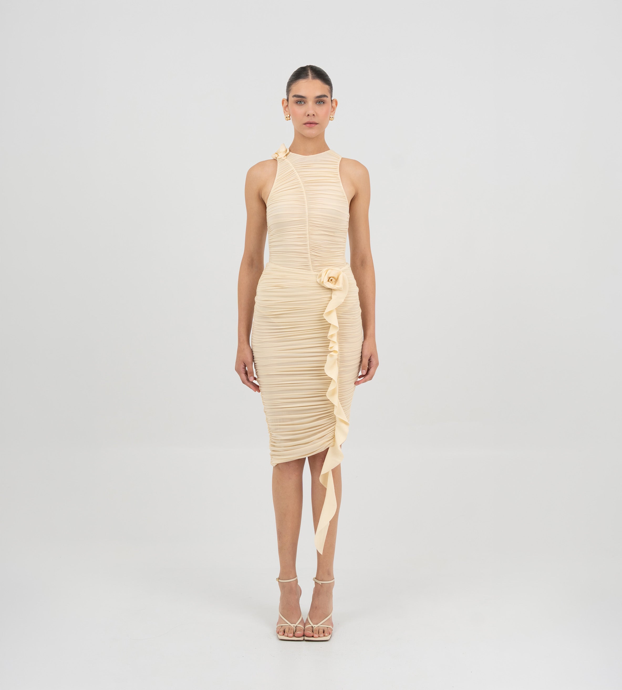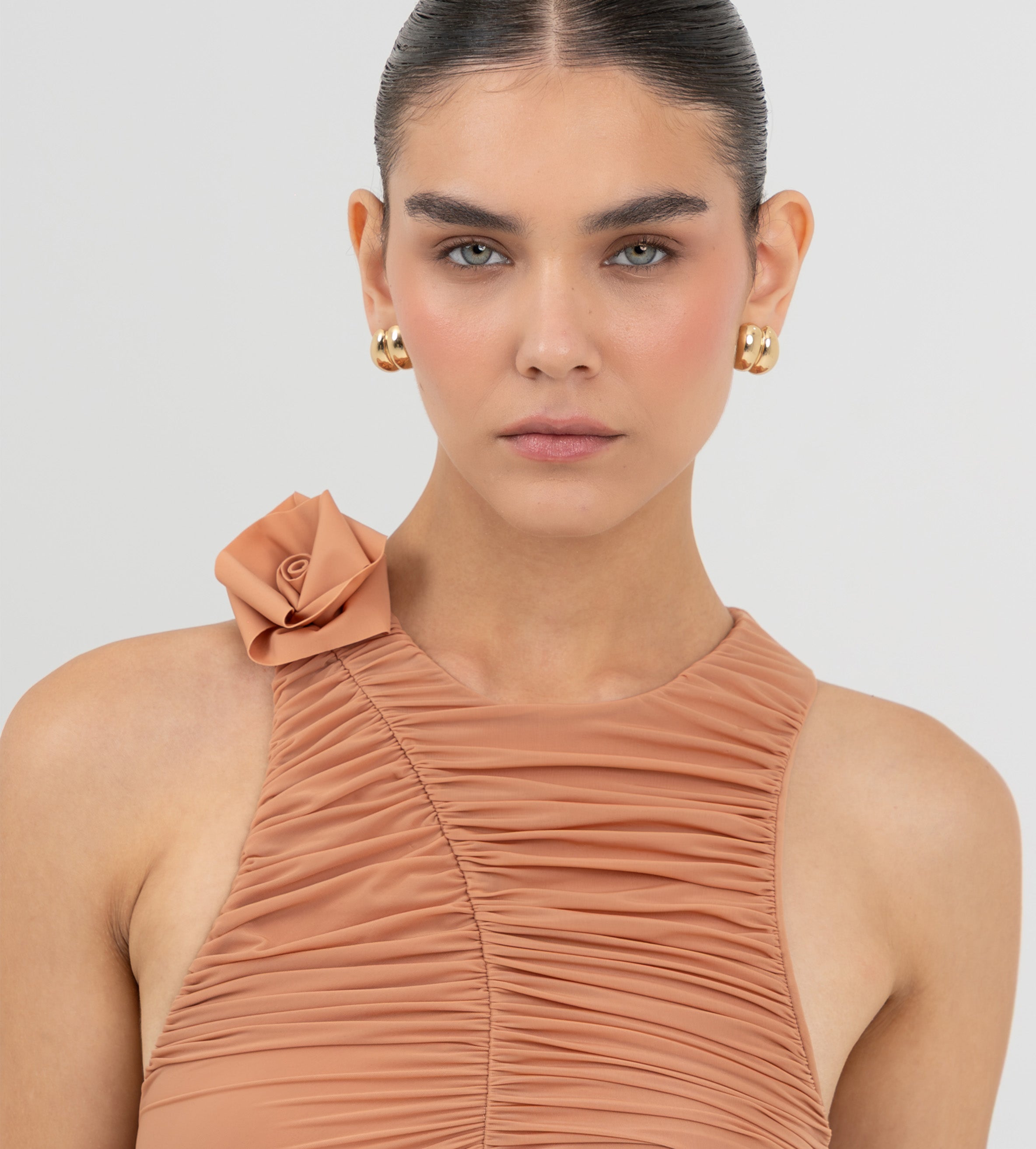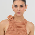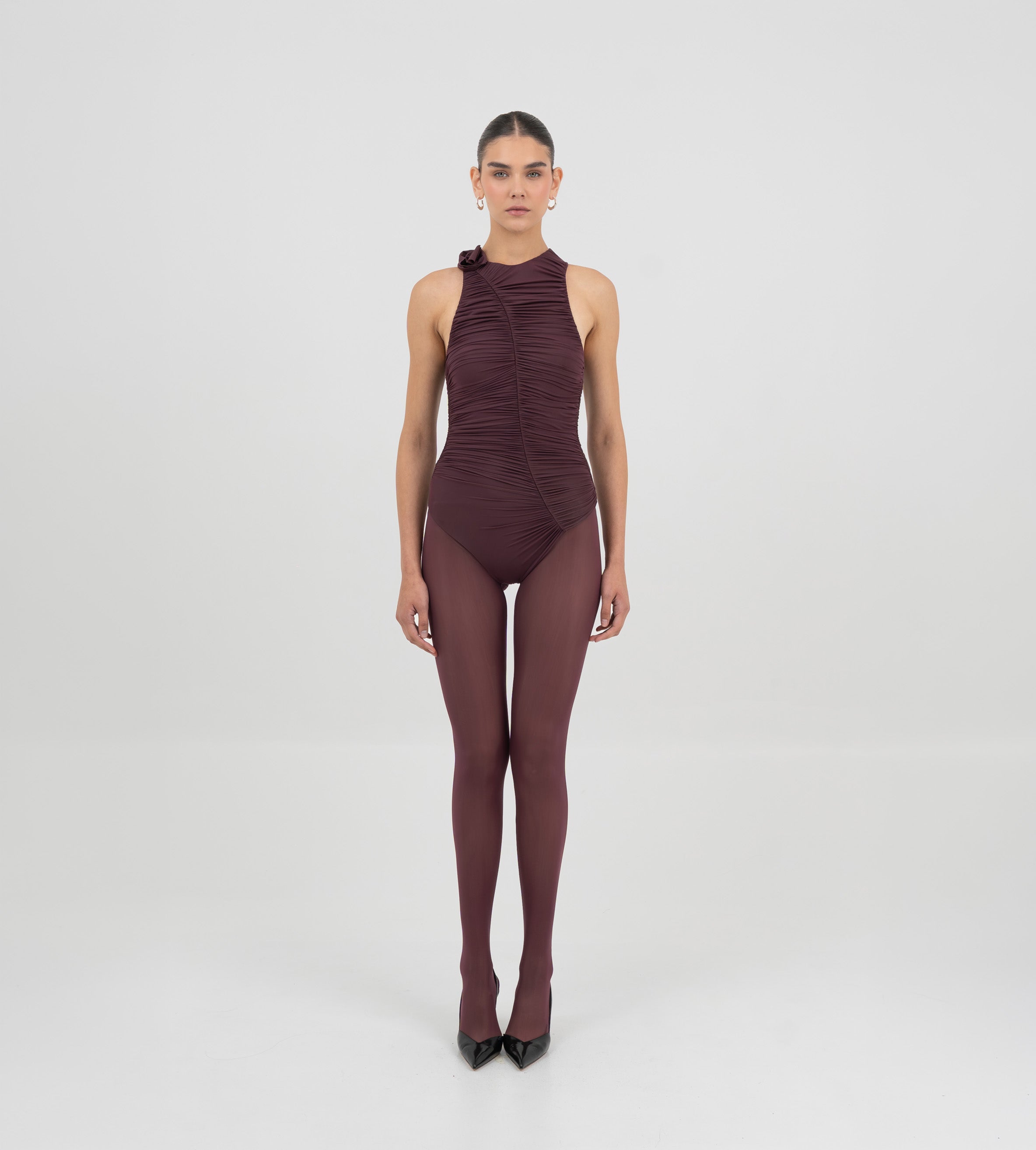 The Coco bodysuit captivates with a round neckline that flows into a deeply ruched silhouette. An S shape line frames the ruching and culminates in a sculptural 3D floral embellishment at the neck , while the back is finished with soft ruching that enhances the body.