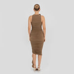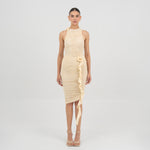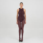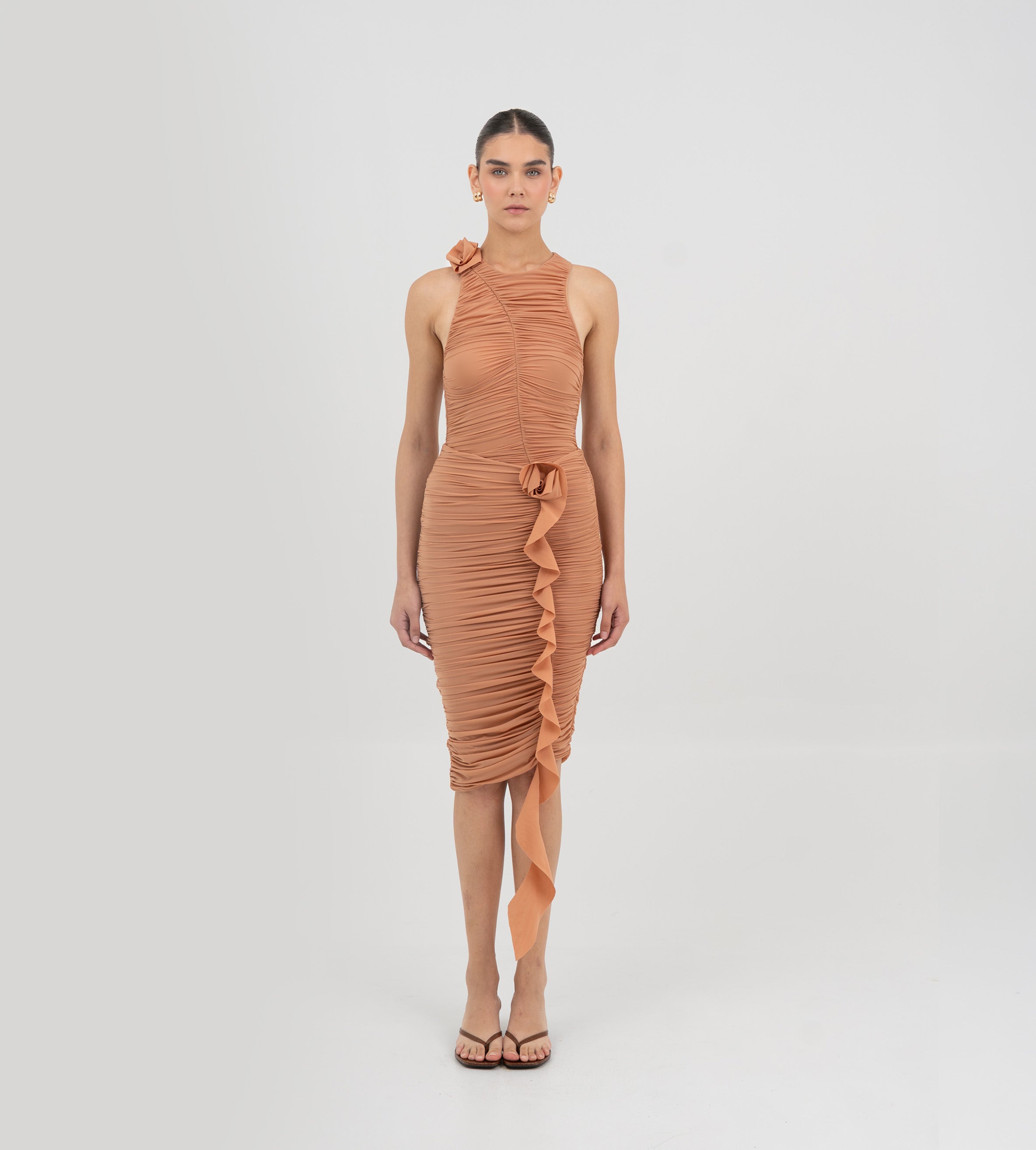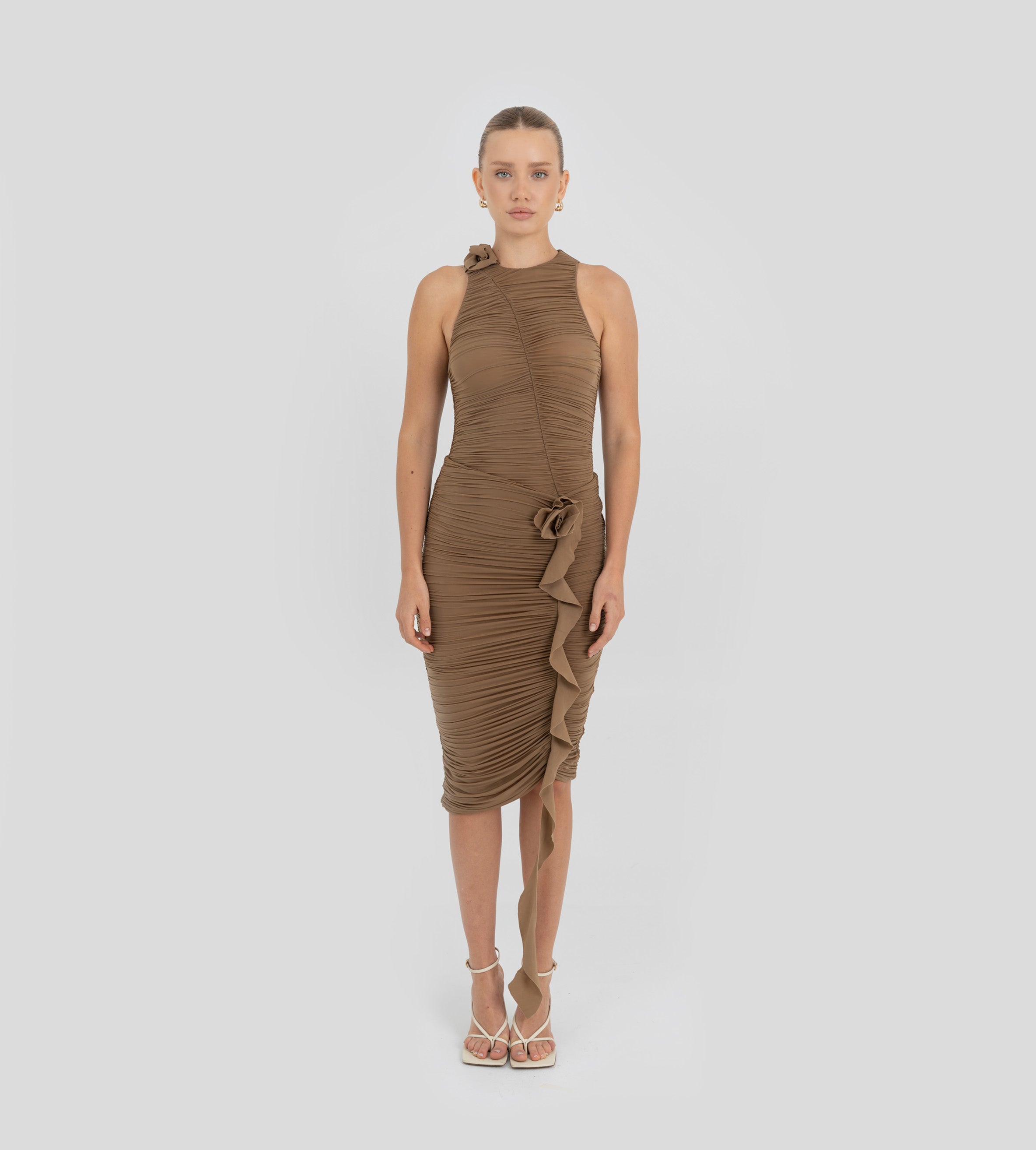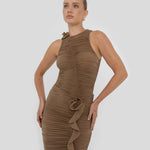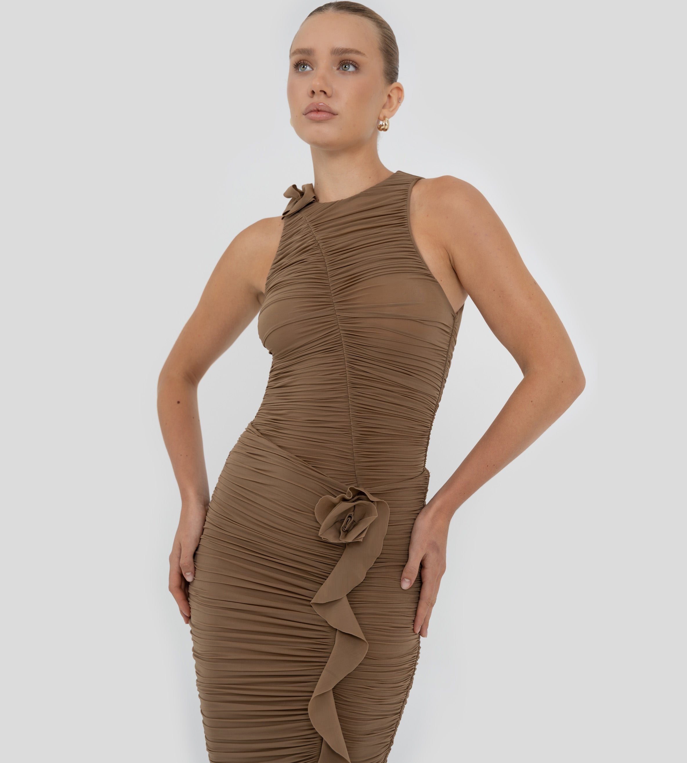 The Coco bodysuit captivates with a round neckline that flows into a deeply ruched silhouette. An S shape line frames the ruching and culminates in a sculptural 3D floral embellishment at the neck , while the back is finished with soft ruching that enhances the body.