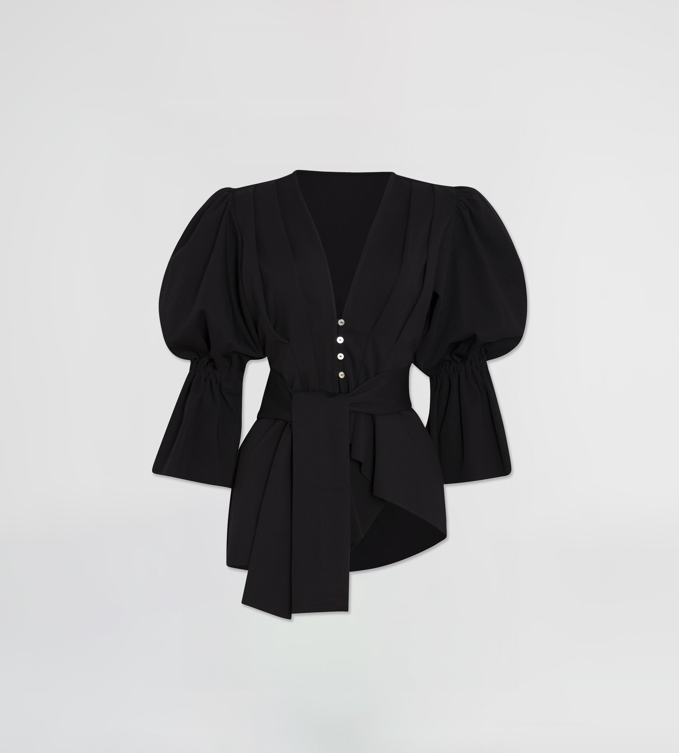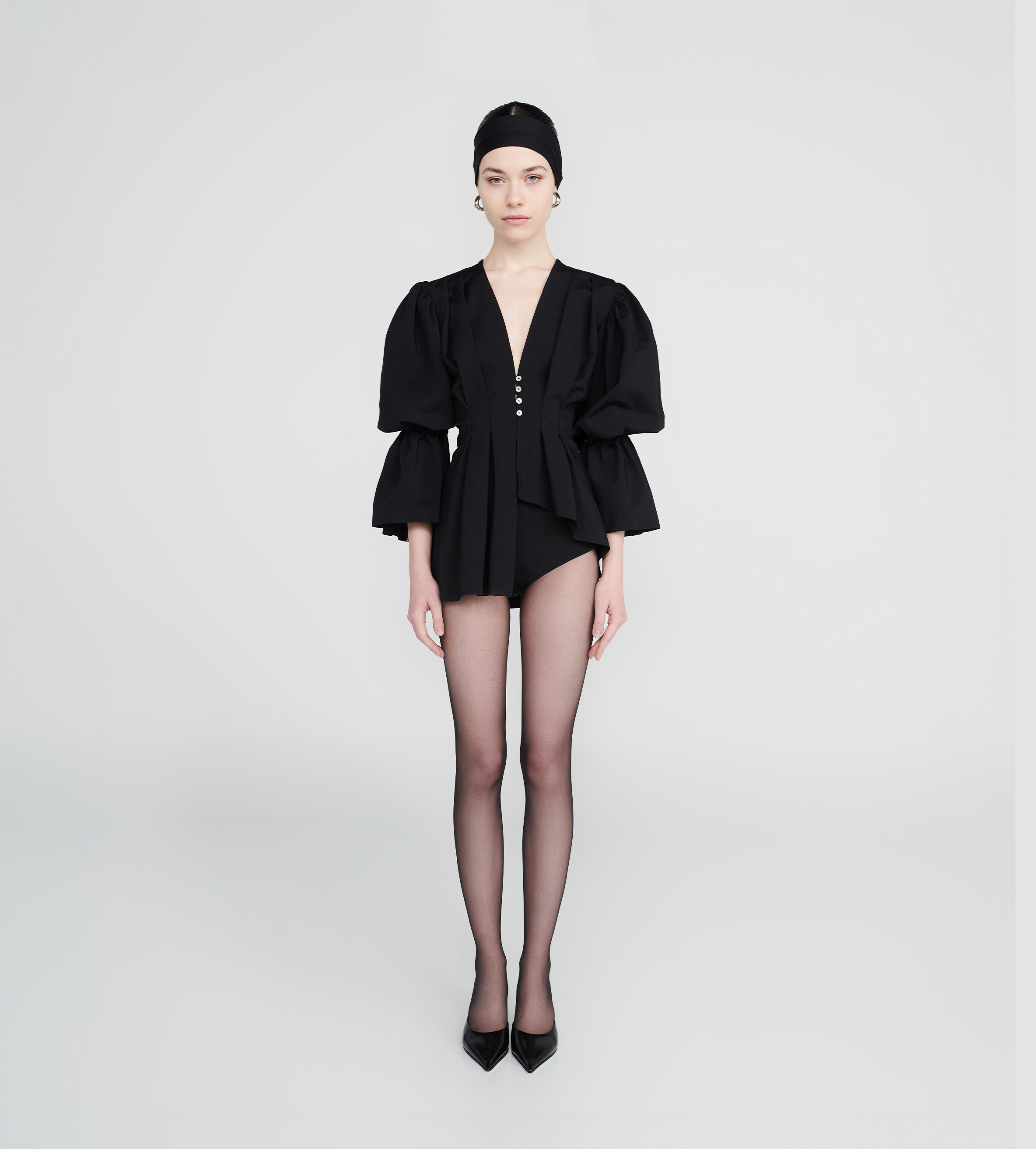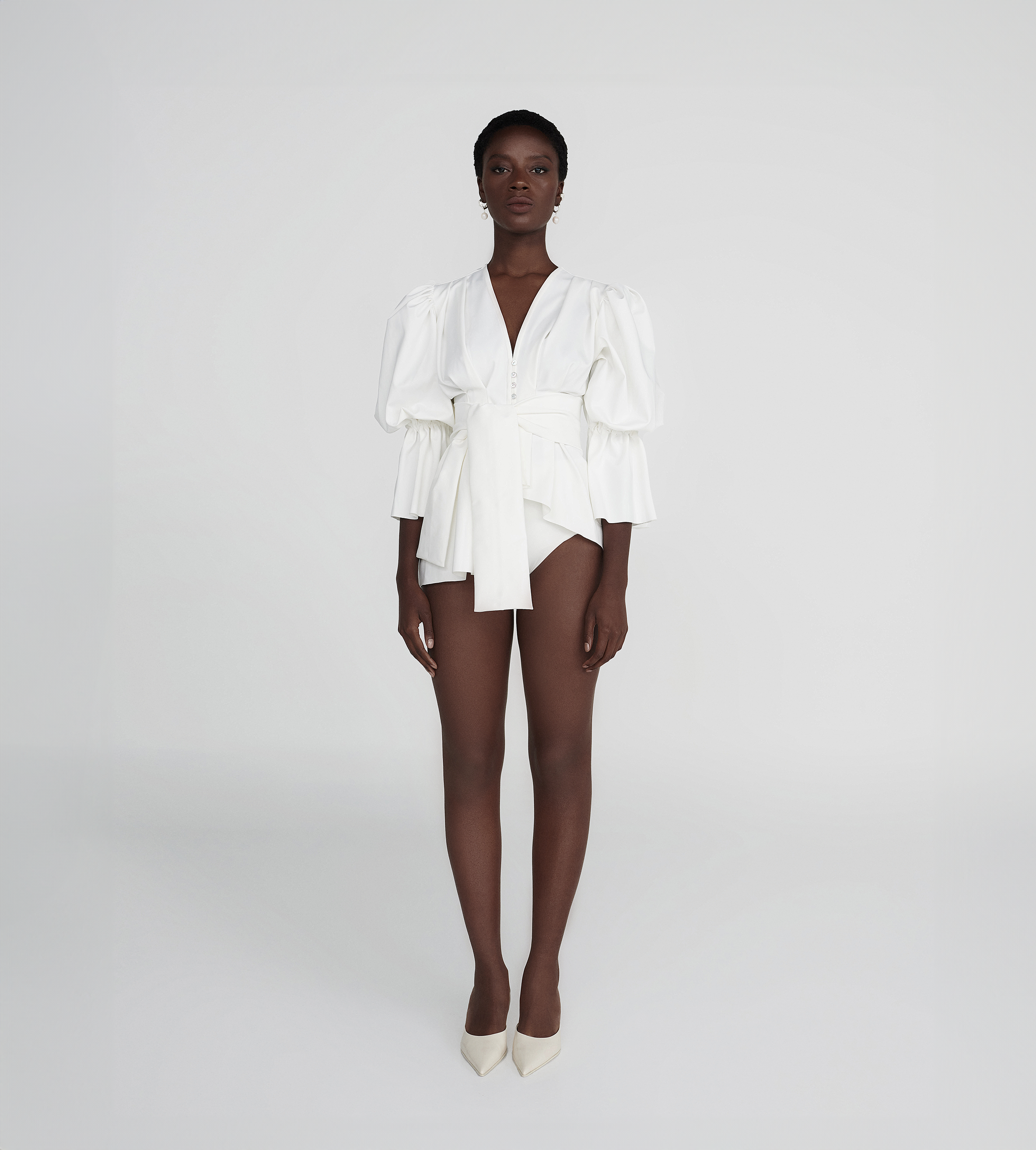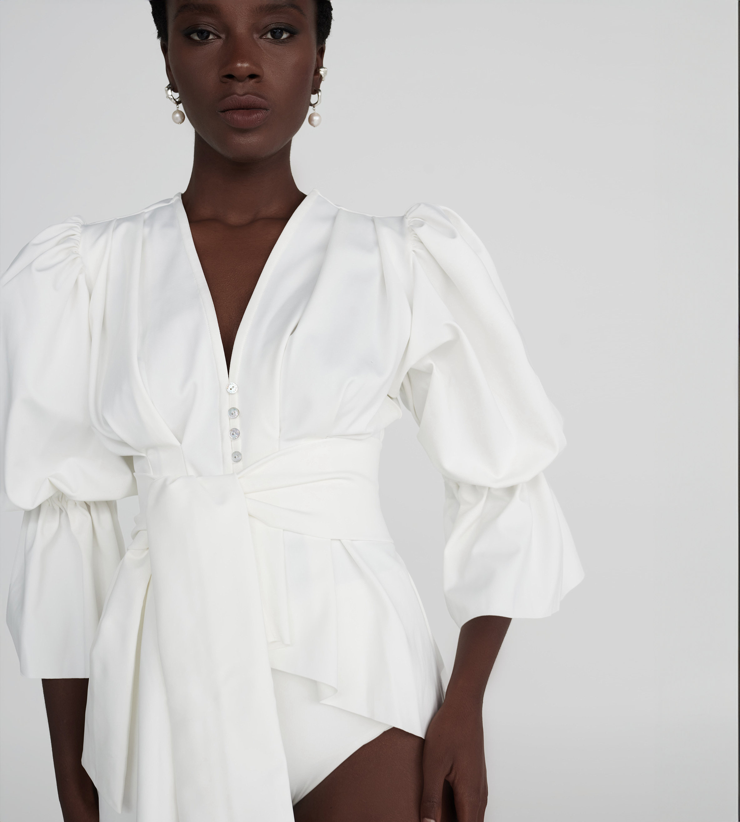 High-waisted two-piece swimsuit with a deep plunge neck top with pleated detail and frontal button closure with waist belt. Bell sleeves with ruched details over the shoulders and around the elbows.