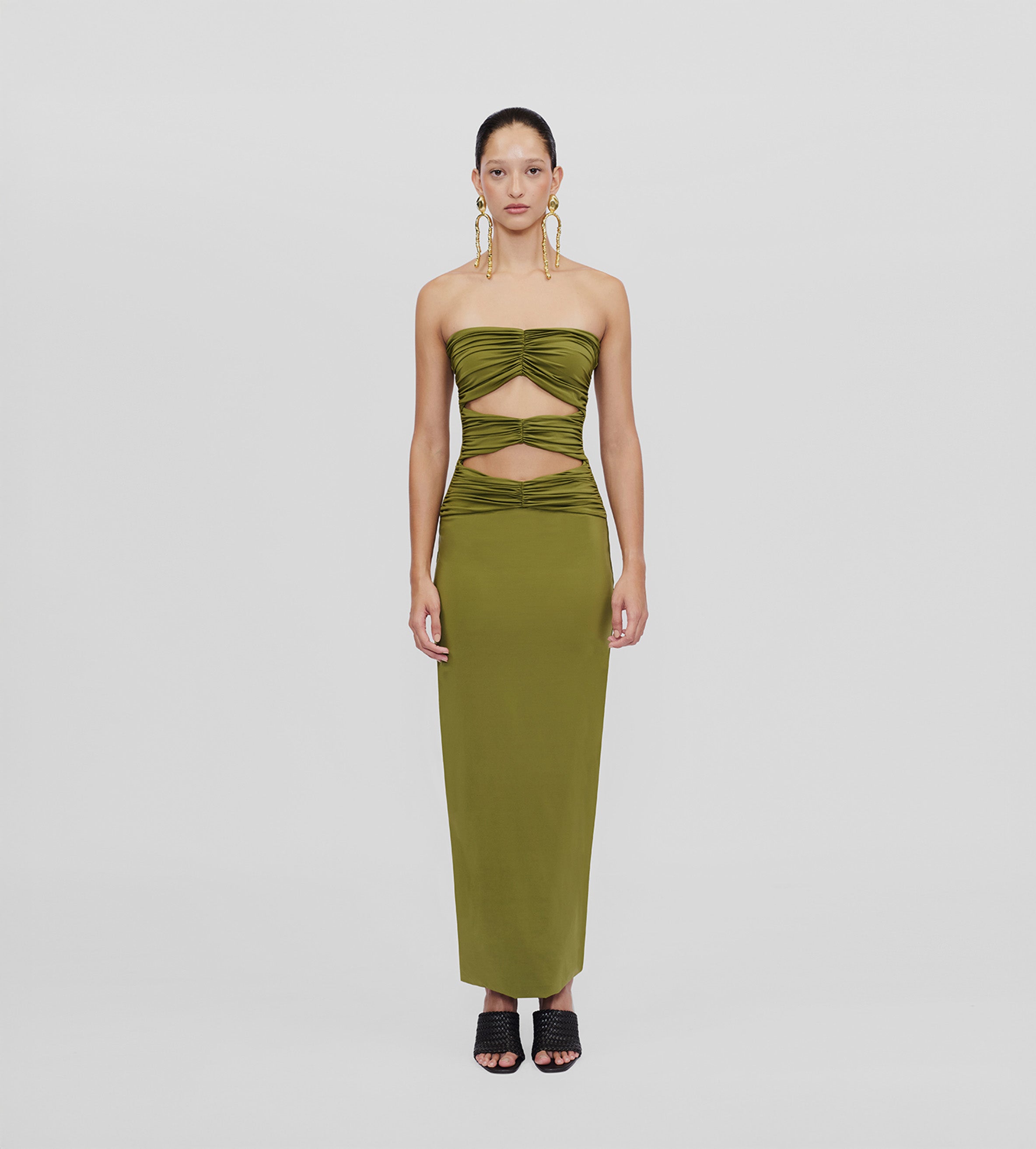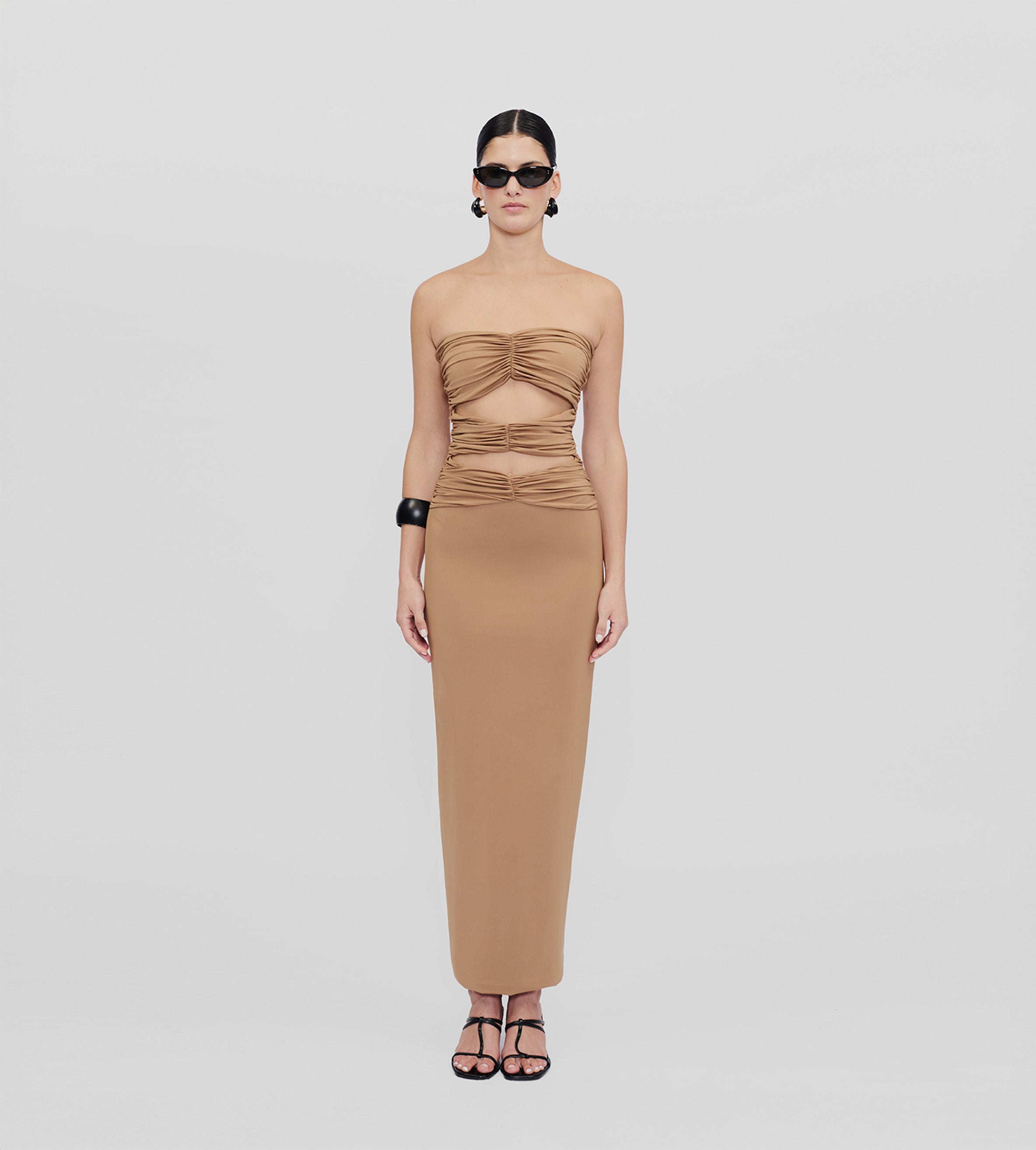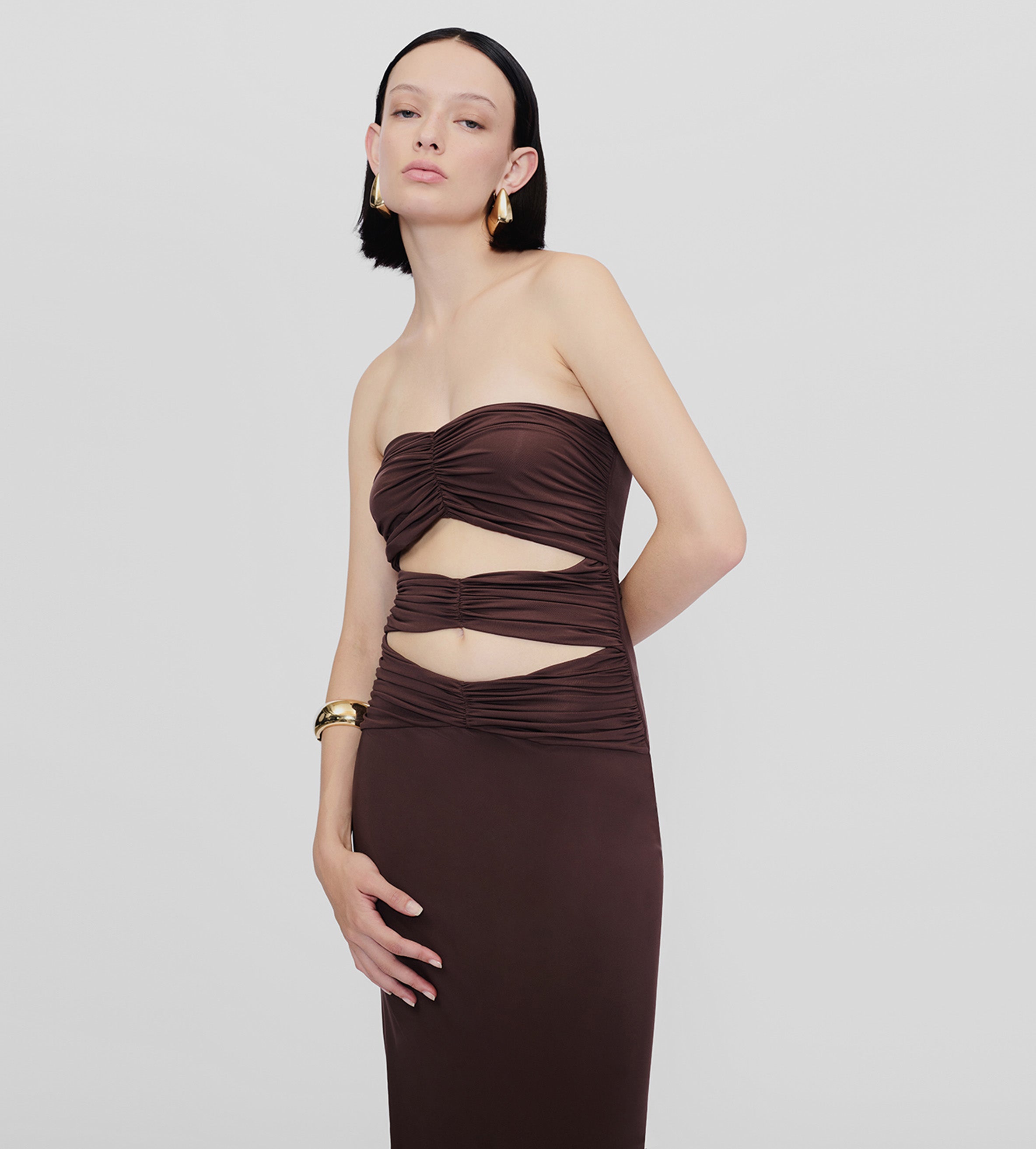 Holiday Capsule exclusive piece. Bodycon dress with a strapless neckline, abdomen cut outs and frontal ruched details.