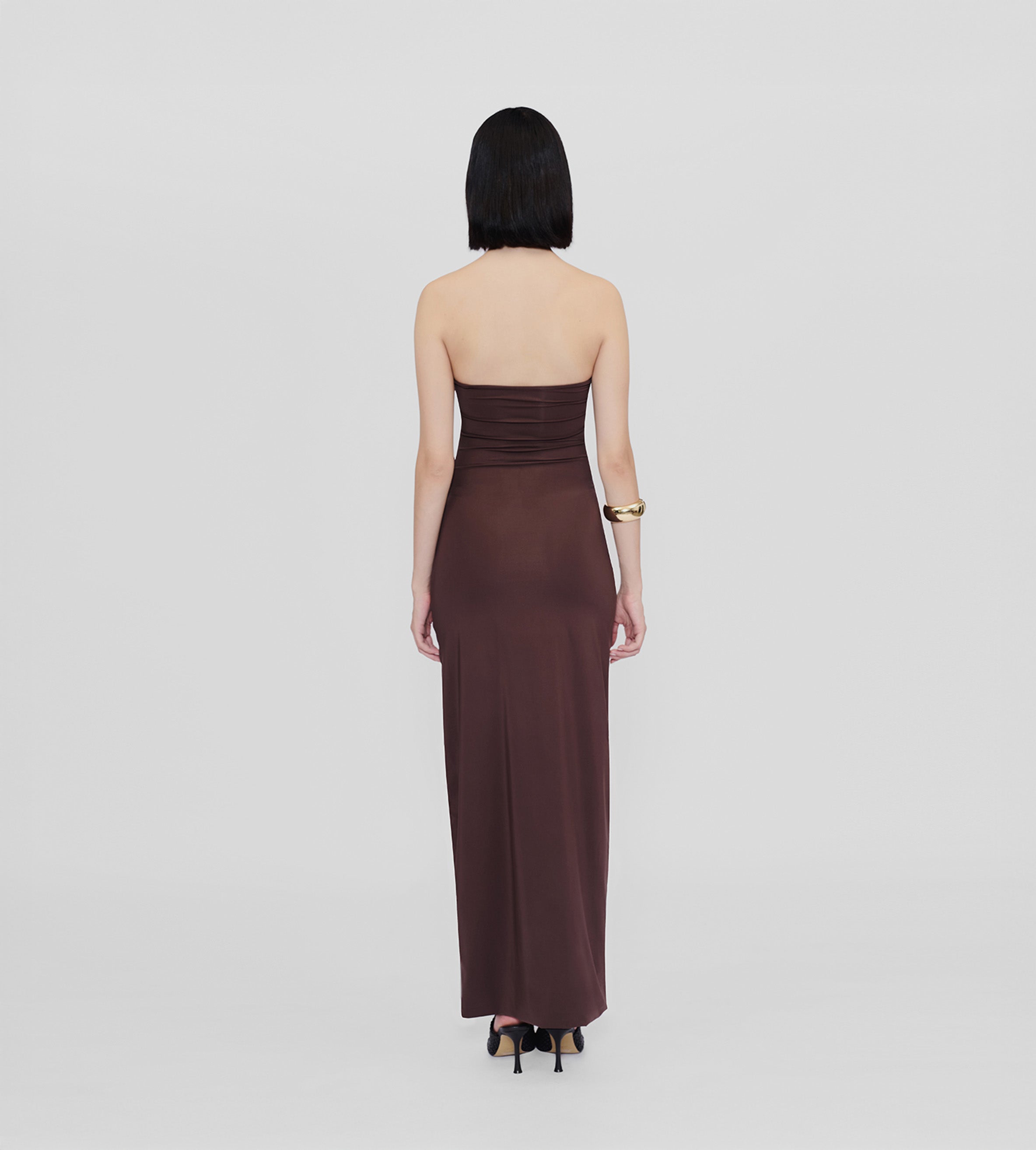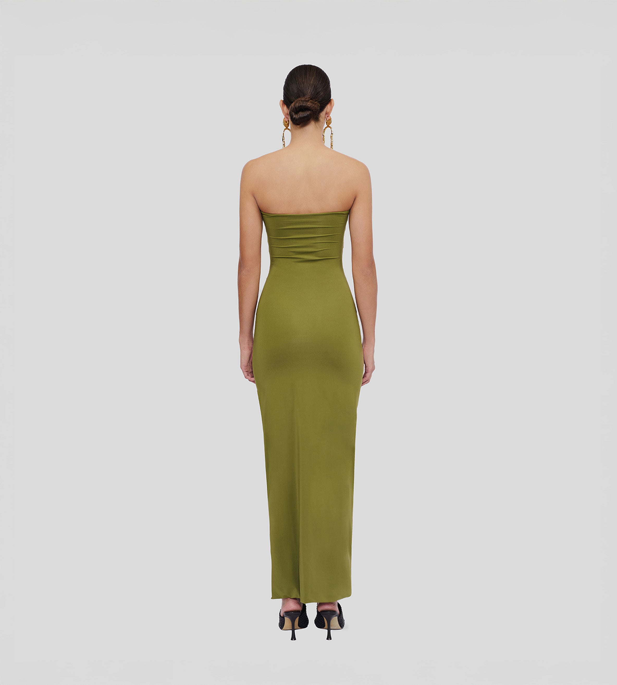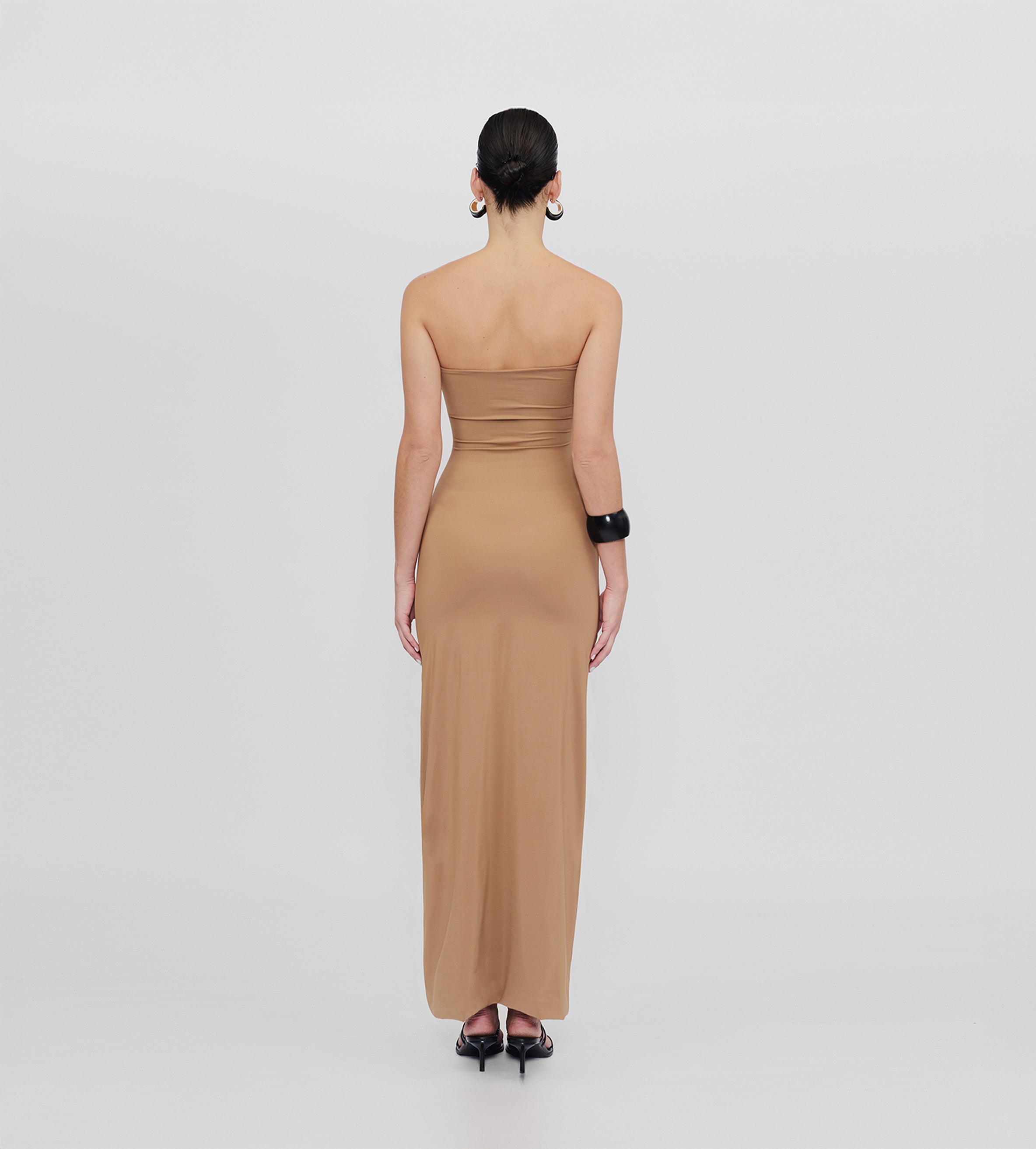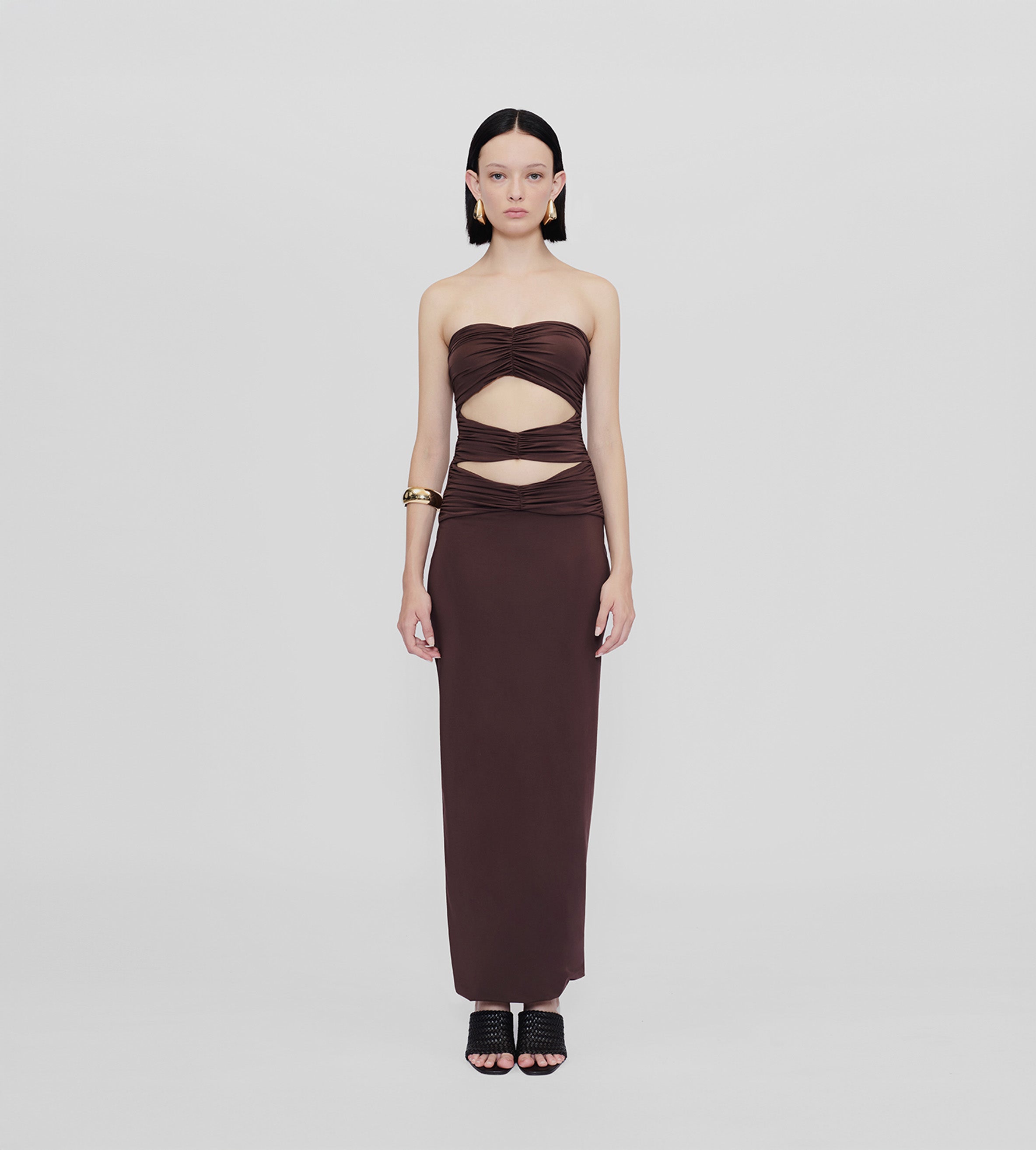 Holiday Capsule exclusive piece. Bodycon dress with a strapless neckline, abdomen cut outs and frontal ruched details.