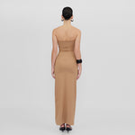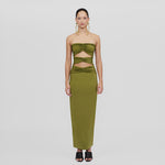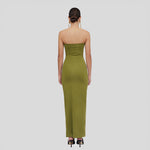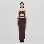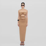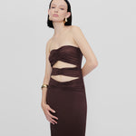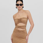 Holiday Capsule exclusive piece. Bodycon dress with a strapless neckline, abdomen cut outs and frontal ruched details.