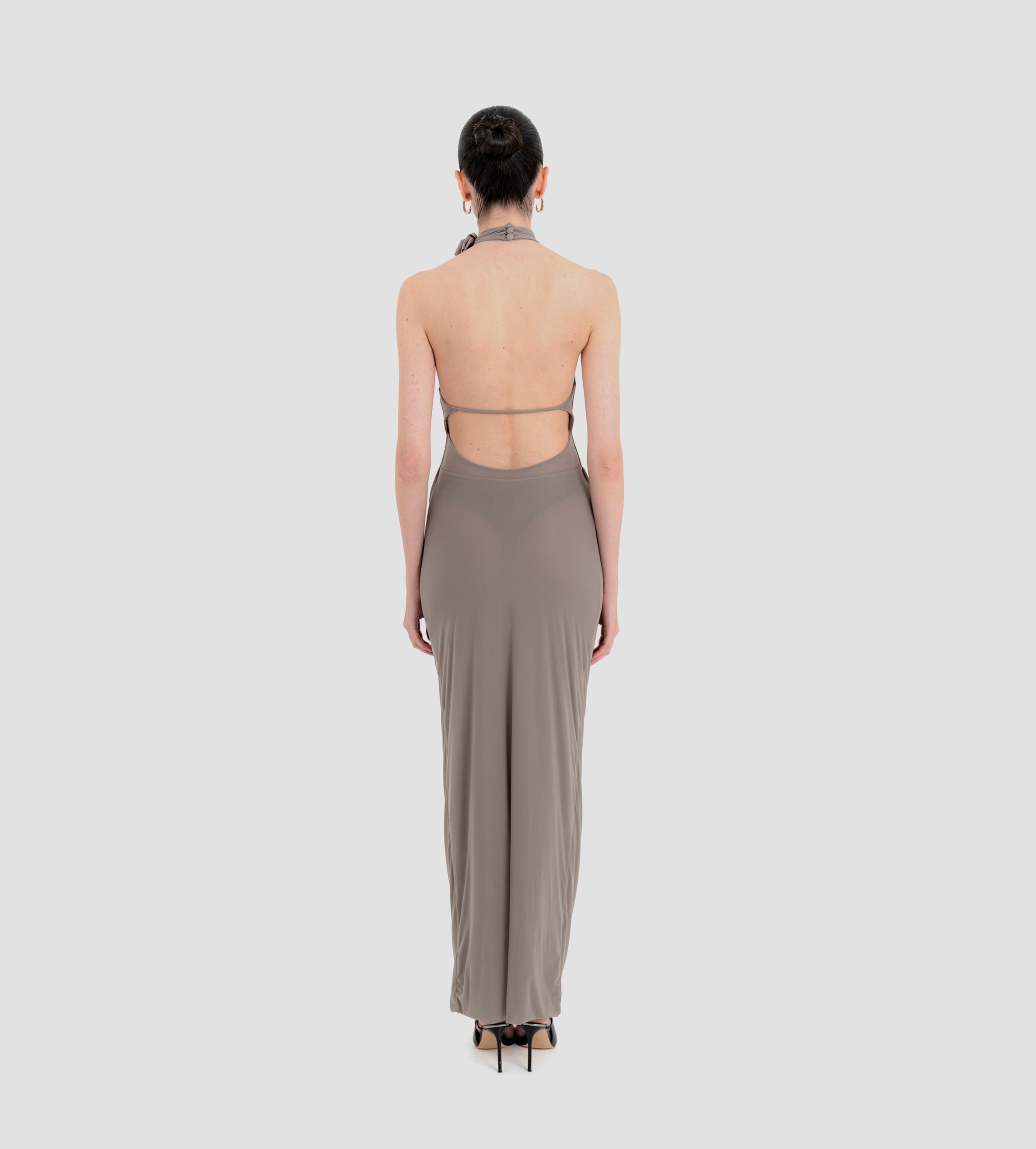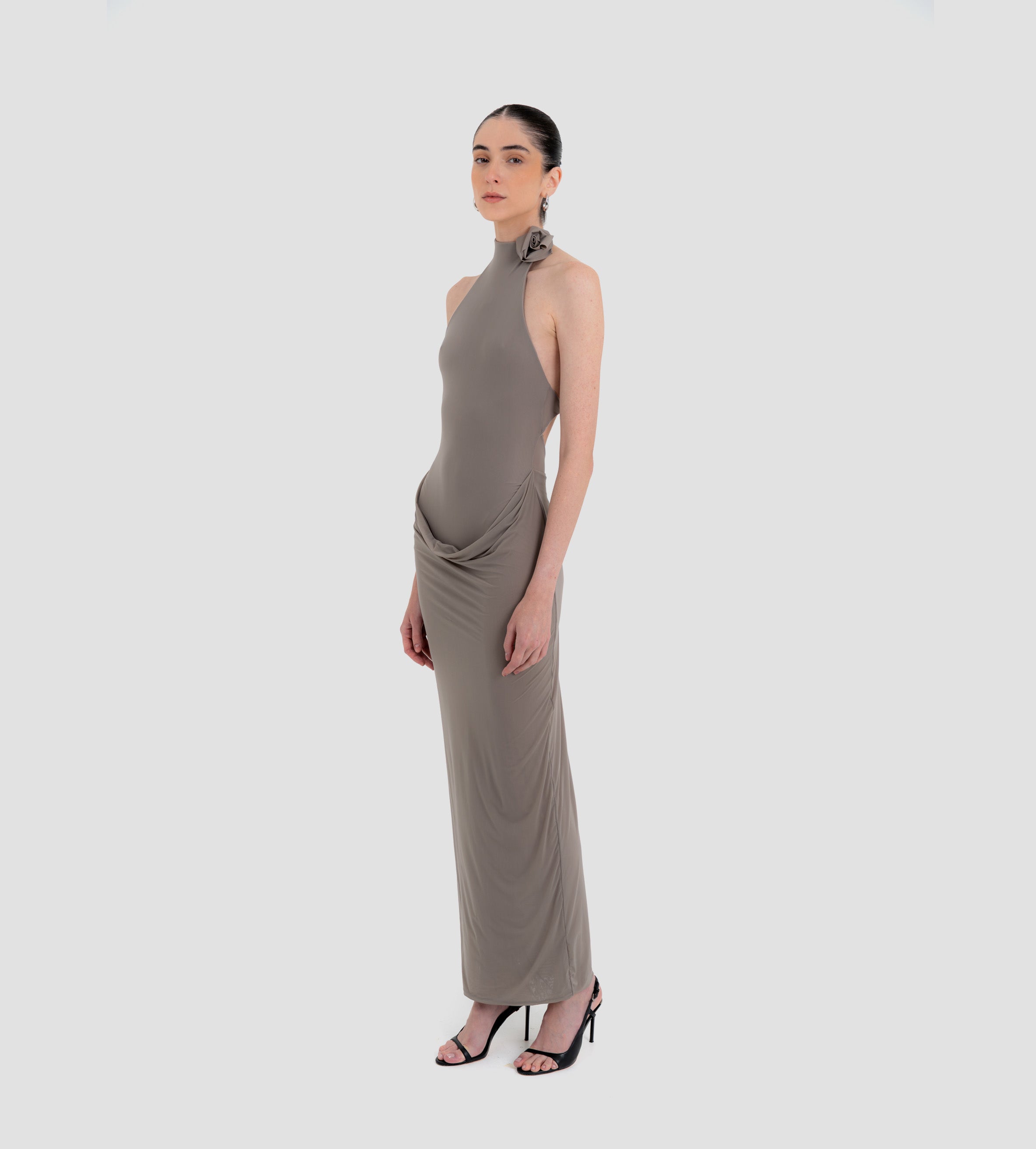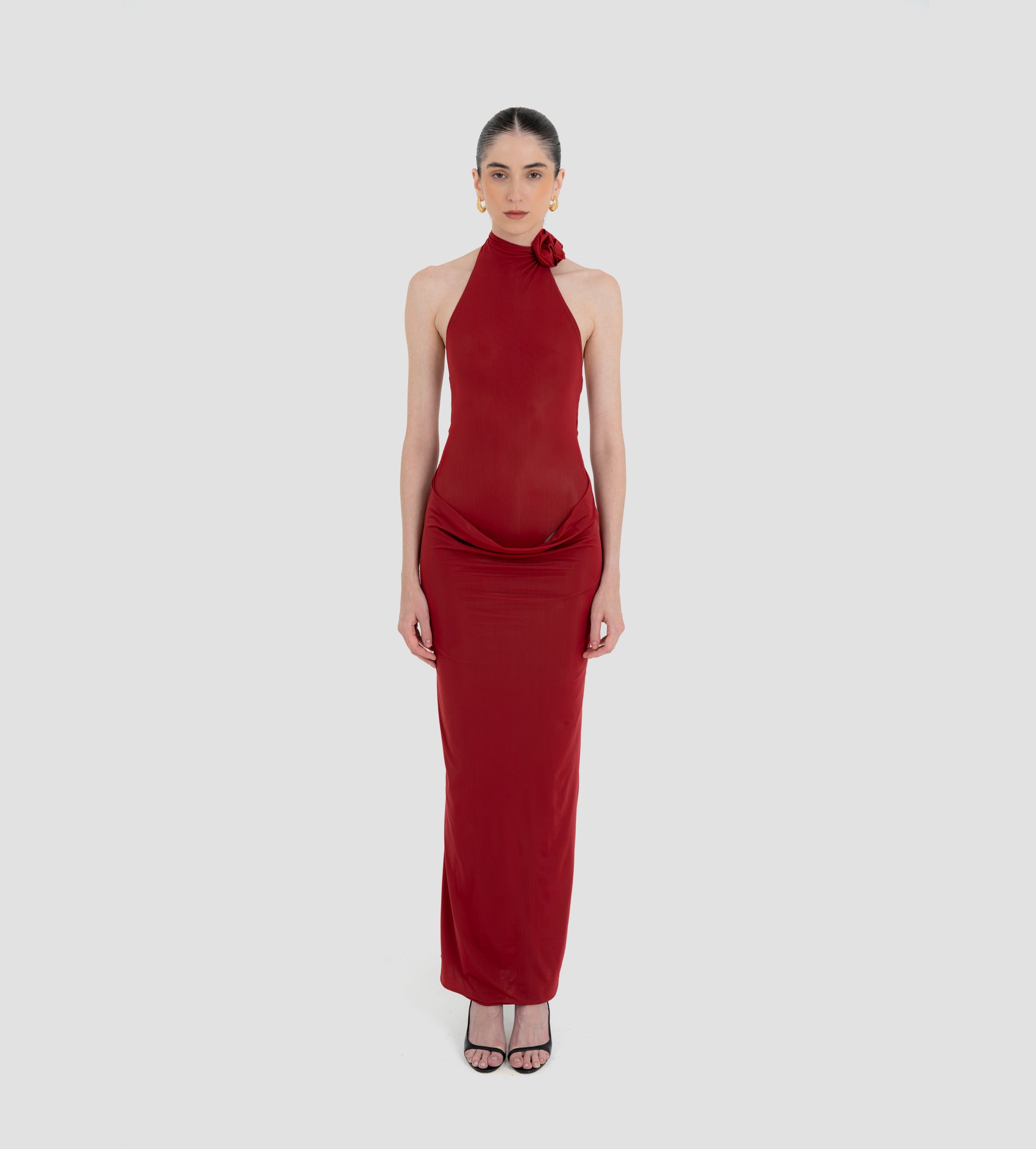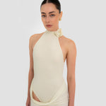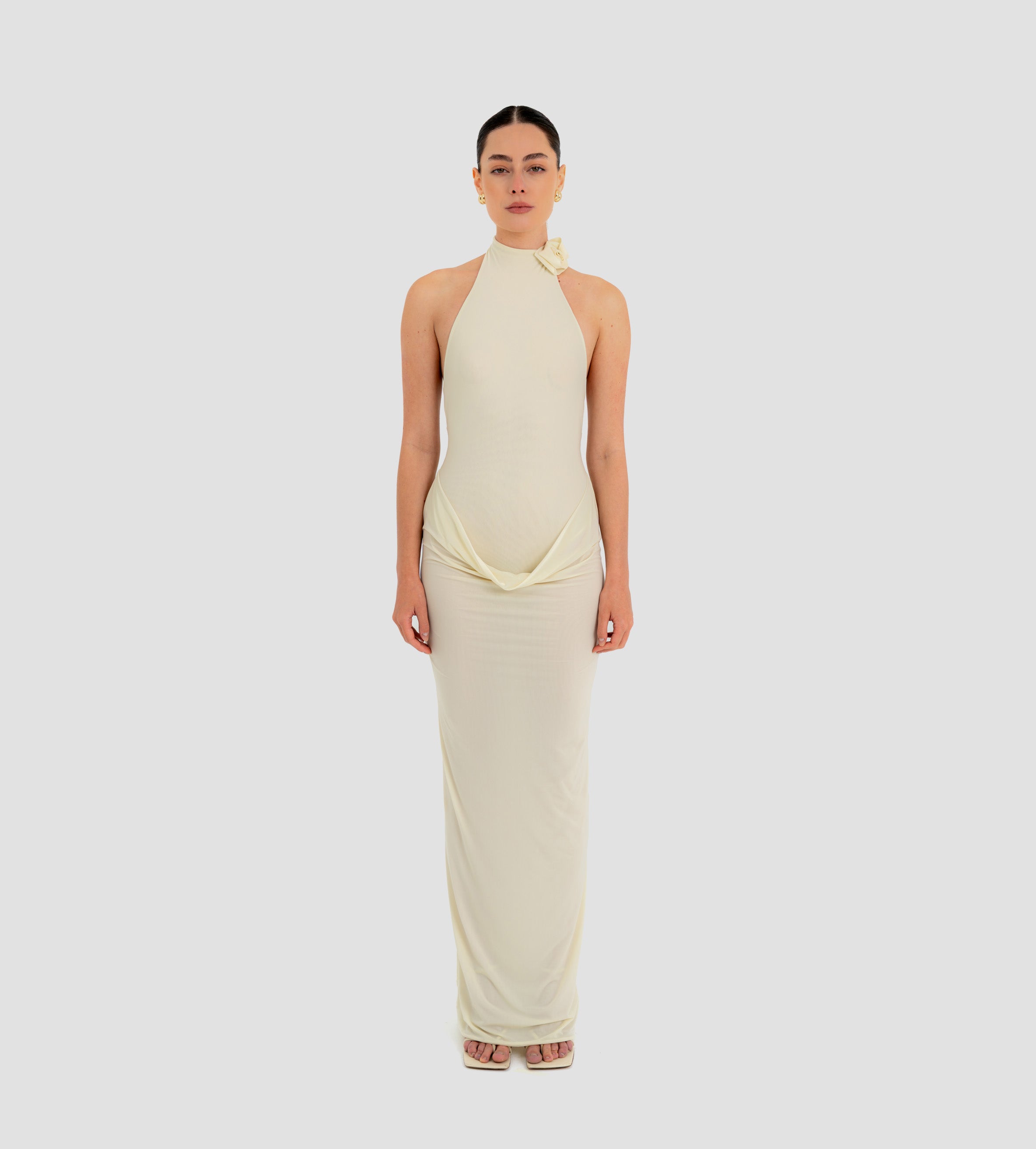 The Farol long dress made from our iconic translucent lycra, features an elegant halter neckline adorned with a beautifully crafted 3D floral detail and finished with covered buttons at the back. The silhouette flows into a second-skin bodysuit with a sensual, ultra-low open back. At the waist, a draped layer creates a subtle cowl effect, cascading effortlessly into a long, column-style skirt.