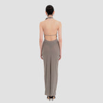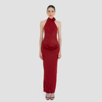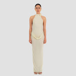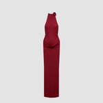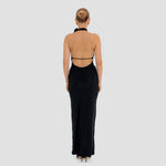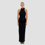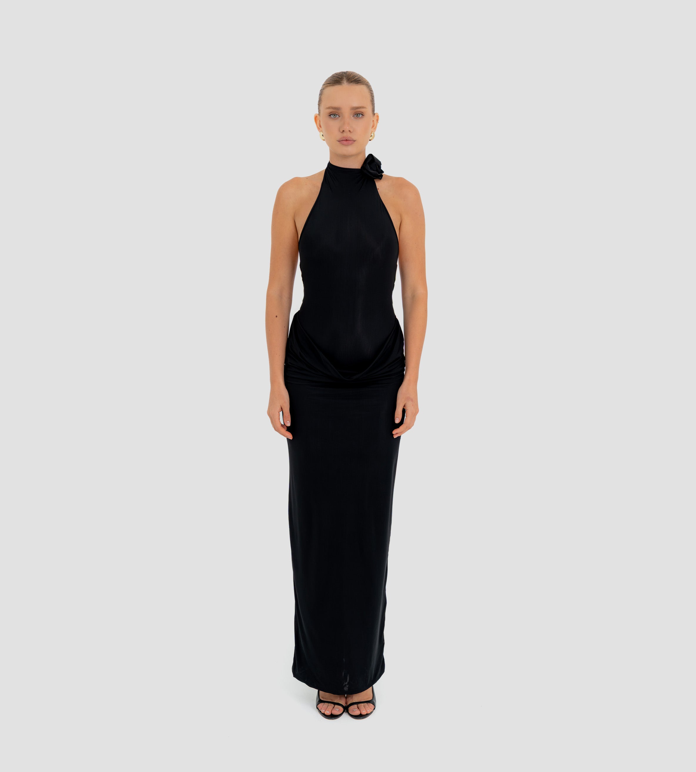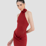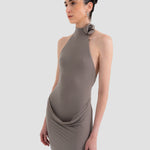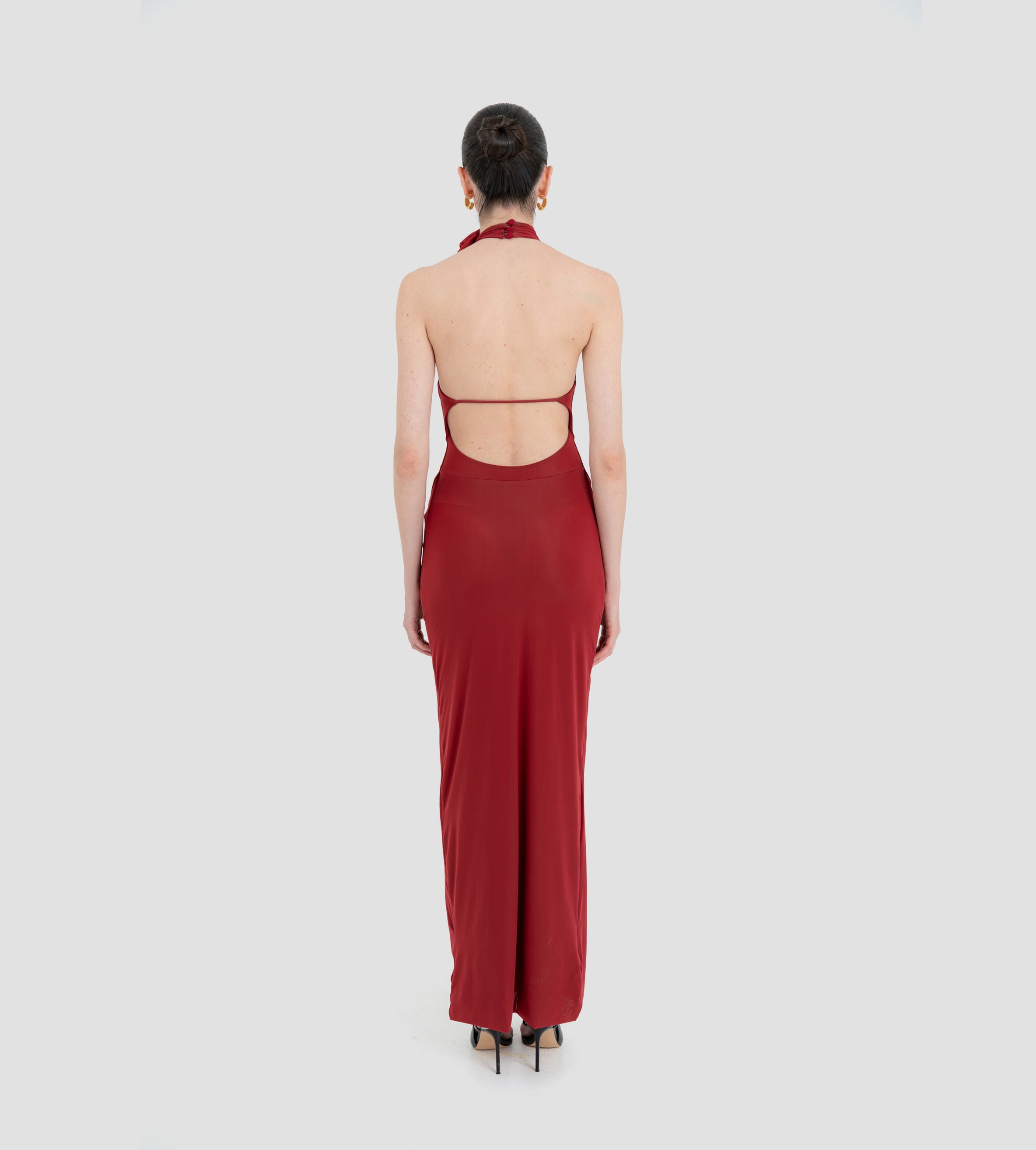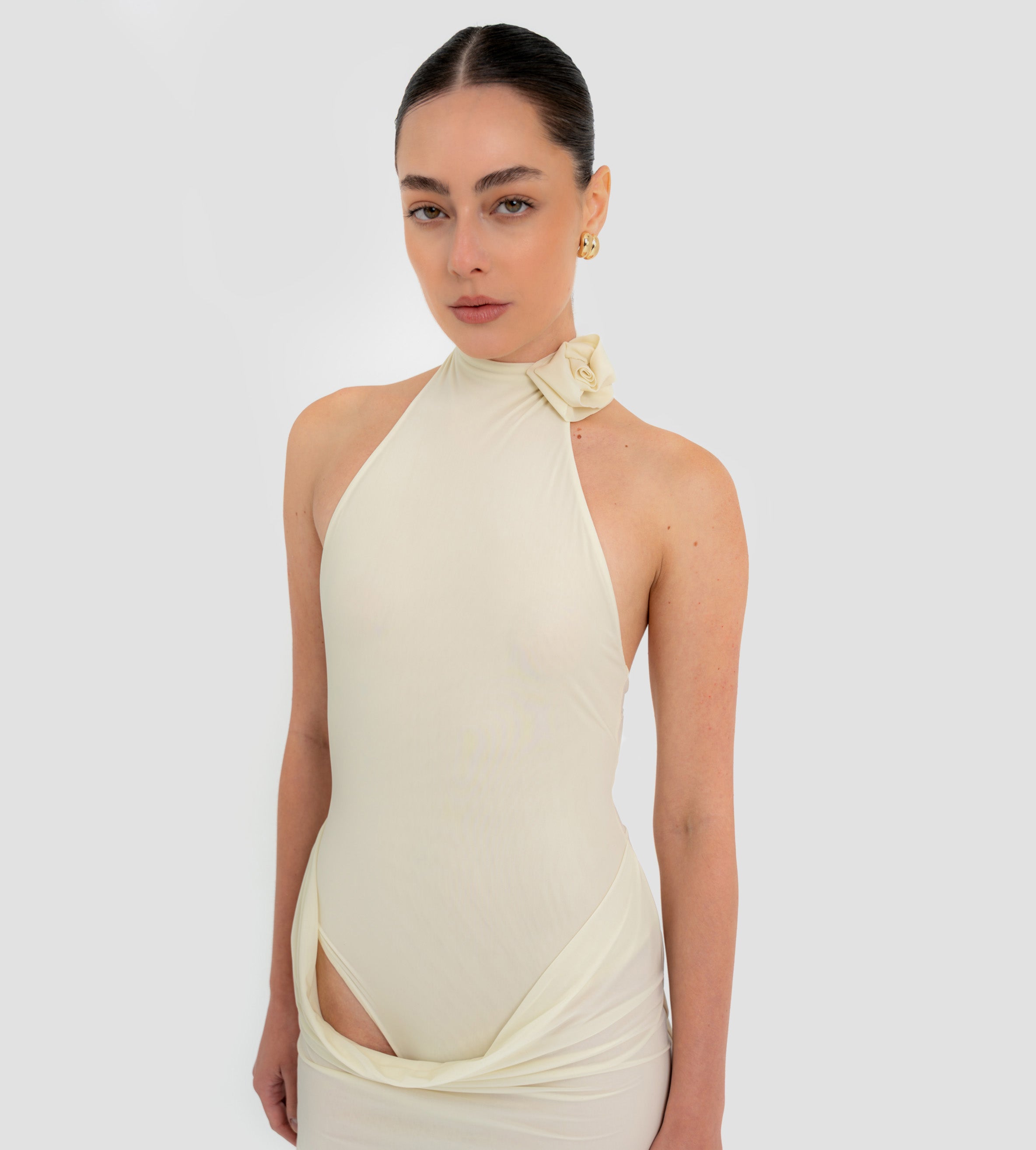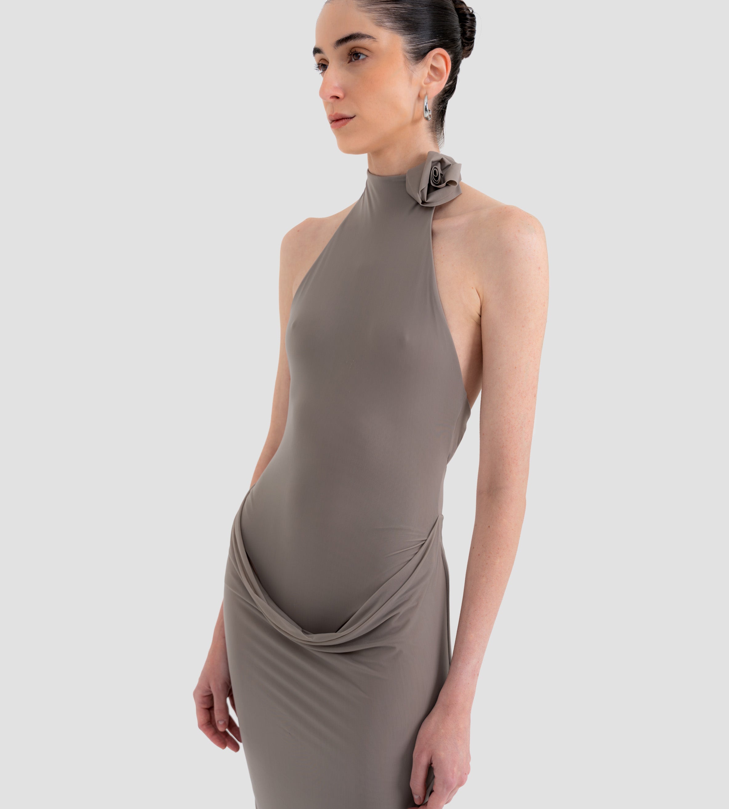 The Farol long dress made from our iconic translucent lycra, features an elegant halter neckline adorned with a beautifully crafted 3D floral detail and finished with covered buttons at the back. The silhouette flows into a second-skin bodysuit with a sensual, ultra-low open back. At the waist, a draped layer creates a subtle cowl effect, cascading effortlessly into a long, column-style skirt.