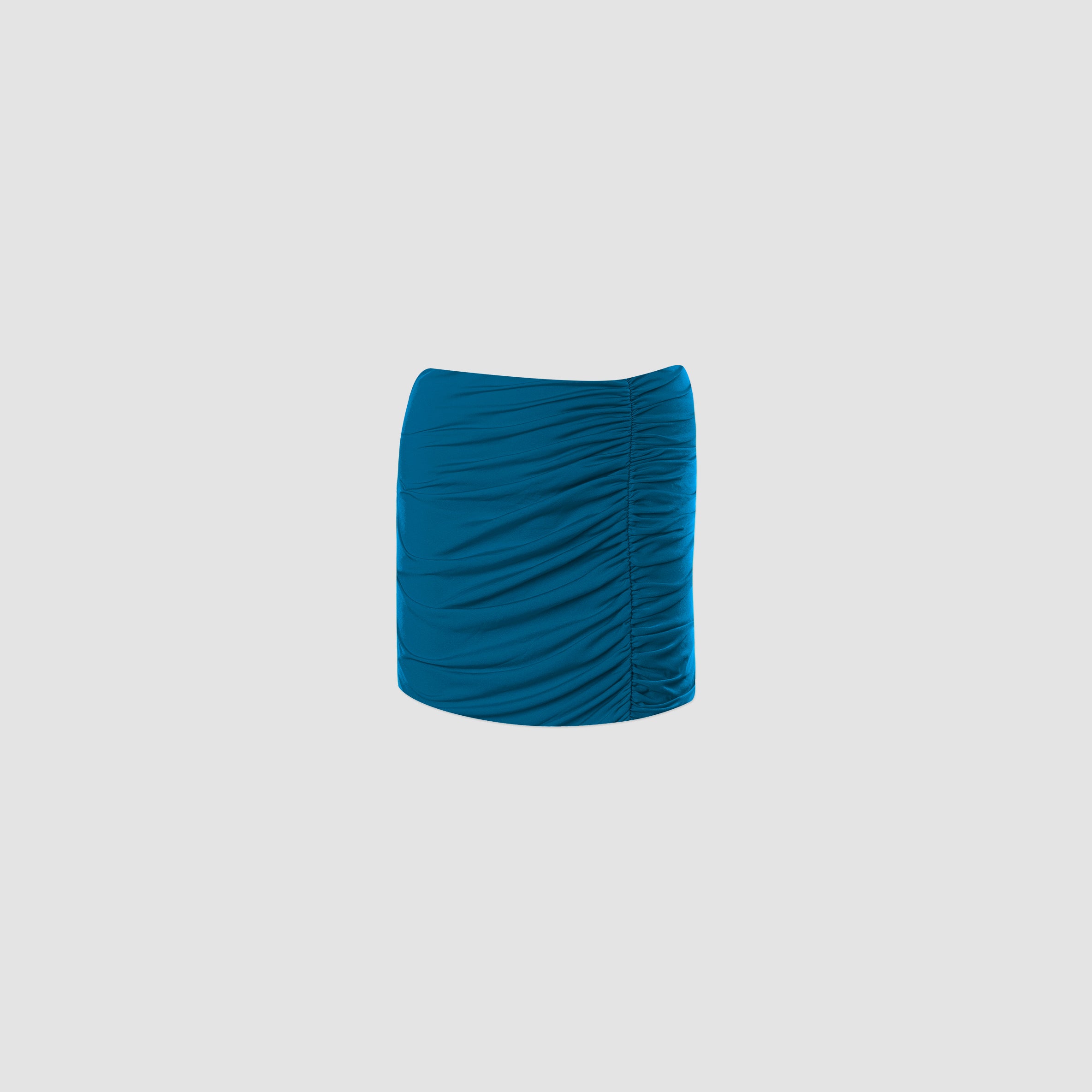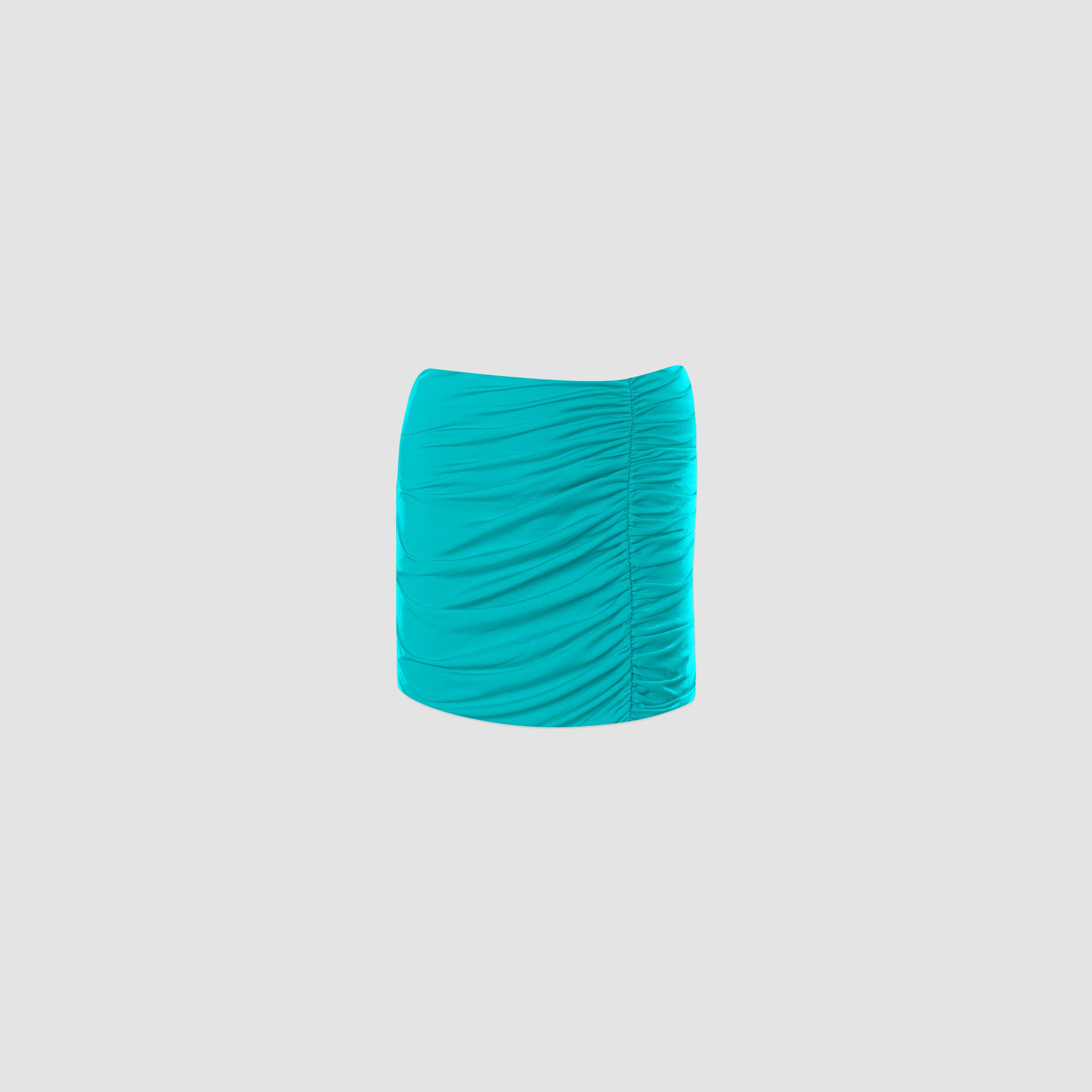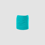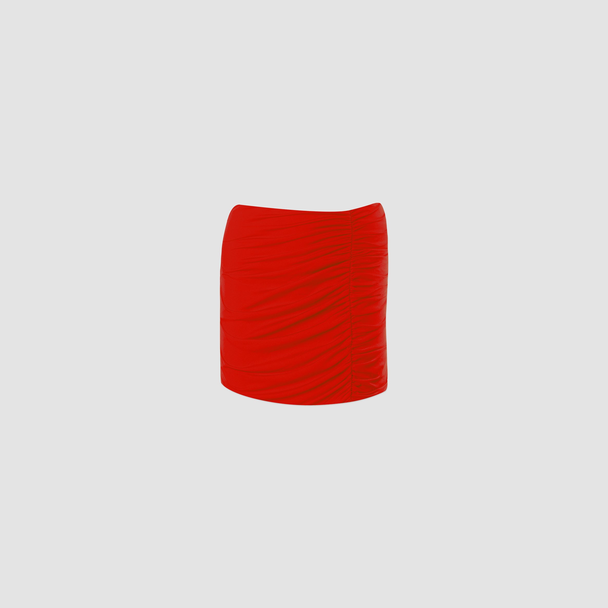 A mini skirt with a fitted cut and a flattering silhouette. It features a modern design with side ruching that creates a draped effect.