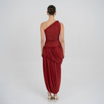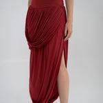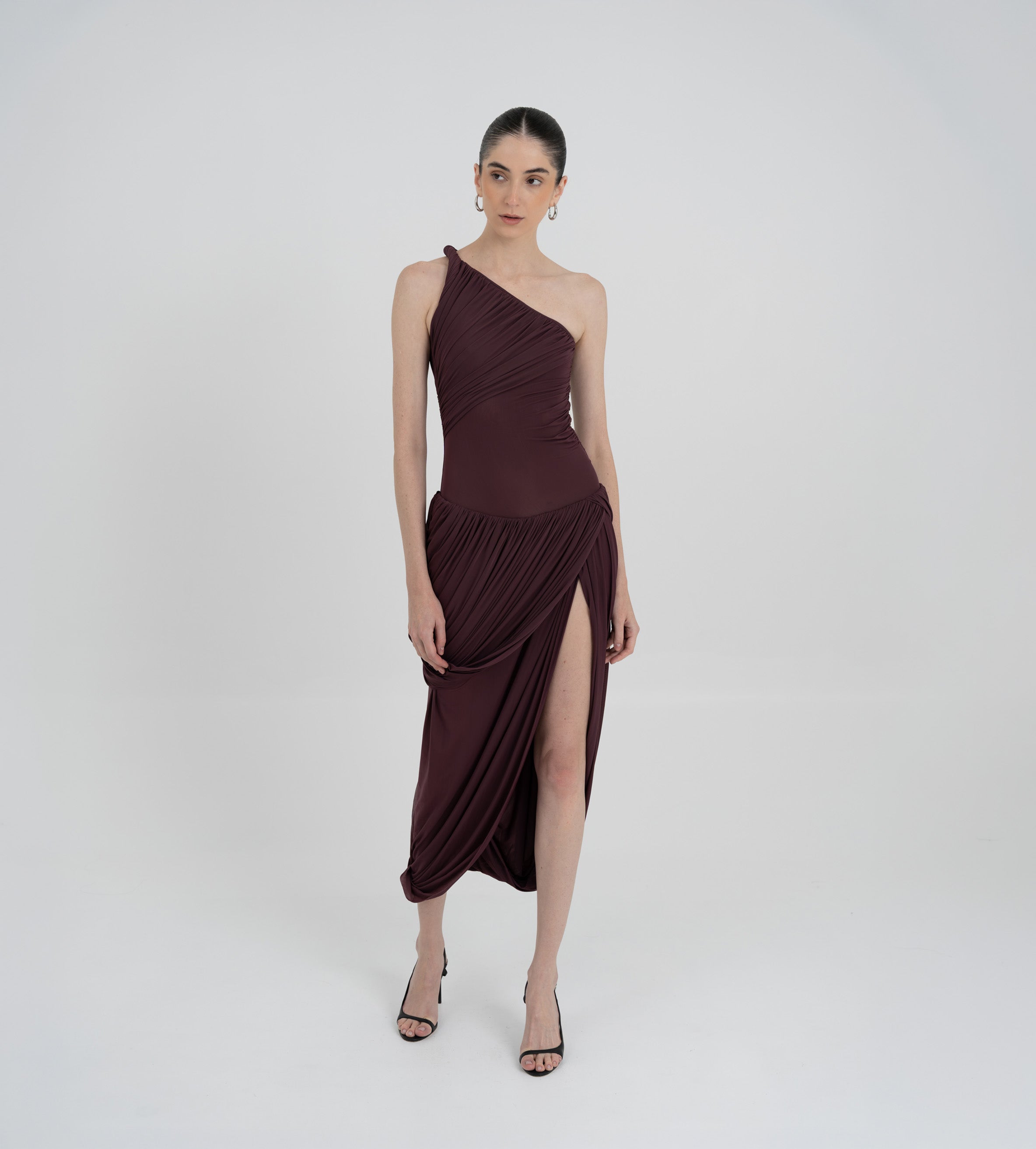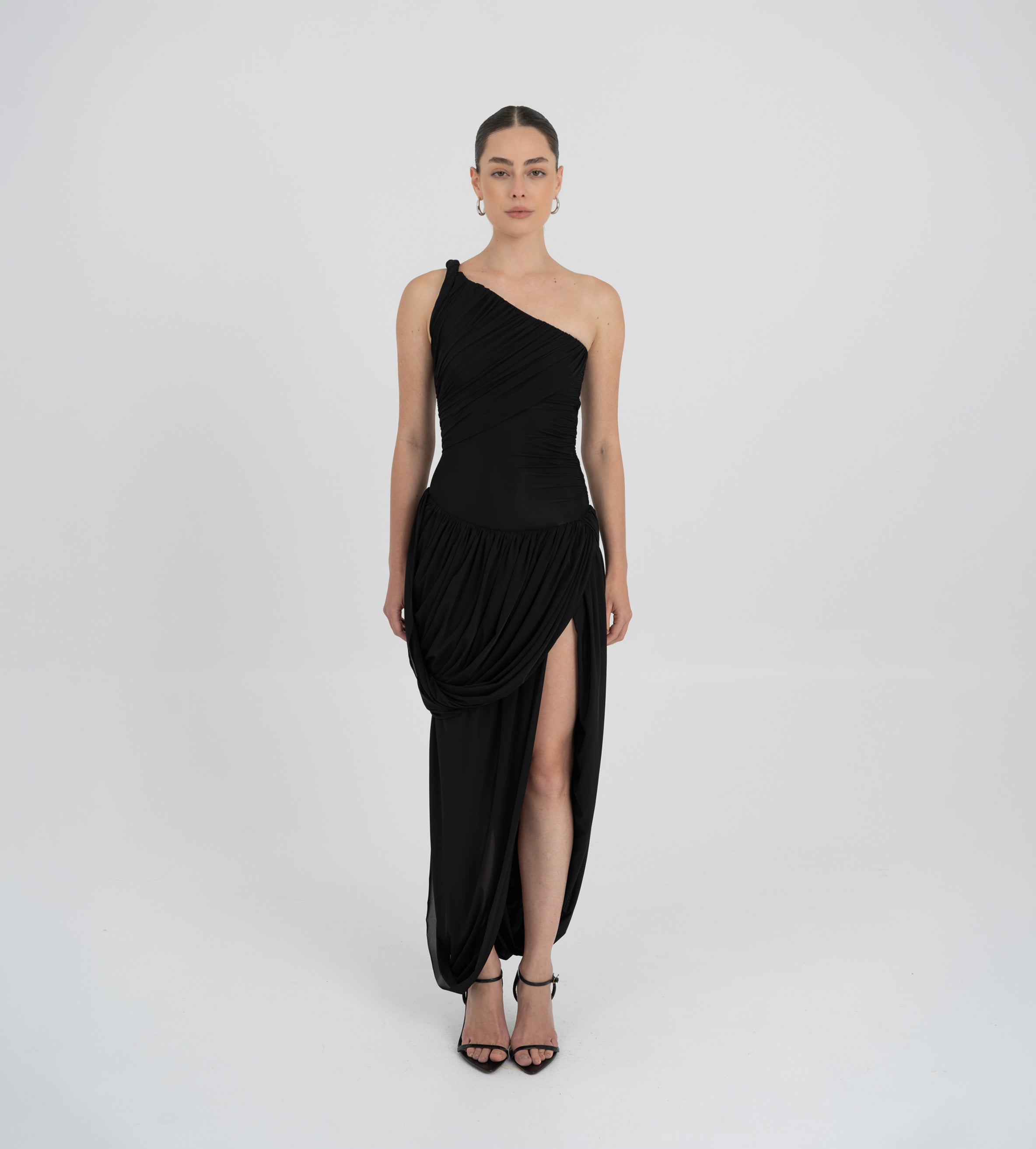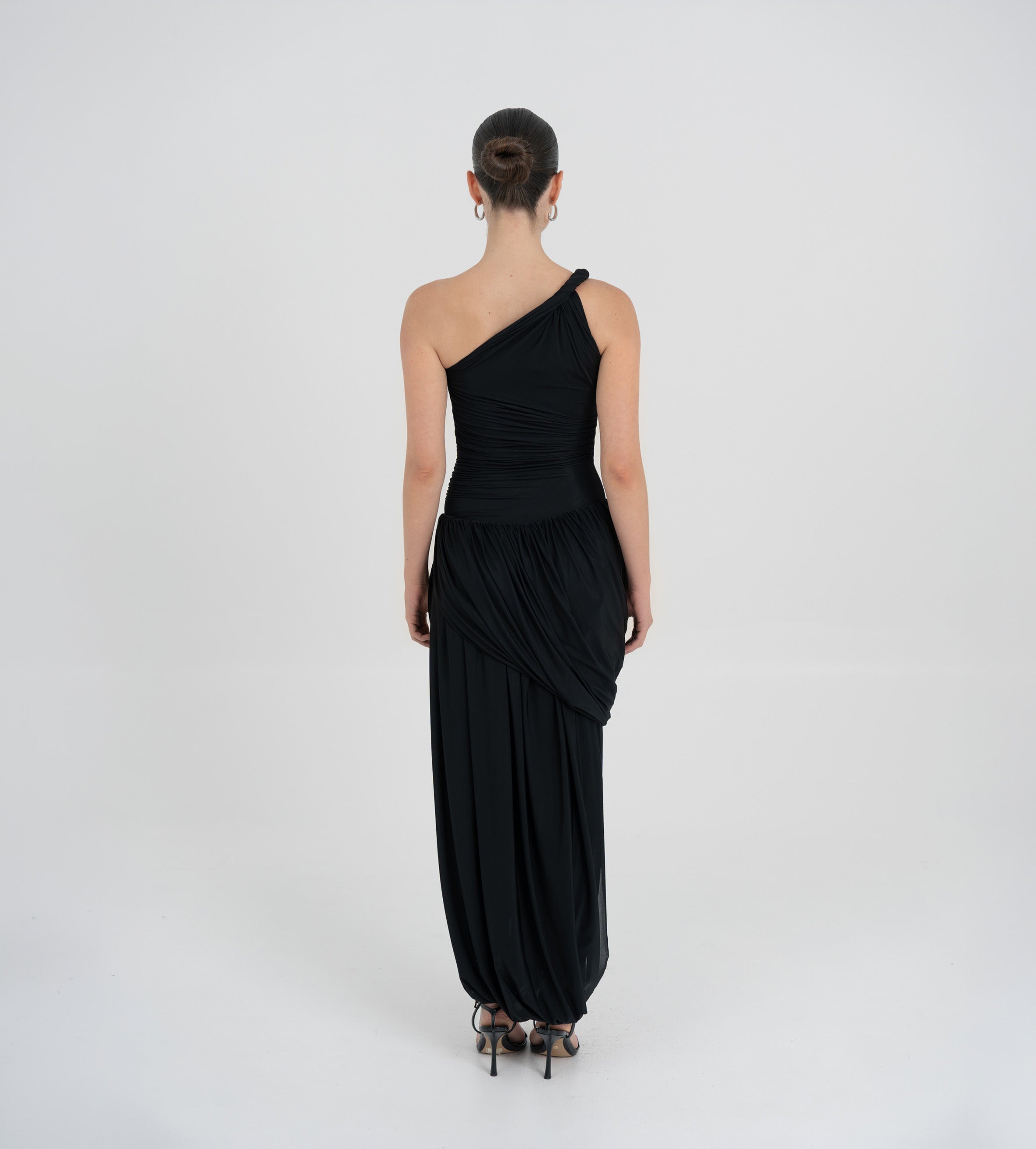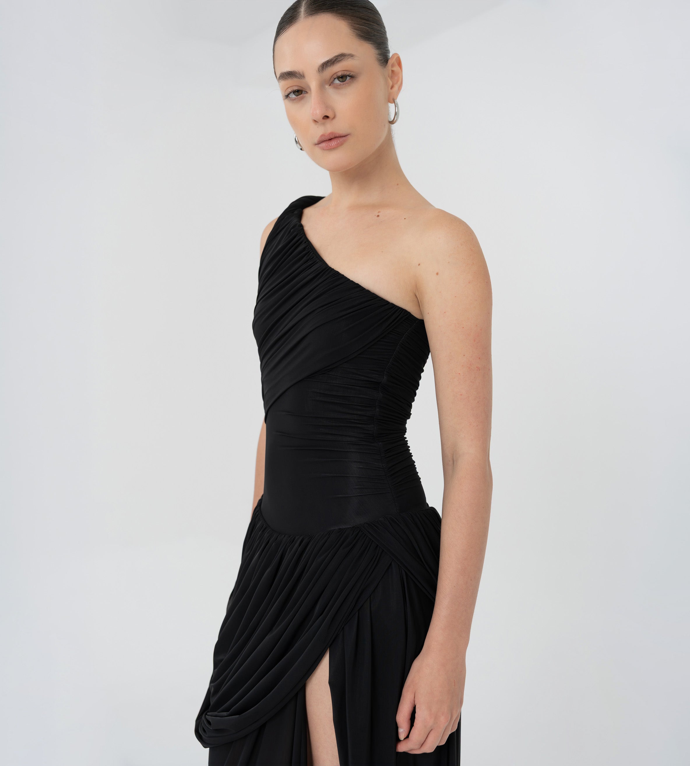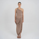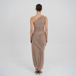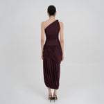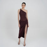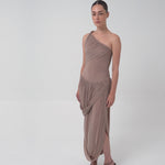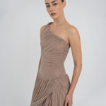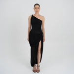 The Getsemani long dress showcases a sculptural design defined by a one-shoulder neckline and a twisted strap that flows into a bidirectional ruched bodice. A diagonal line at the hips reveals a dramatic, double-layer asymmetric skirt with twisted draping, creating depth, movement and a striking silhouette.