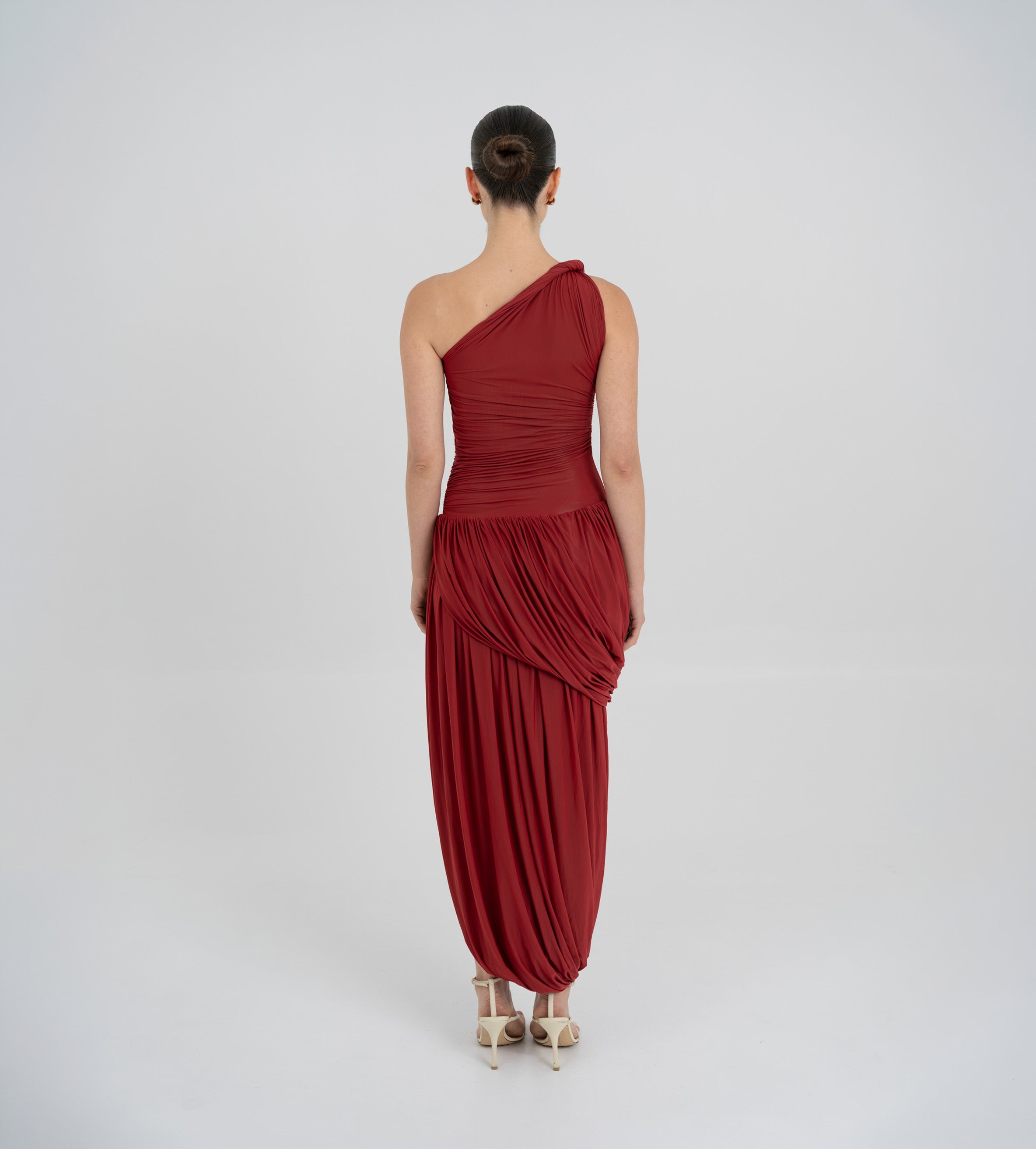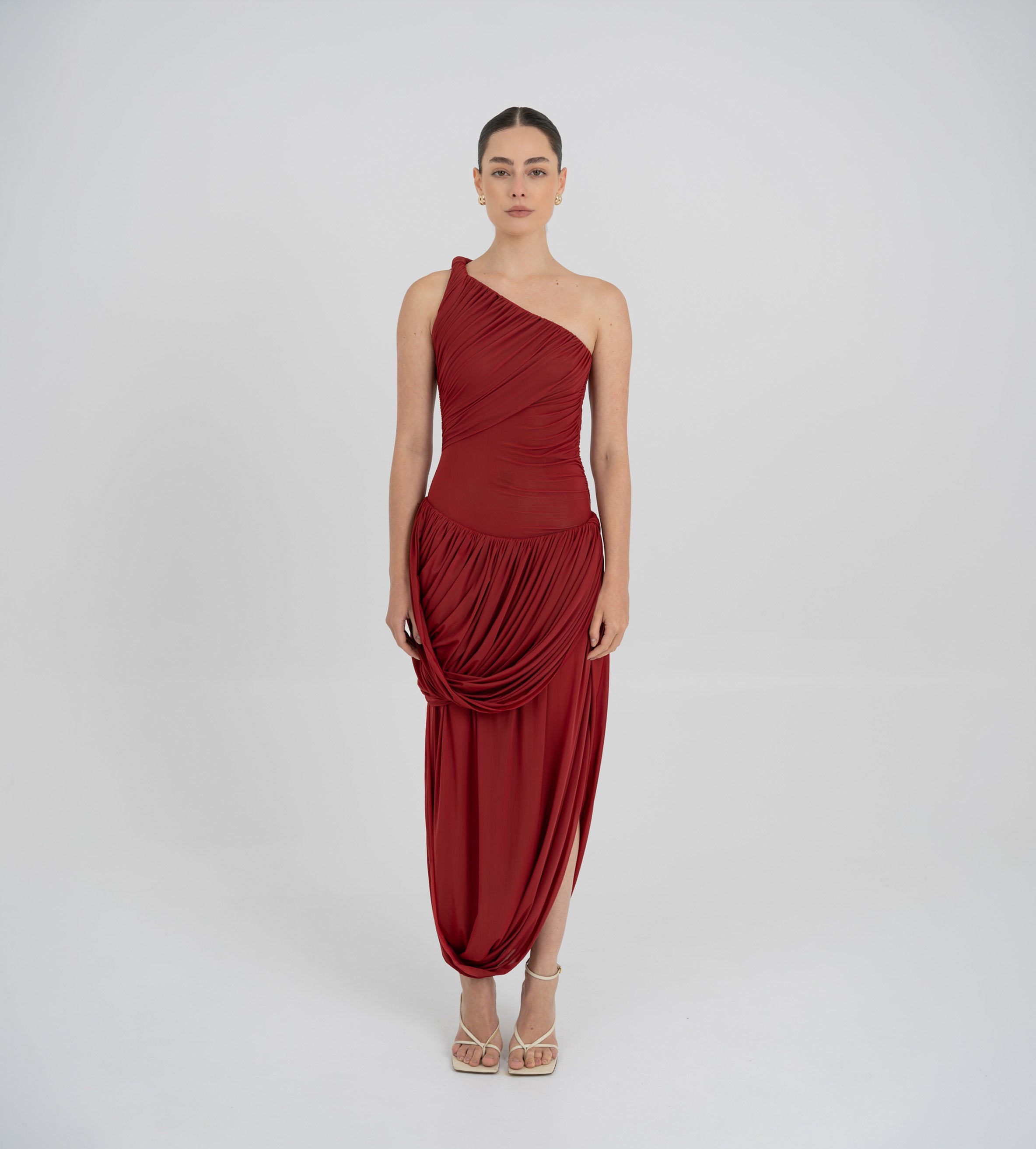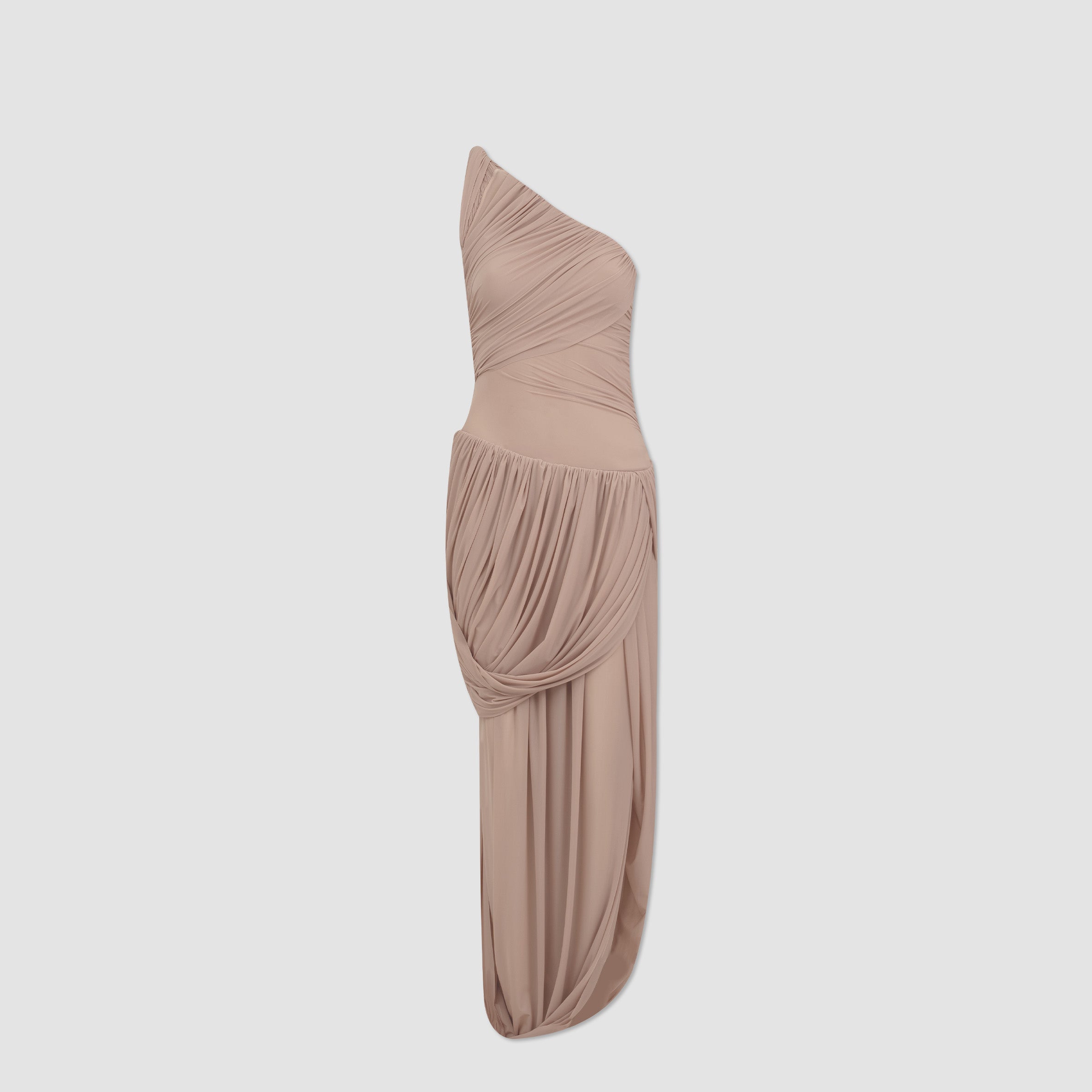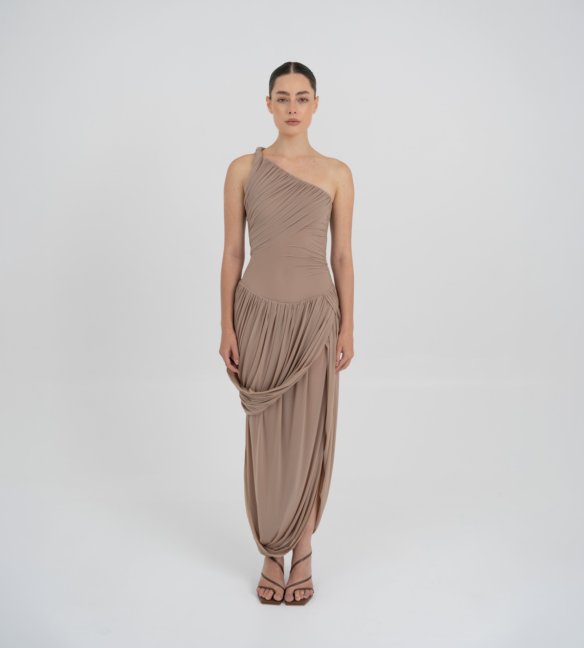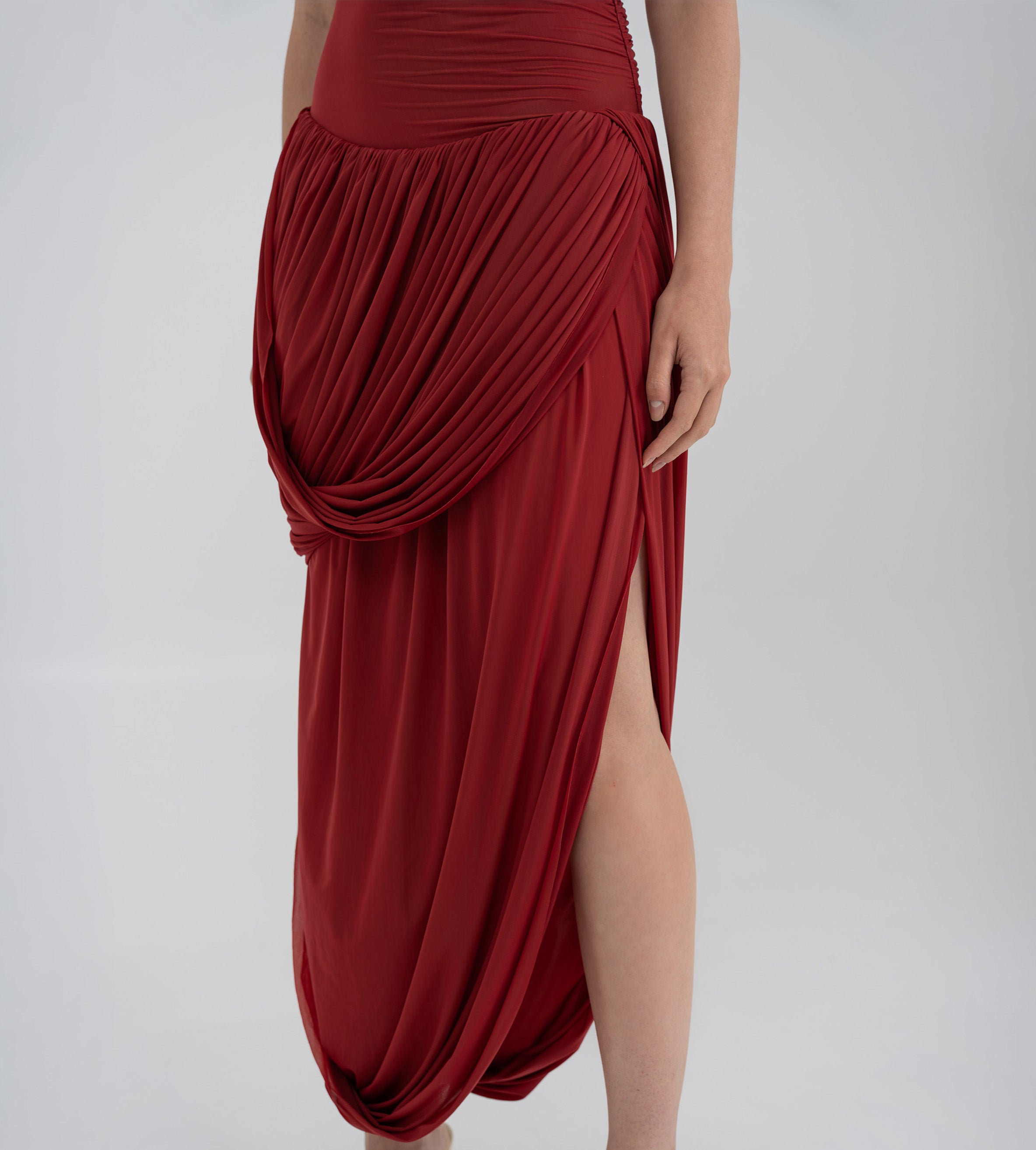 The Getsemani long dress showcases a sculptural design defined by a one-shoulder neckline and a twisted strap that flows into a bidirectional ruched bodice. A diagonal line at the hips reveals a dramatic, double-layer asymmetric skirt with twisted draping, creating depth, movement and a striking silhouette.