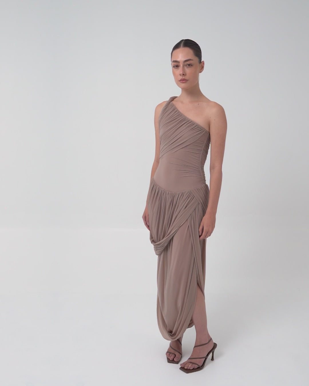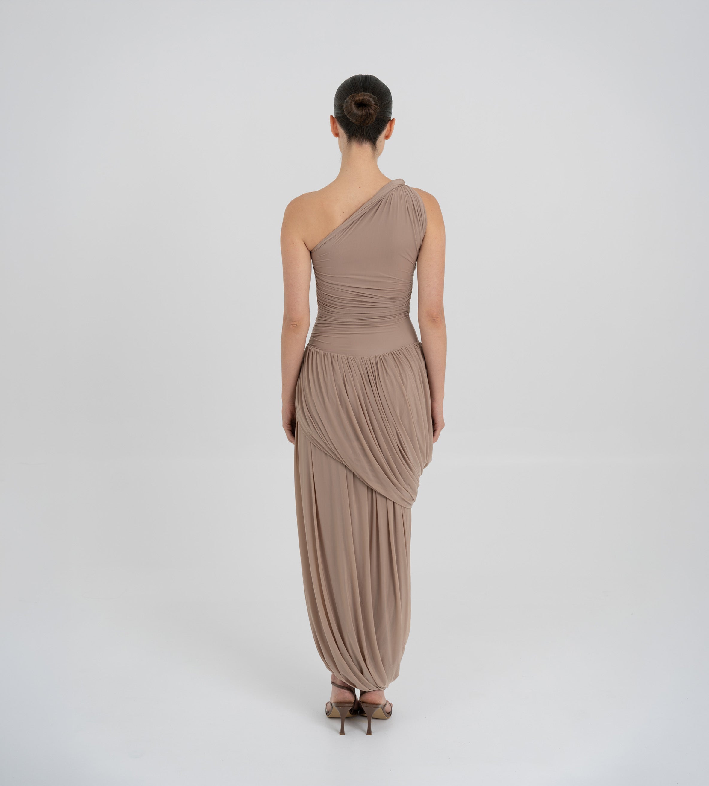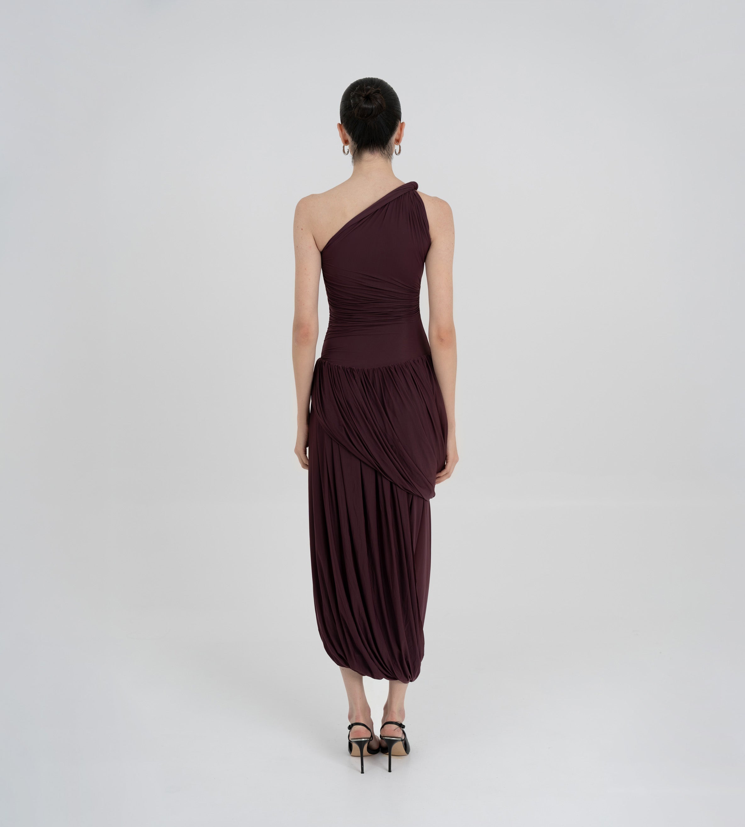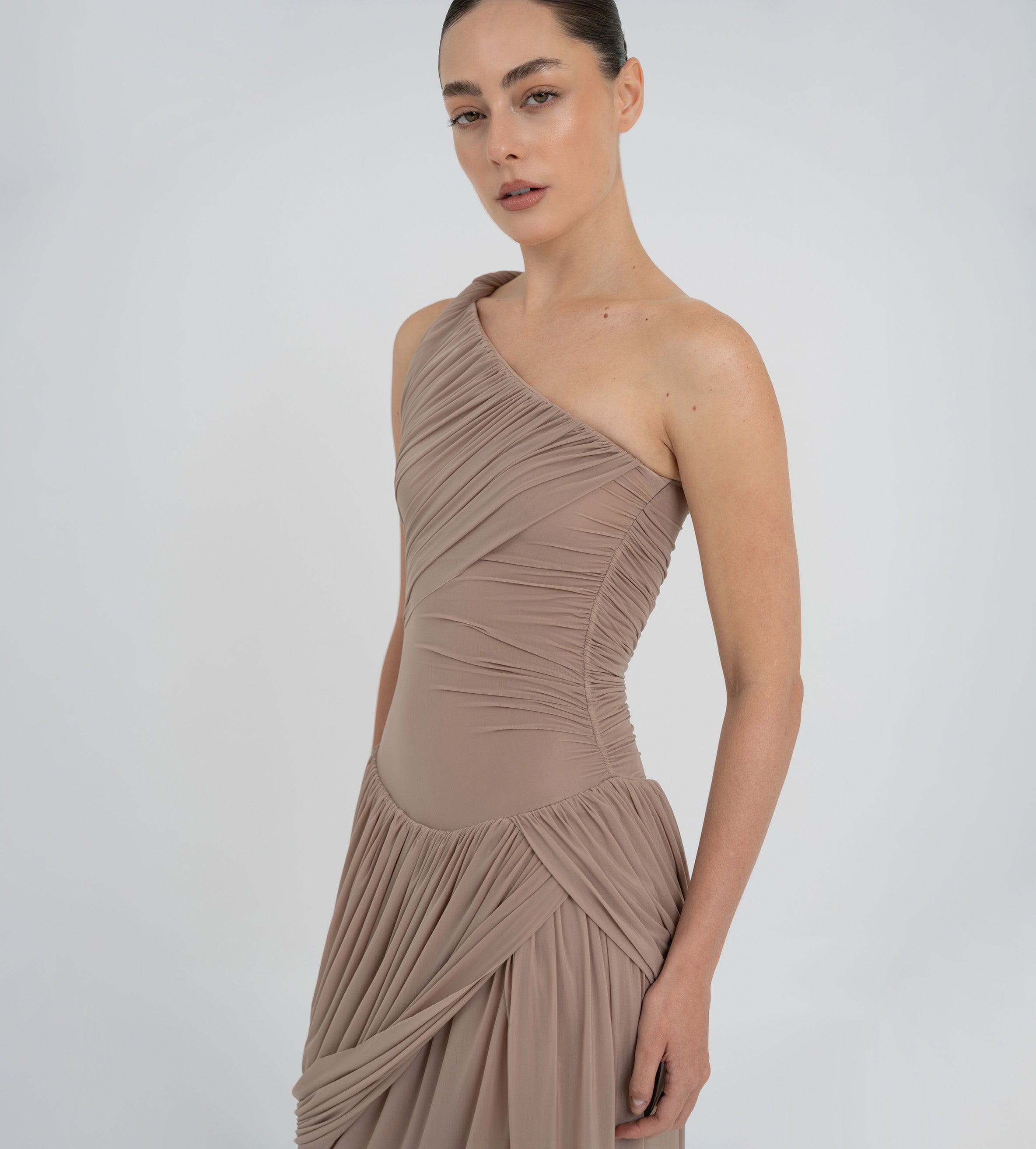 The Getsemani long dress showcases a sculptural design defined by a one-shoulder neckline and a twisted strap that flows into a bidirectional ruched bodice. A diagonal line at the hips reveals a dramatic, double-layer asymmetric skirt with twisted draping, creating depth, movement and a striking silhouette.