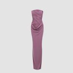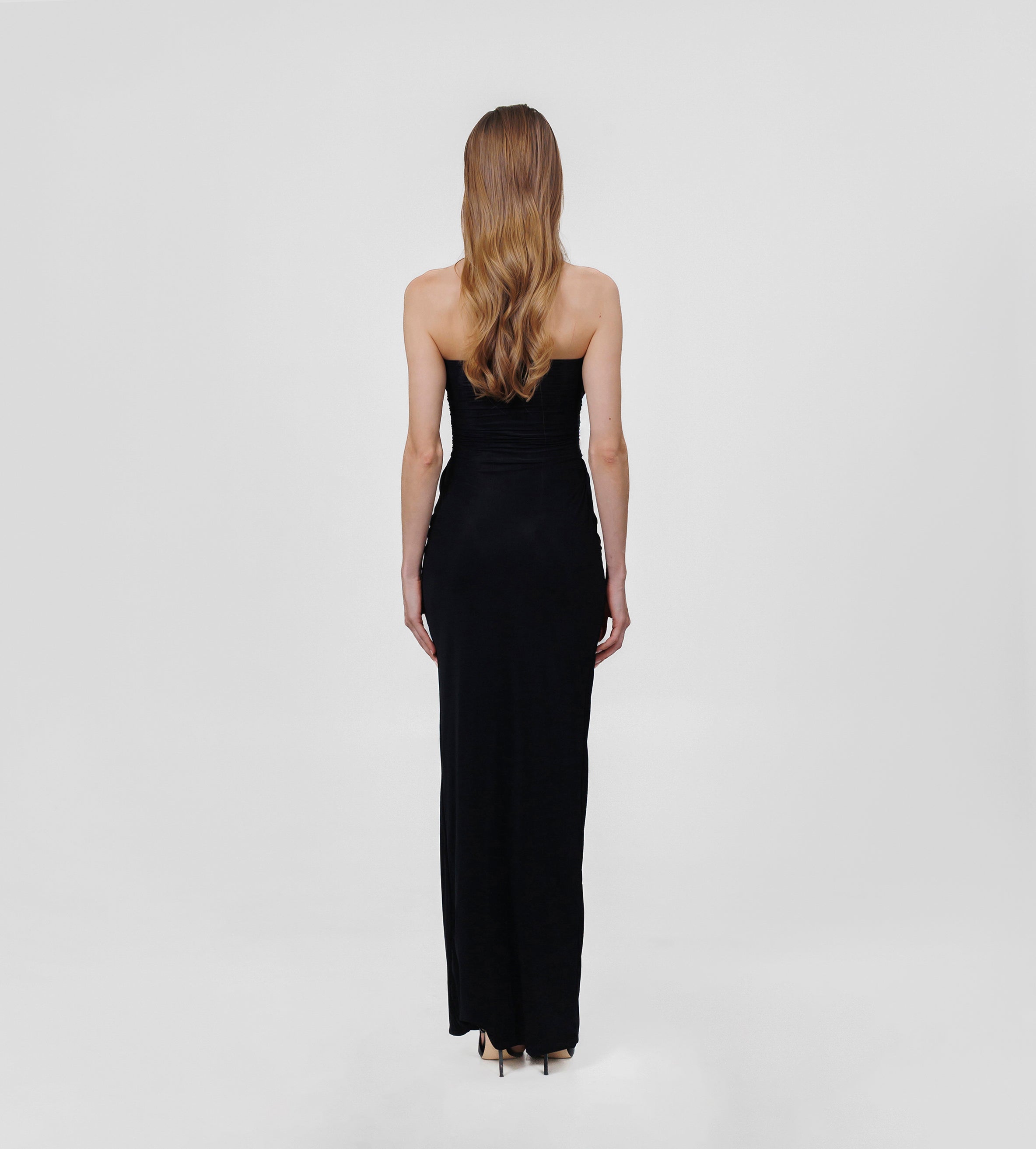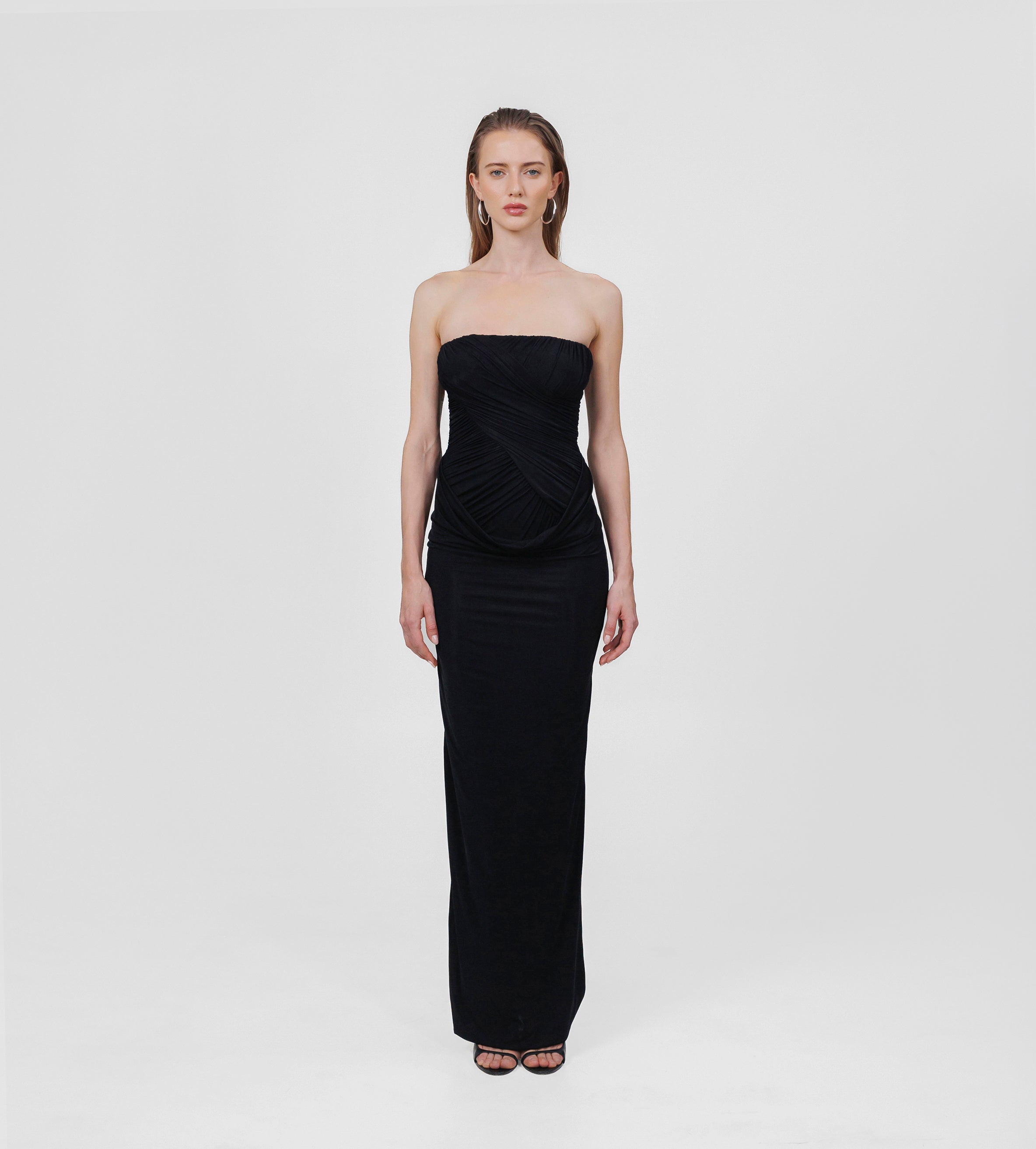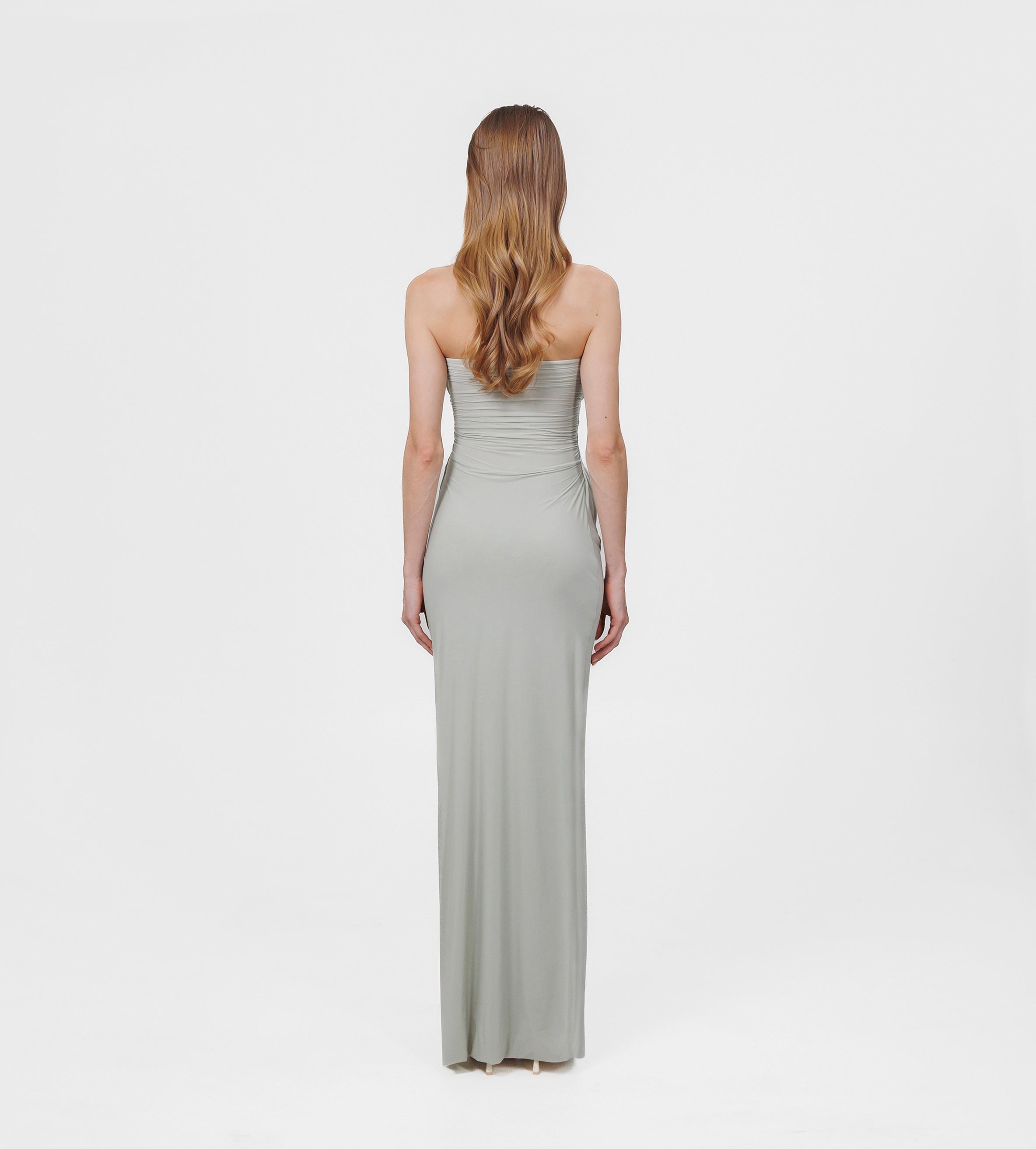 The Gorgonia long dress showcases a soft, strapless neckline with intricate ruching that gracefully contours the body and continues into a fully ruched back. A draped layer at the waist creates a subtle cowl effect, flowing effortlessly into a long, column-style skirt embodying sophistication.