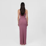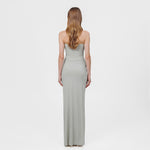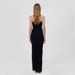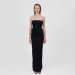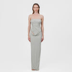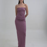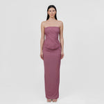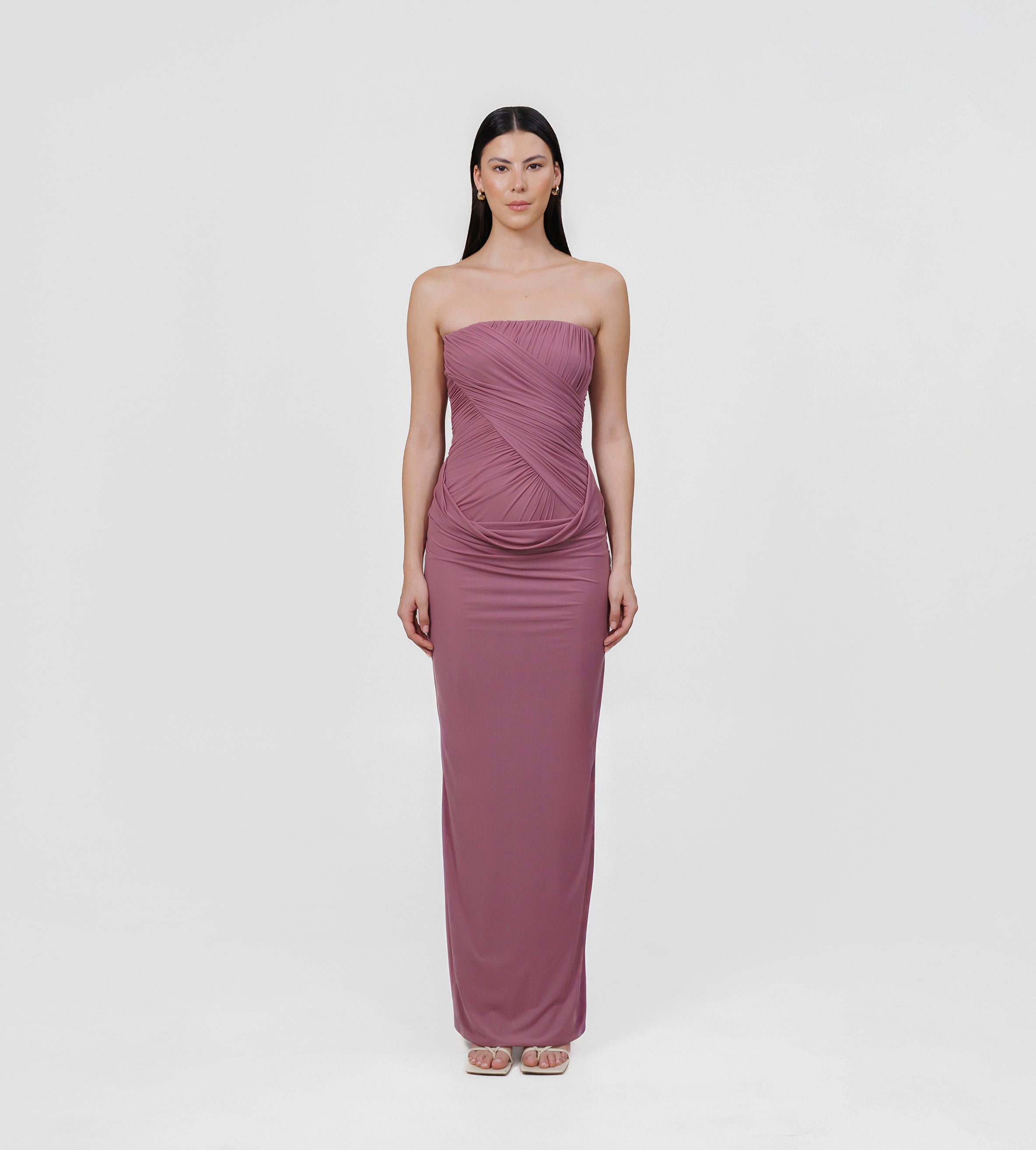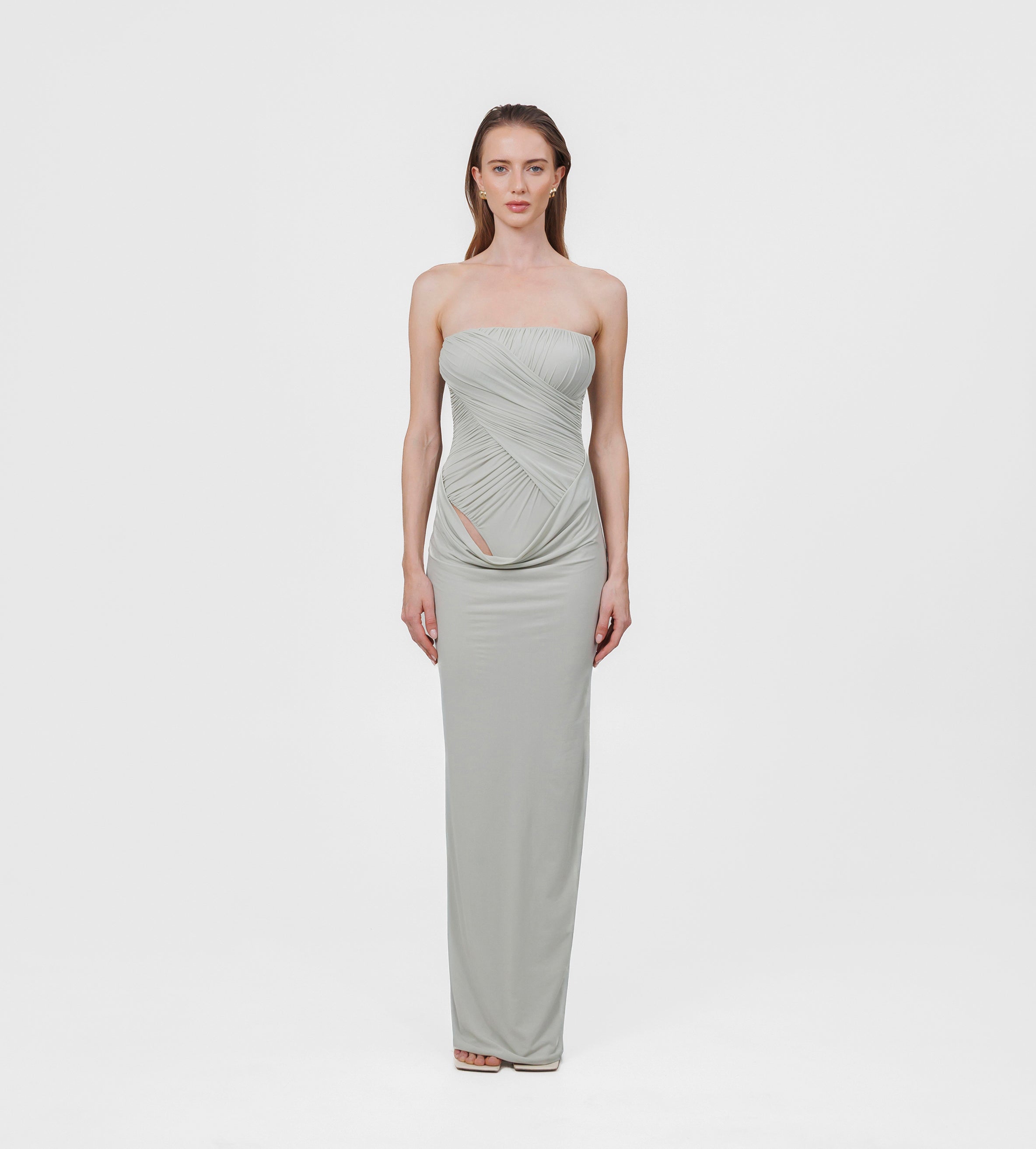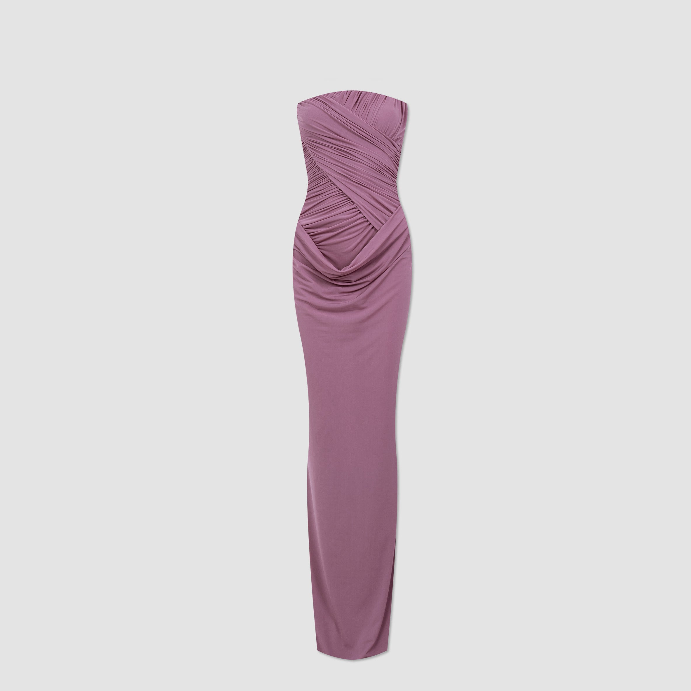 The Gorgonia long dress showcases a soft, strapless neckline with intricate ruching that gracefully contours the body and continues into a fully ruched back. A draped layer at the waist creates a subtle cowl effect, flowing effortlessly into a long, column-style skirt embodying sophistication.