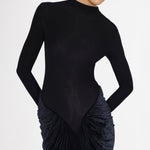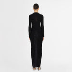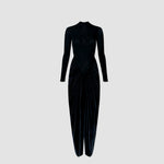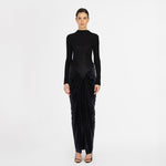 The Guernica dress blends our sheer iconic fabric with our famous fluid velvet: It features a fitted turtleneck top, trimmed with a row of delicate covered buttons at the back, and flows into a deep V-cut long ruched skirt with a front slit and central draping detail at the back.