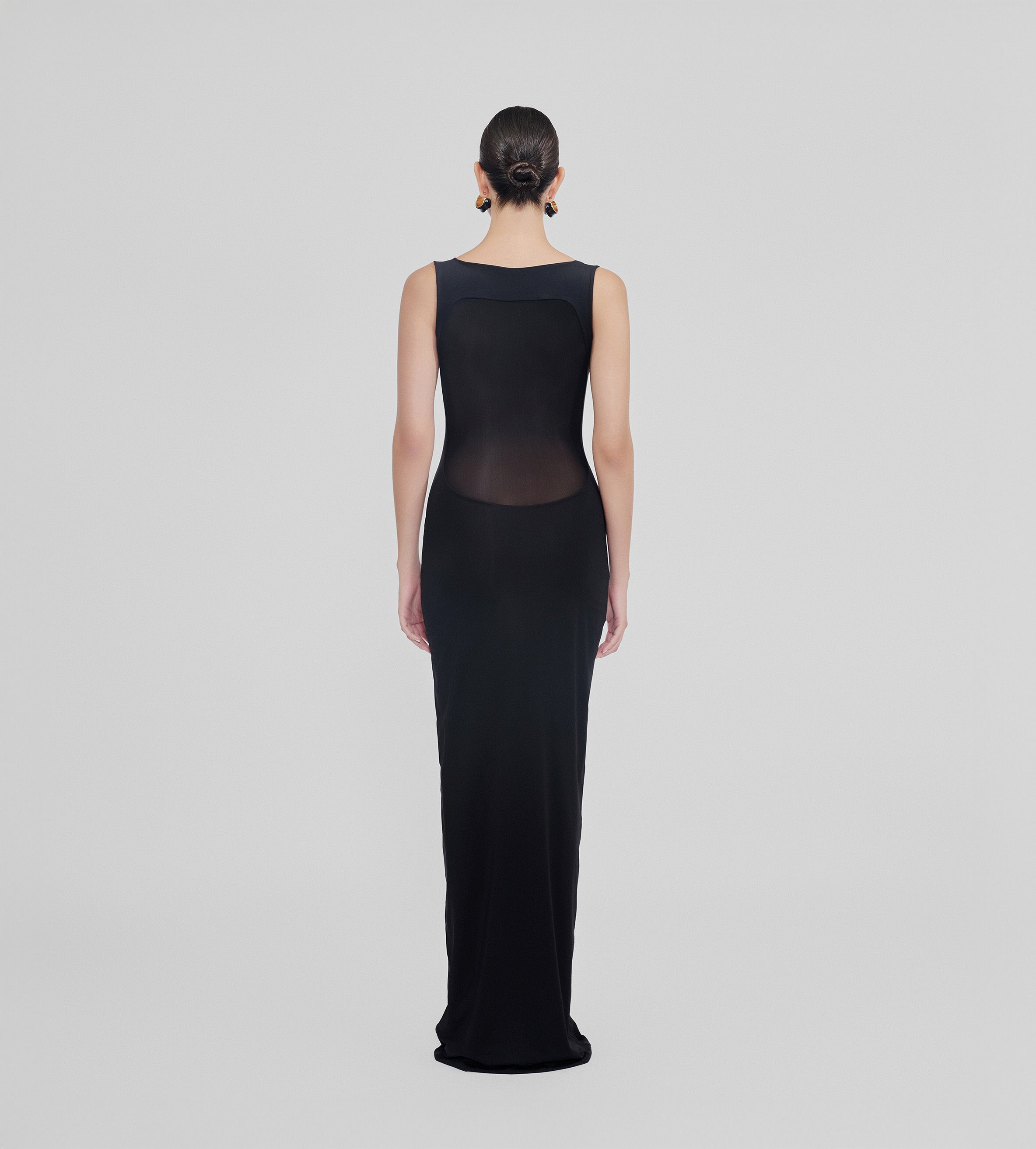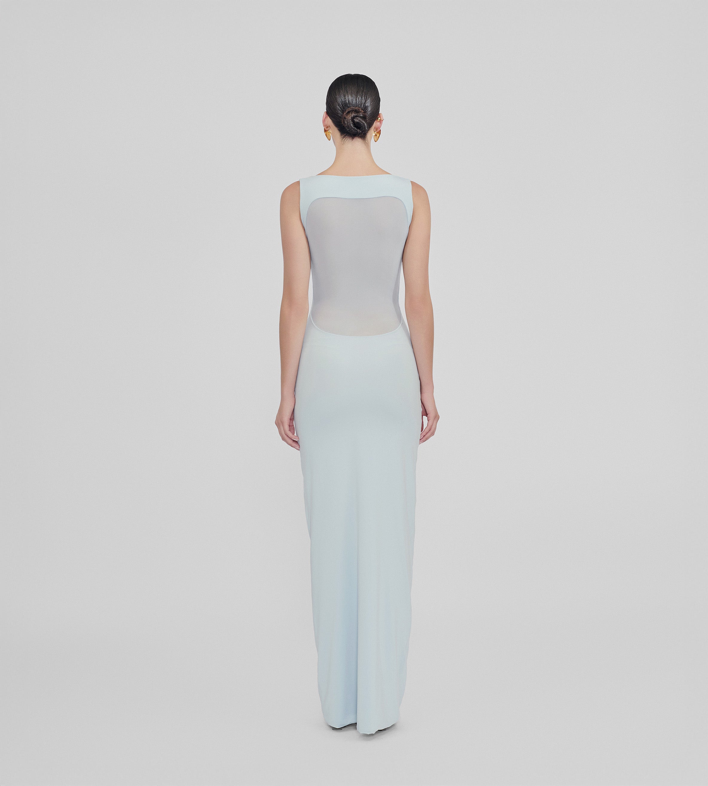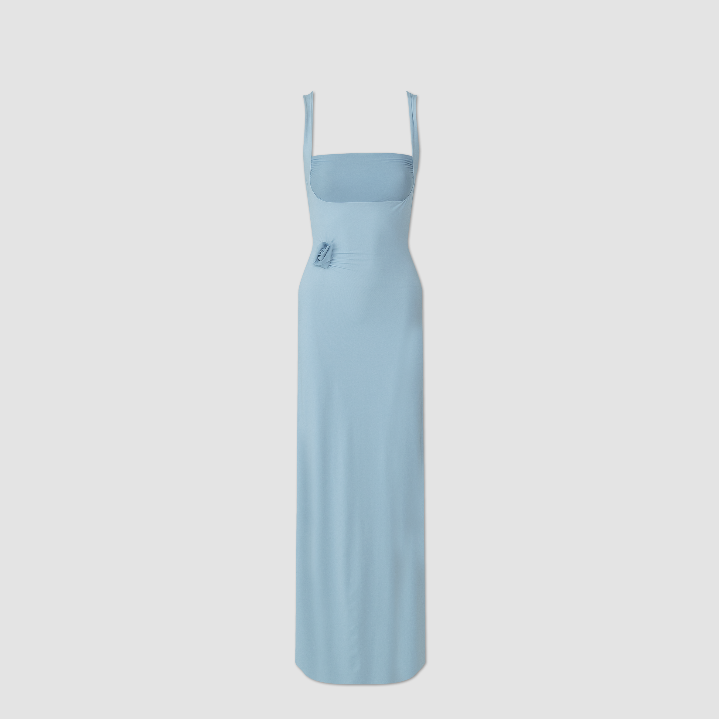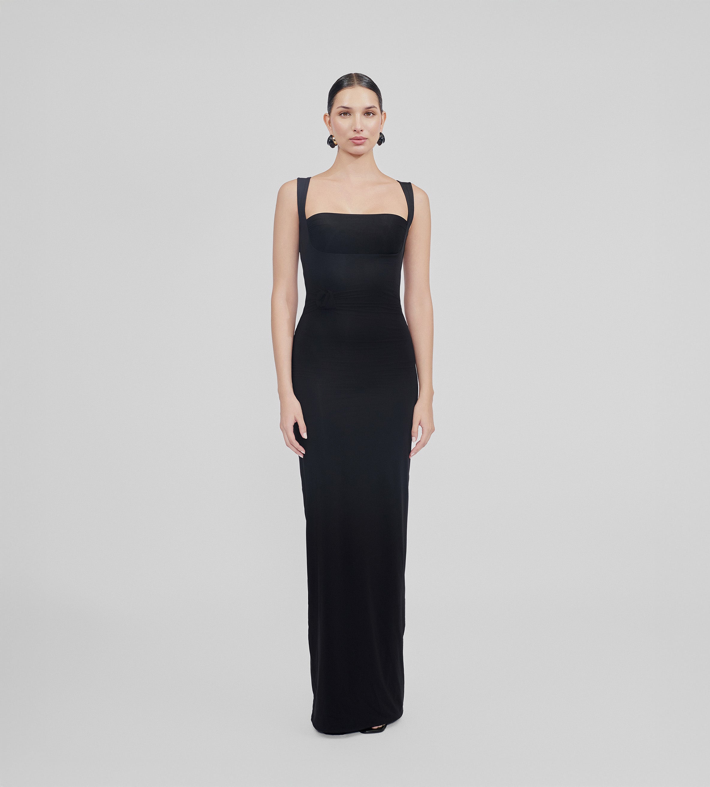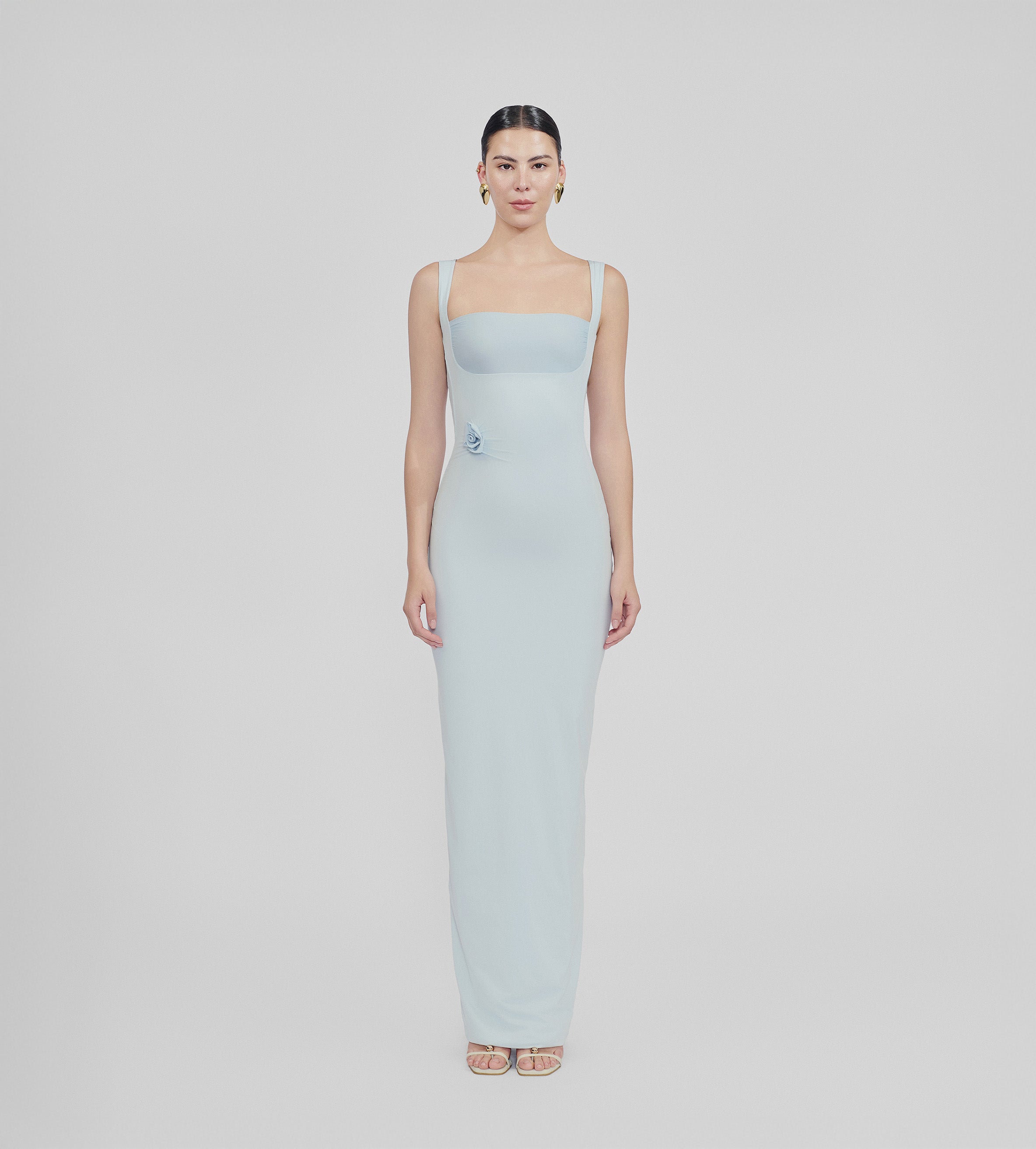 The Hibisco dress seamlessly blends our two iconic fabrics. It features an alluring square neckline, framed by wide straps that contour into a flattering bandeau shape over the bust. The form-fitting silhouette flows effortlessly into a sleek column skirt, while a signature lateral 3D floral detail adds the perfect finishing touch. A semi-transparent, dramatic back elevates the design with an added touch of sophistication.
