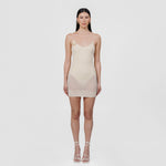 The Jacinto mini dress features a flattering scoop neckline with delicate, slim straps, offering a graceful, feminine touch. Expertly crafted from our semi-transparent lycra, it is enhanced with a blended internal body that creates a seamless silhouette with a figure-enhancing fit.