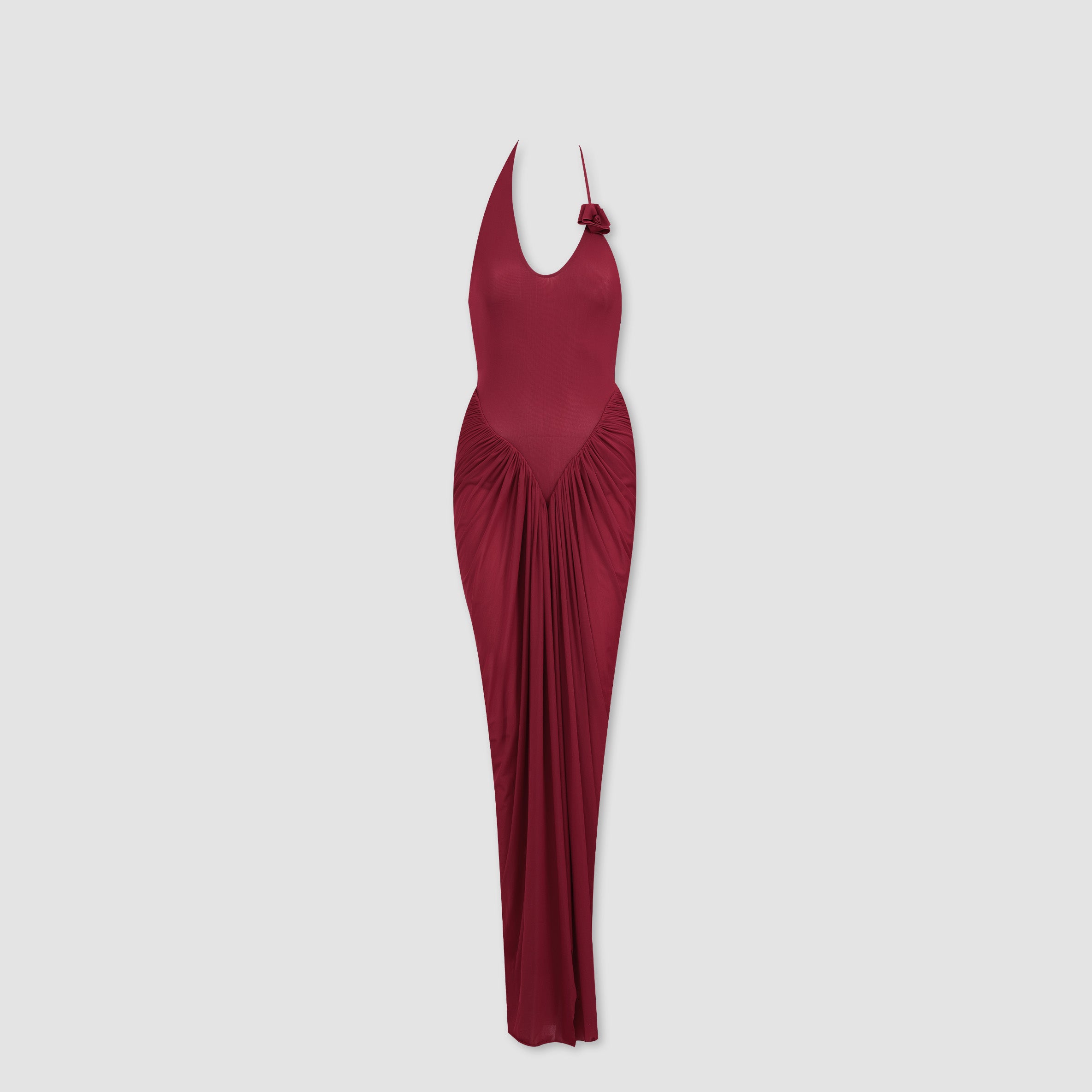 Our long Jingle dress, crafted in semi-transparent lycra, features a deep halter neckline from which a sleek bodysuit acts as a base layer. It flows into a long, gathered skirt with a deep V-cut, featuring a front slit and gathered detailing at the back. The Jingle dress includes a zipper inside the bodysuit for maximum comfort, adorned with a 3D floral detail on one side of the waist.