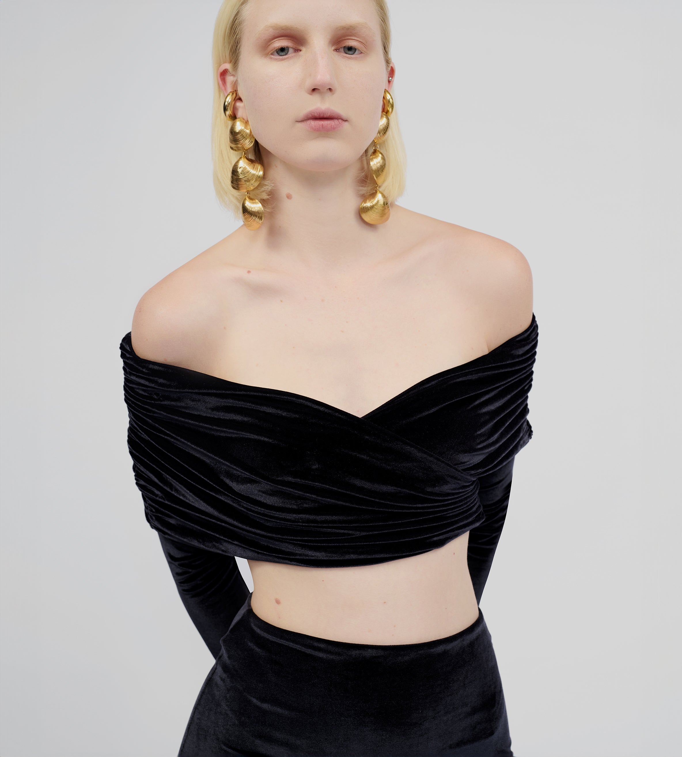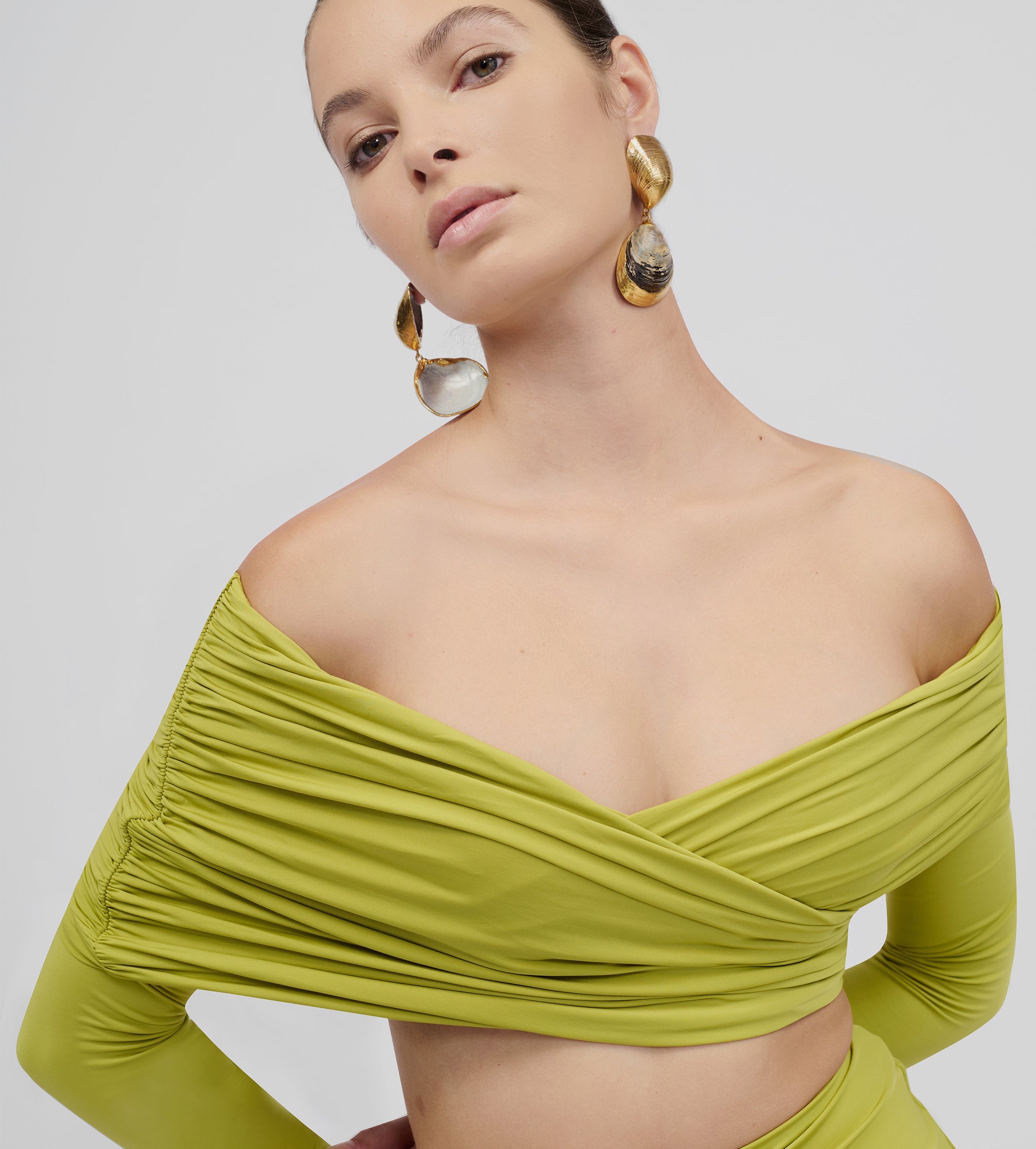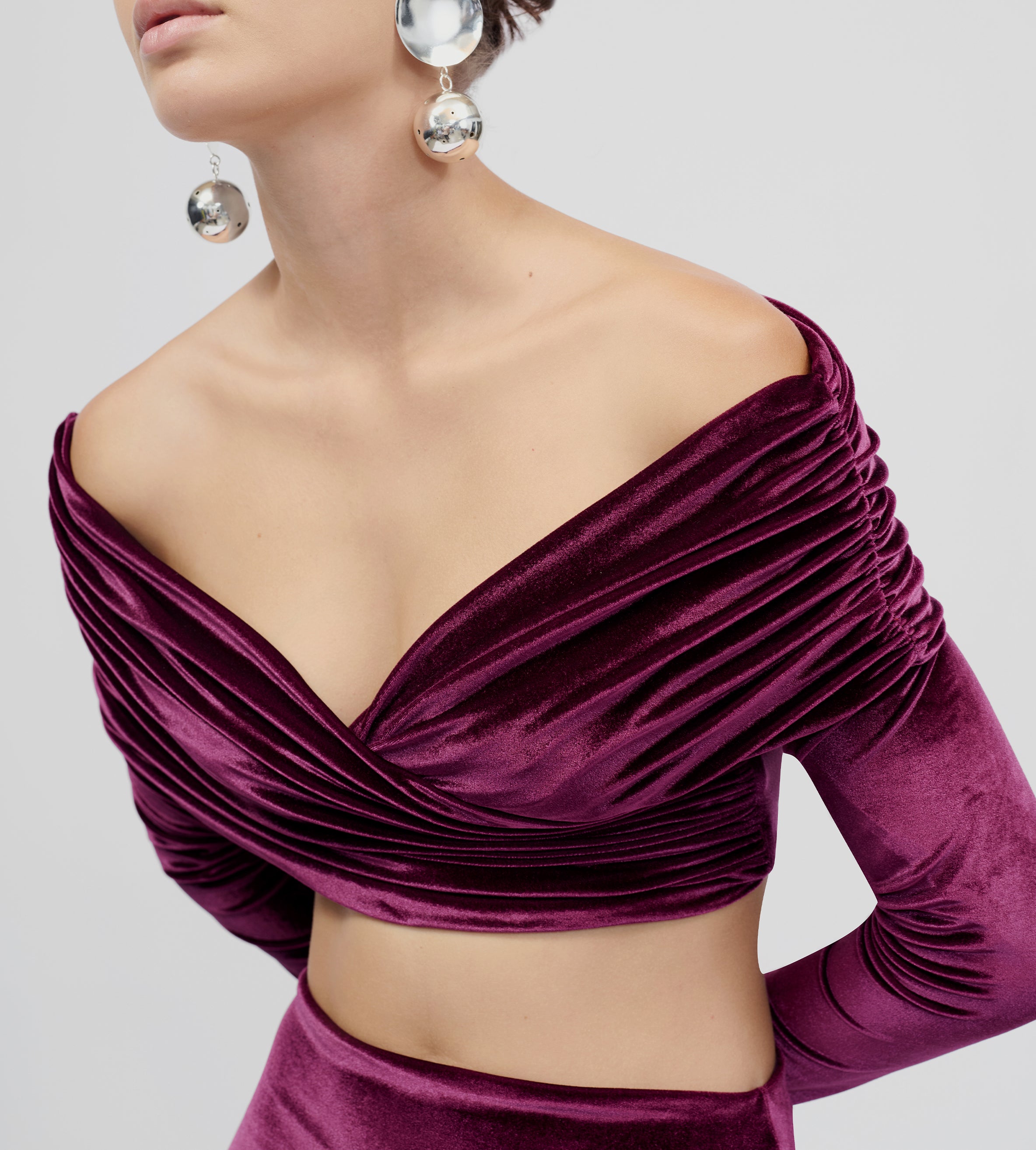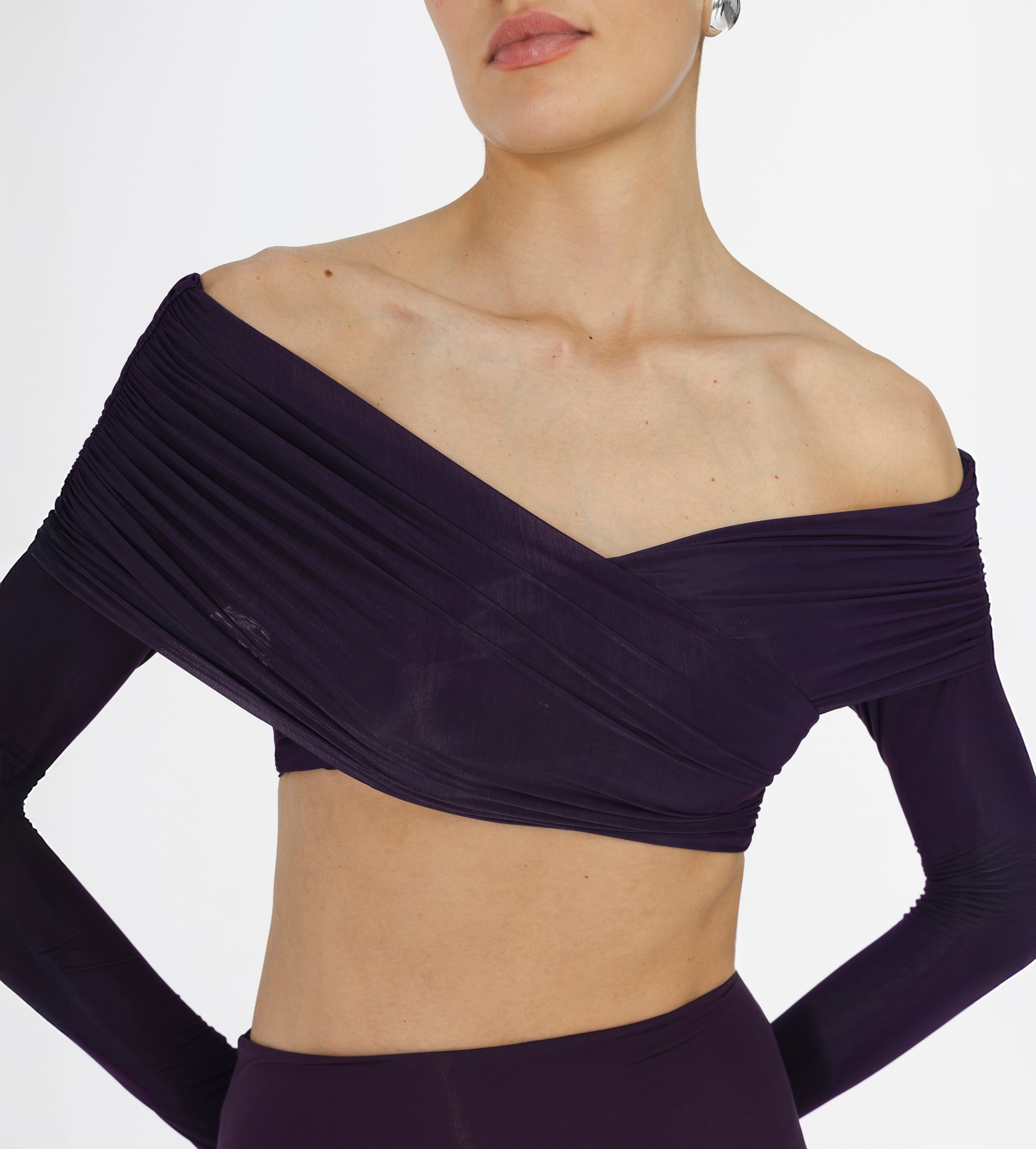 Off-shoulder wrapped ruched top, featuring a sweetheart wrap neckline at the