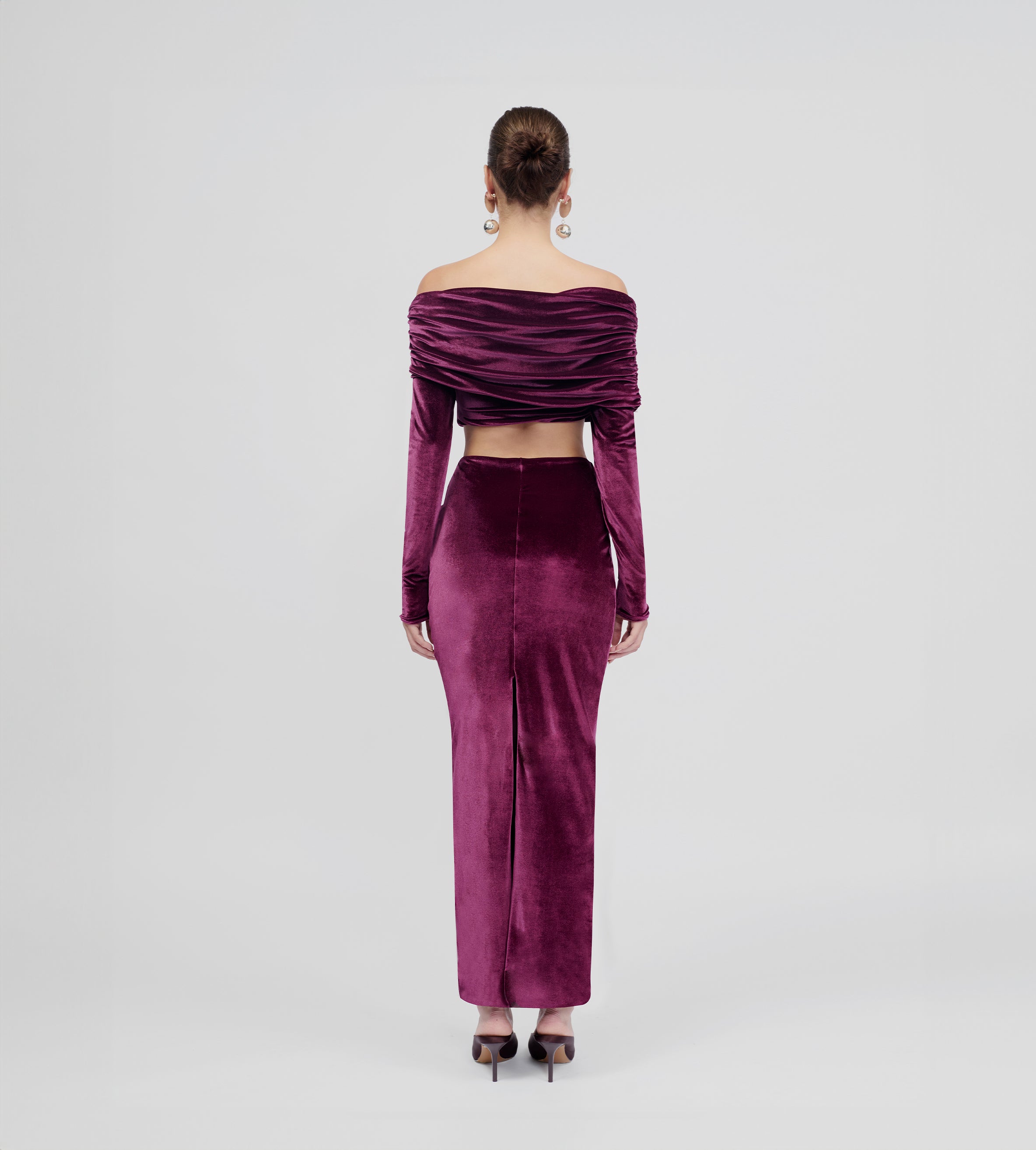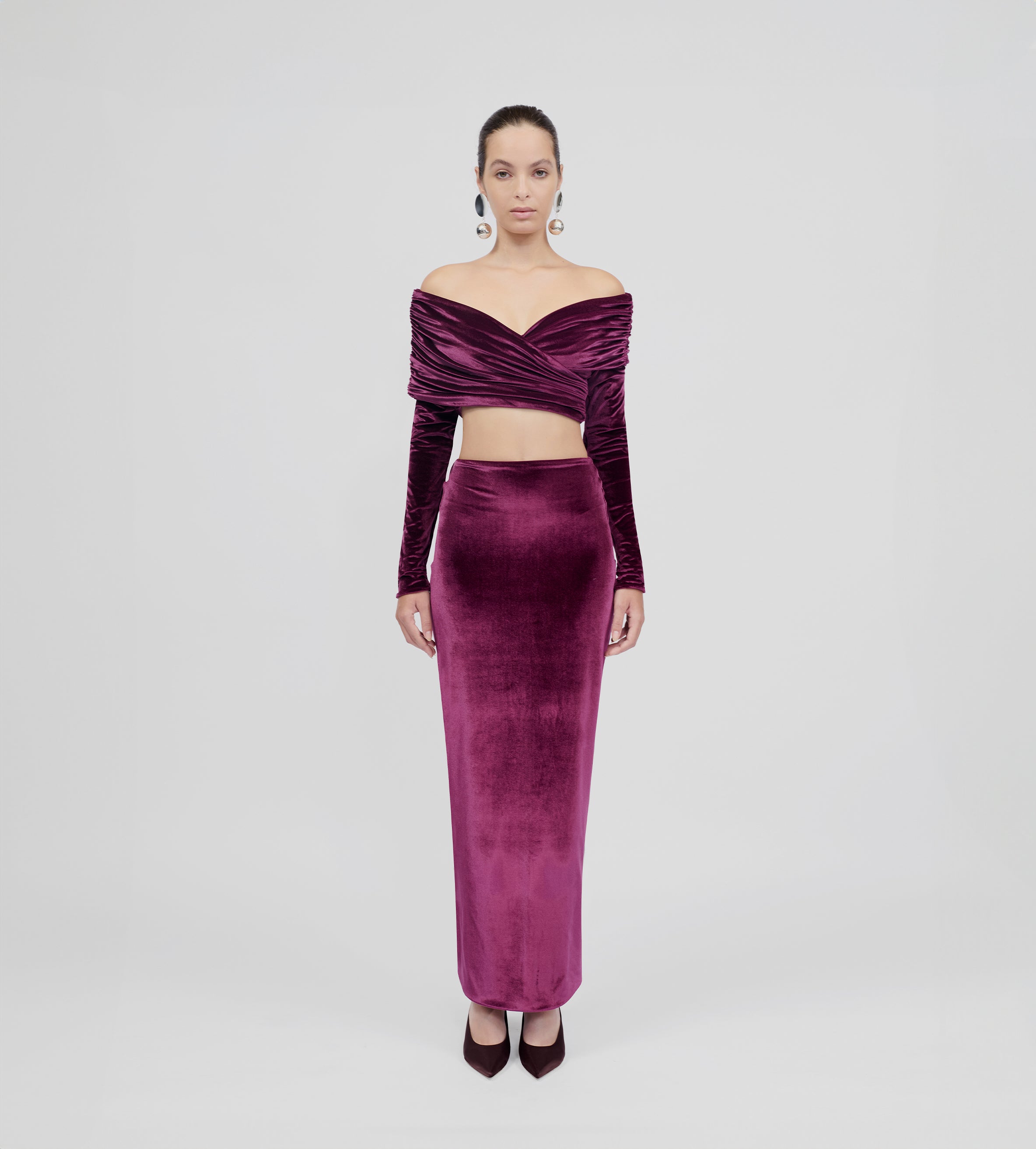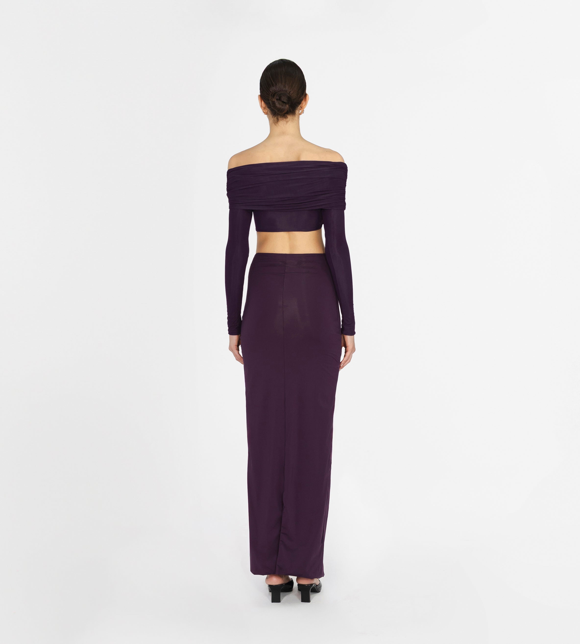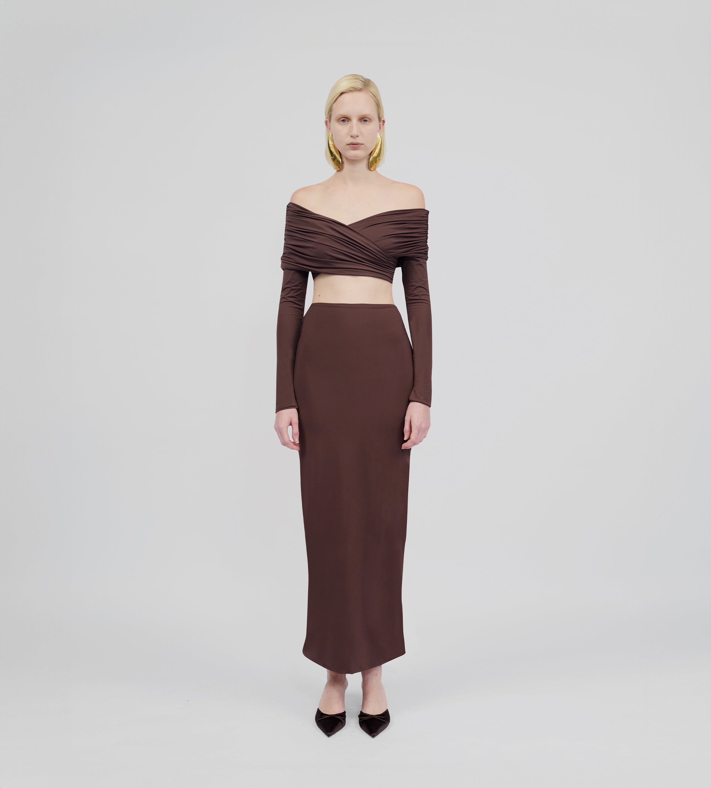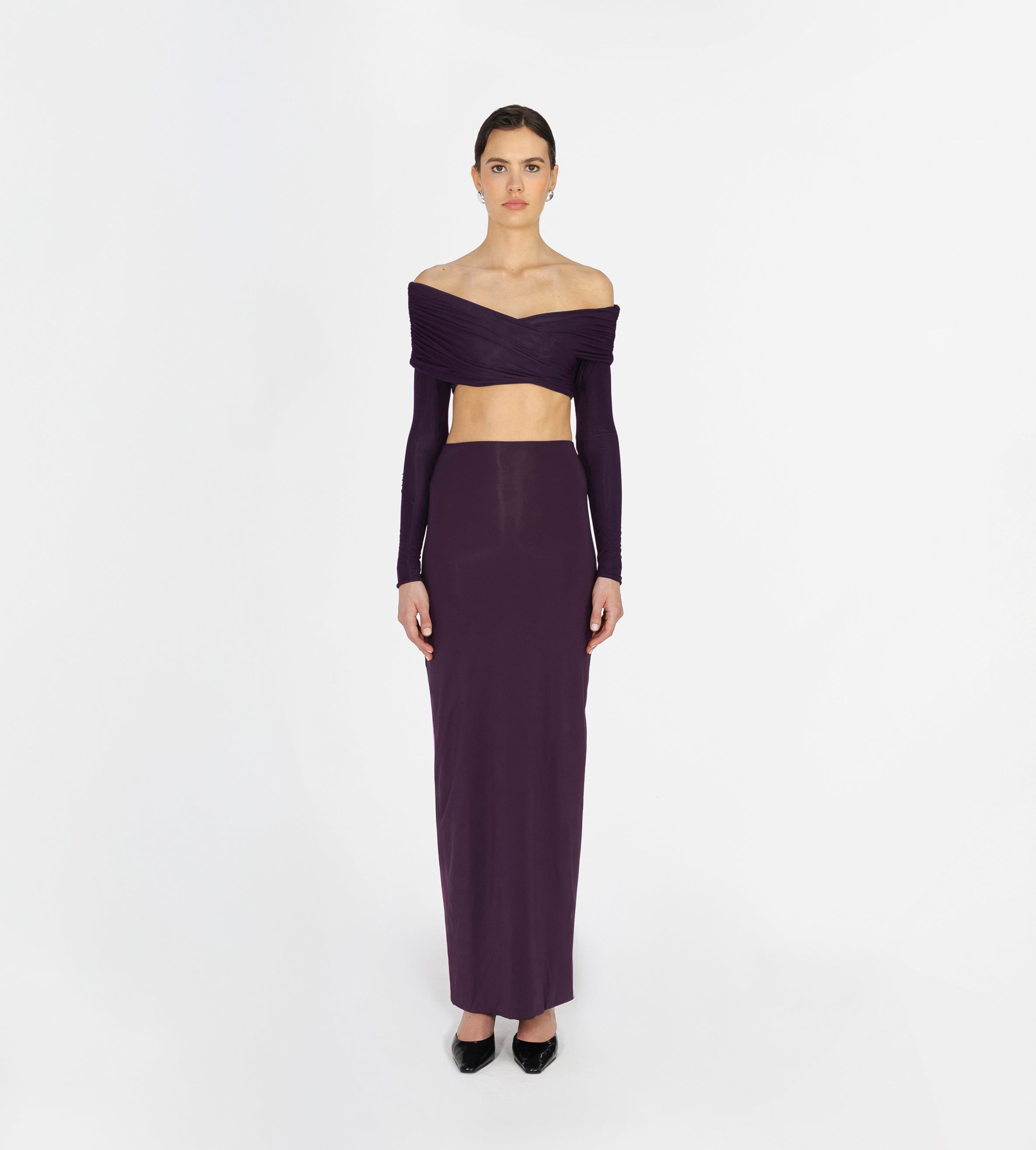 Off-shoulder wrapped ruched top, featuring a sweetheart wrap neckline at the