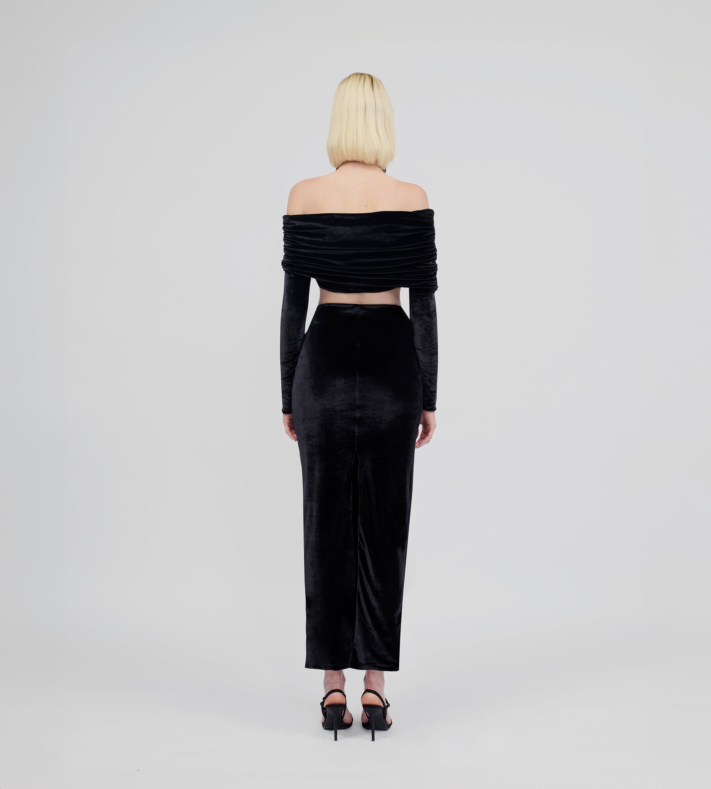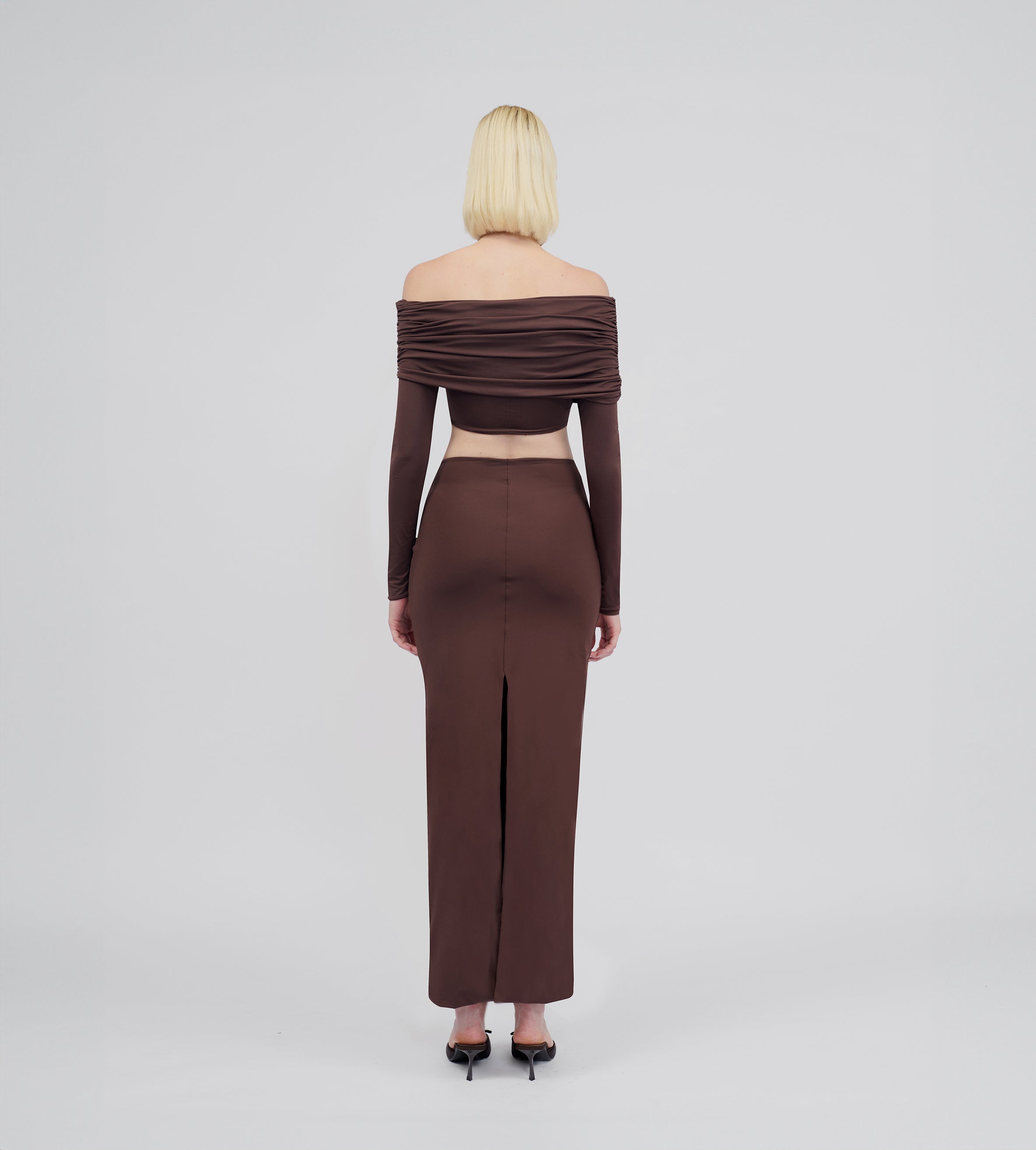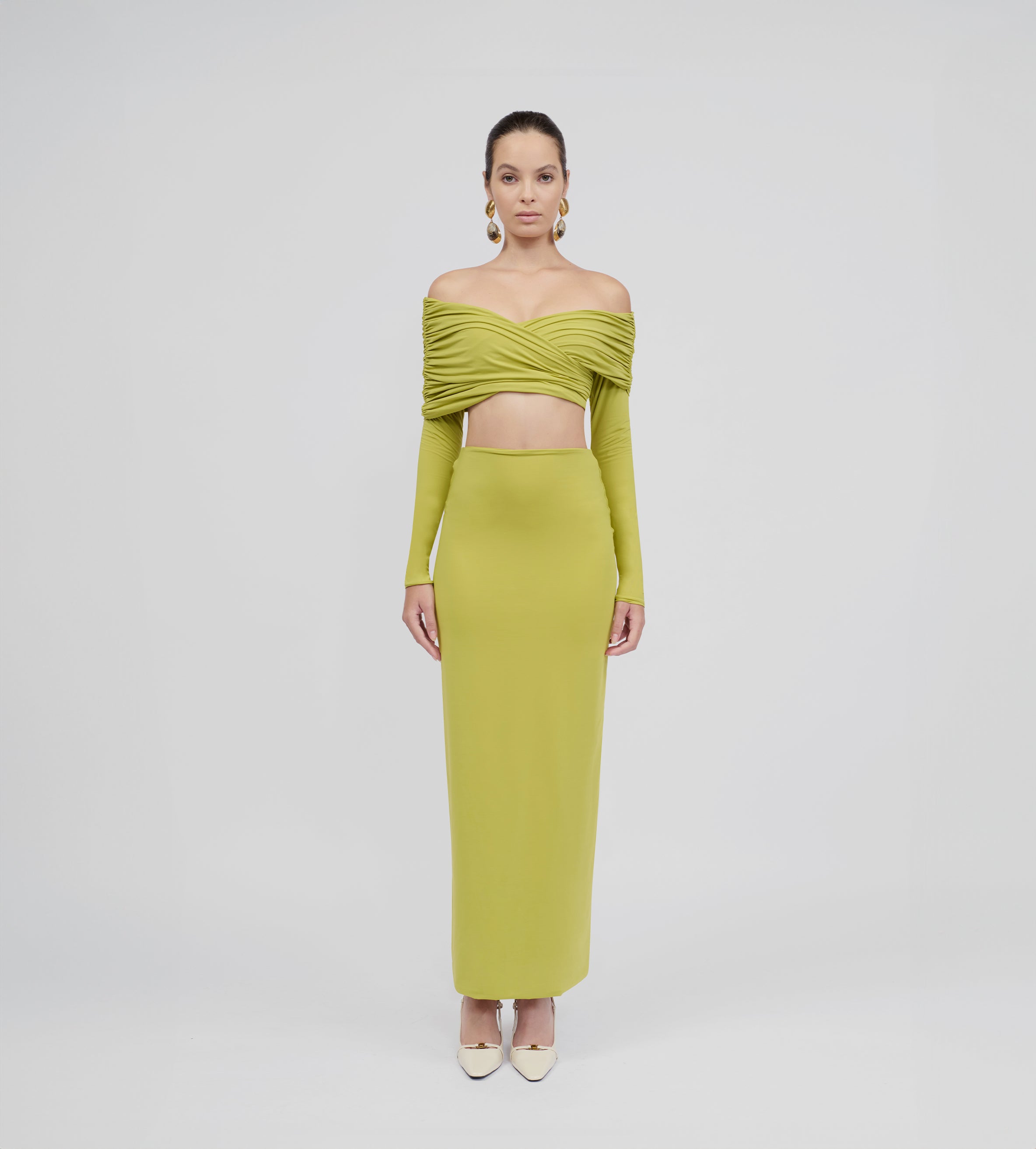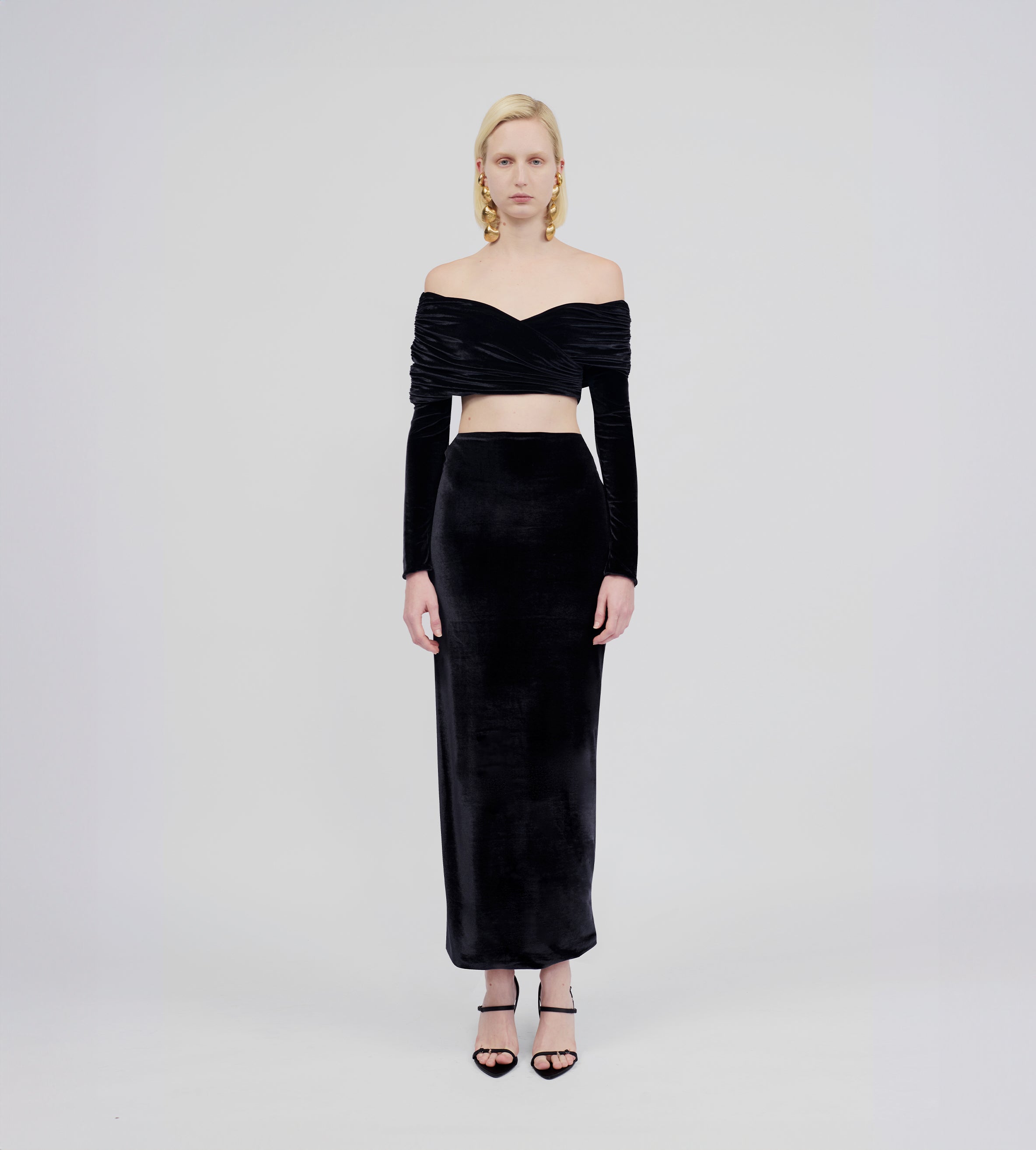 Off-shoulder wrapped ruched top, featuring a sweetheart wrap neckline at the