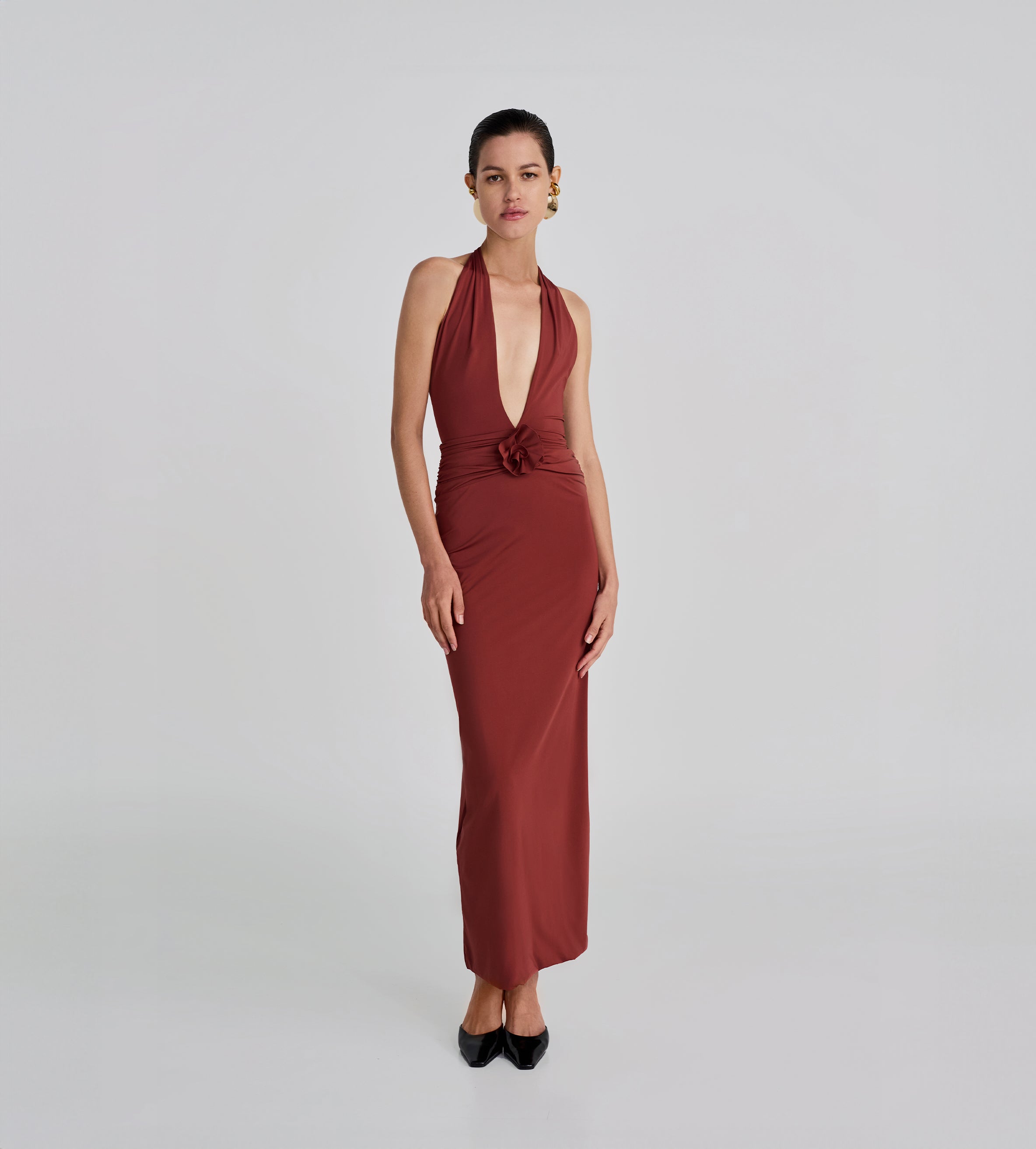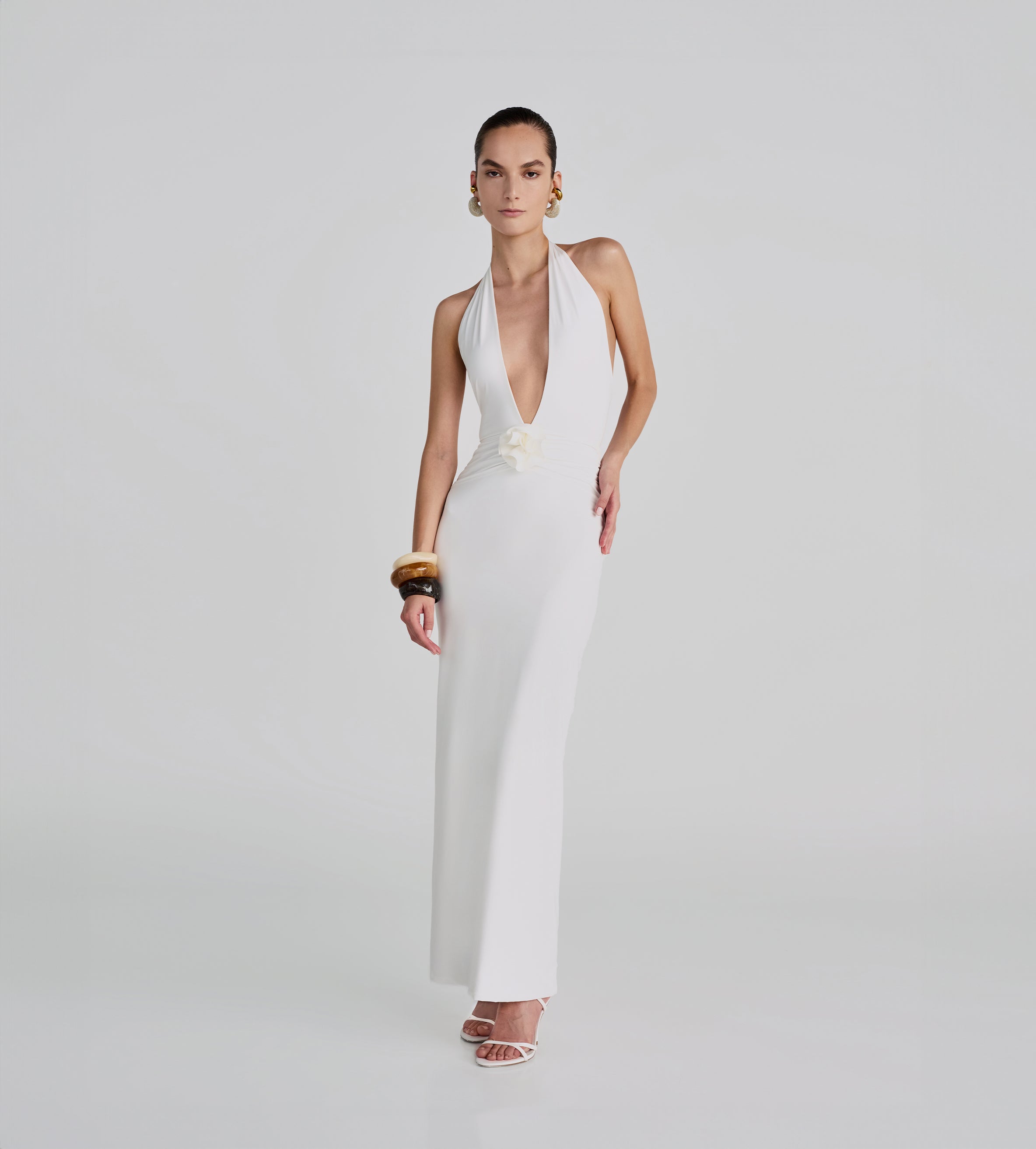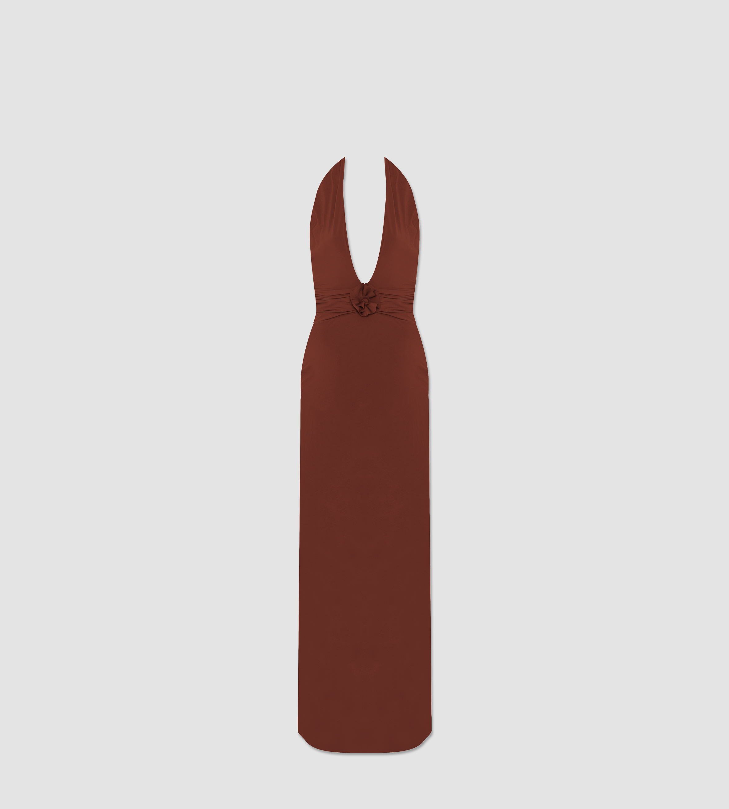 Deep-V halter neckline, long and sleek dress with delicate ruched detail at the waist in front and back, adorned with our signature 3D handmade flower and featuring a sophisticated and flirtatious deep open back. The perfect dress to wear all summer long.