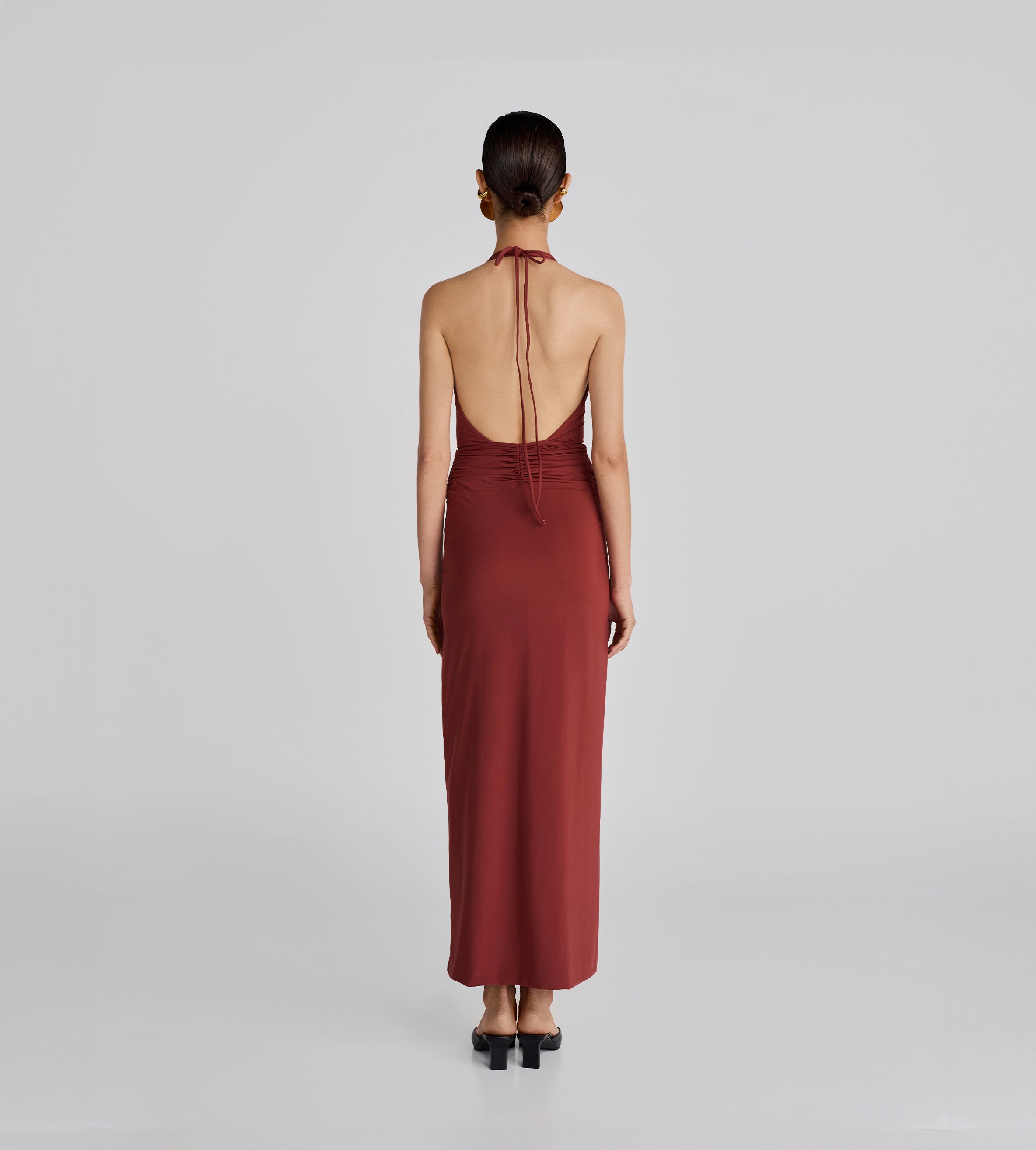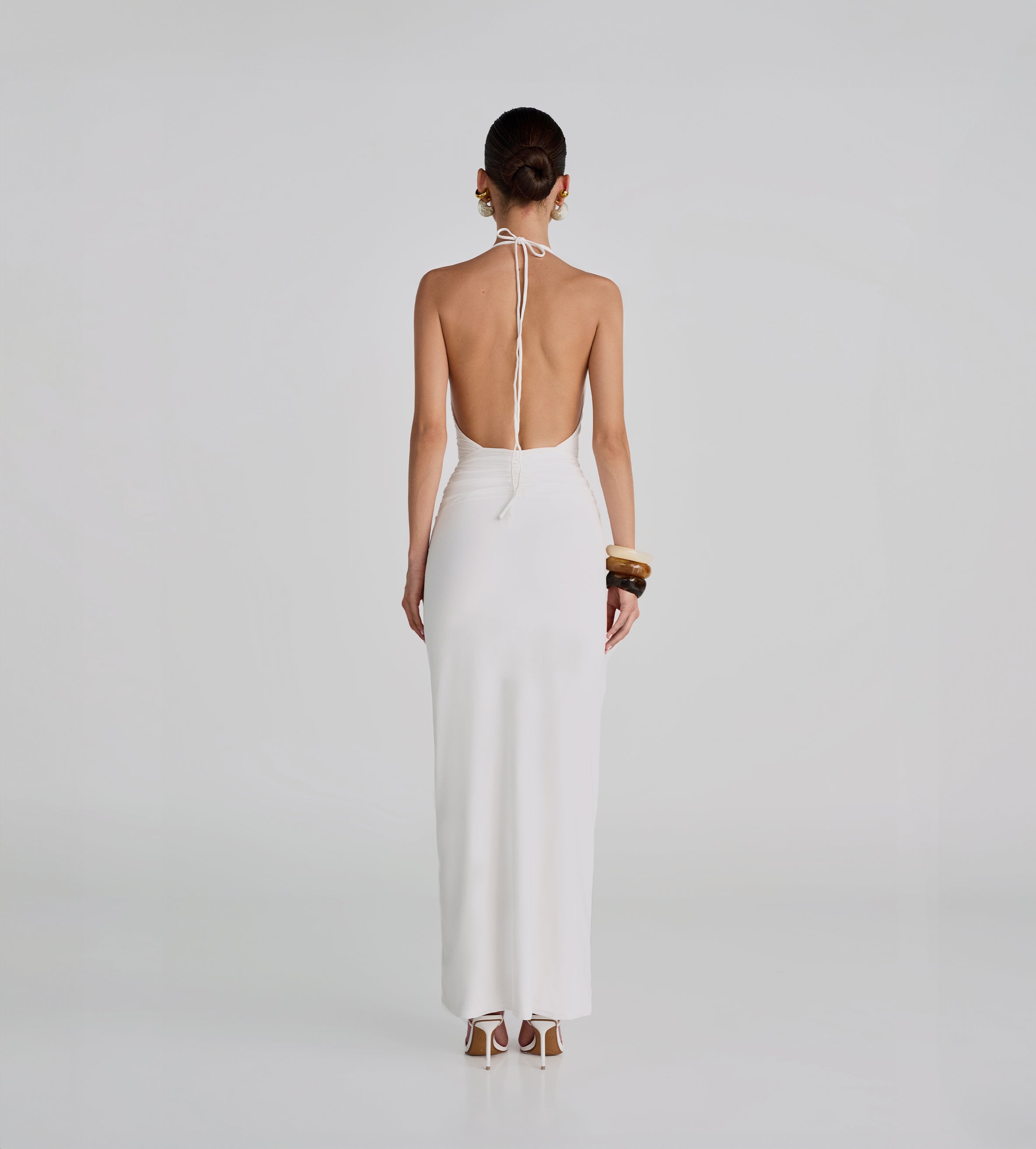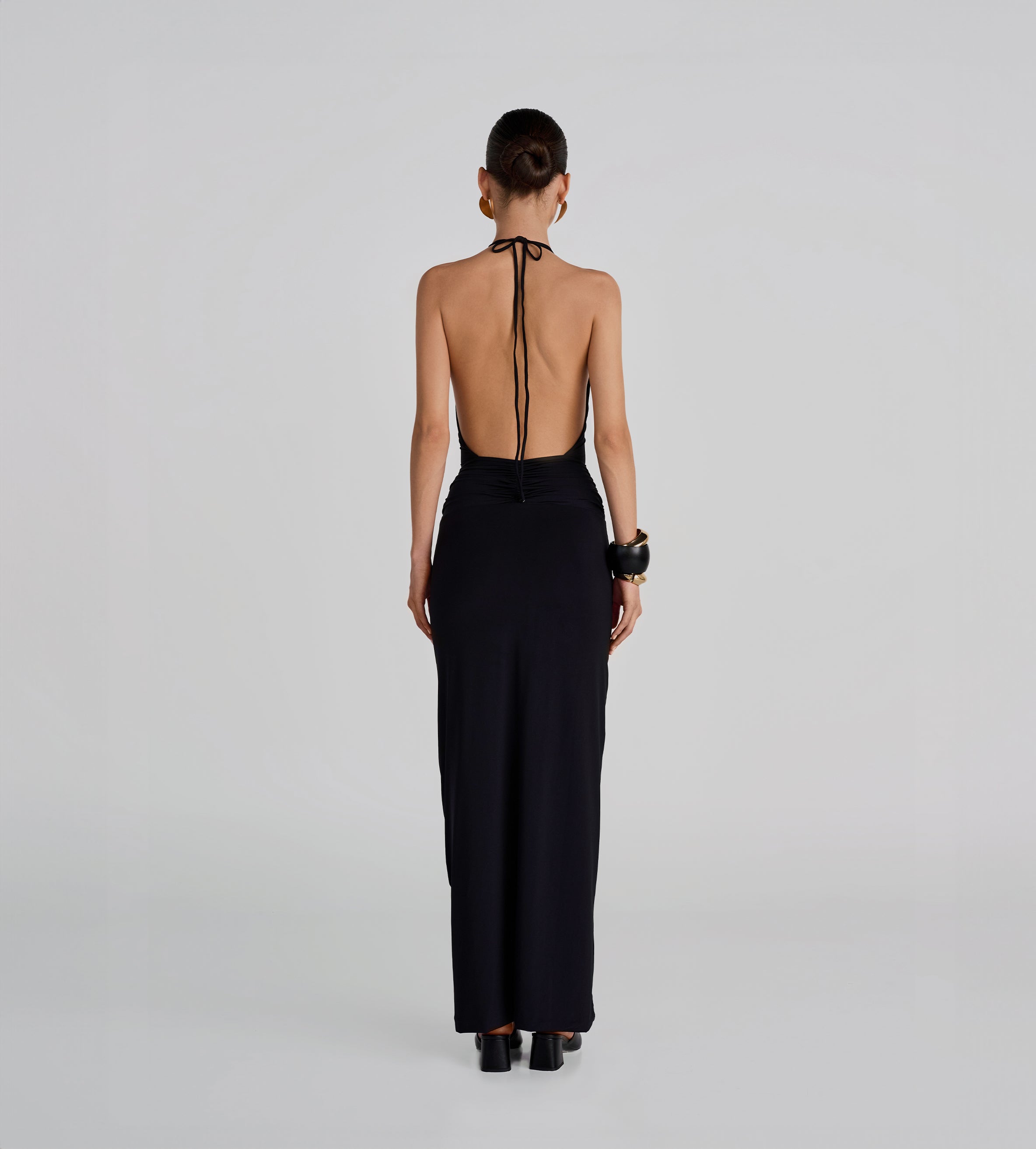 Deep-V halter neckline, long and sleek dress with delicate ruched detail at the waist in front and back, adorned with our signature 3D handmade flower and featuring a sophisticated and flirtatious deep open back. The perfect dress to wear all summer long.