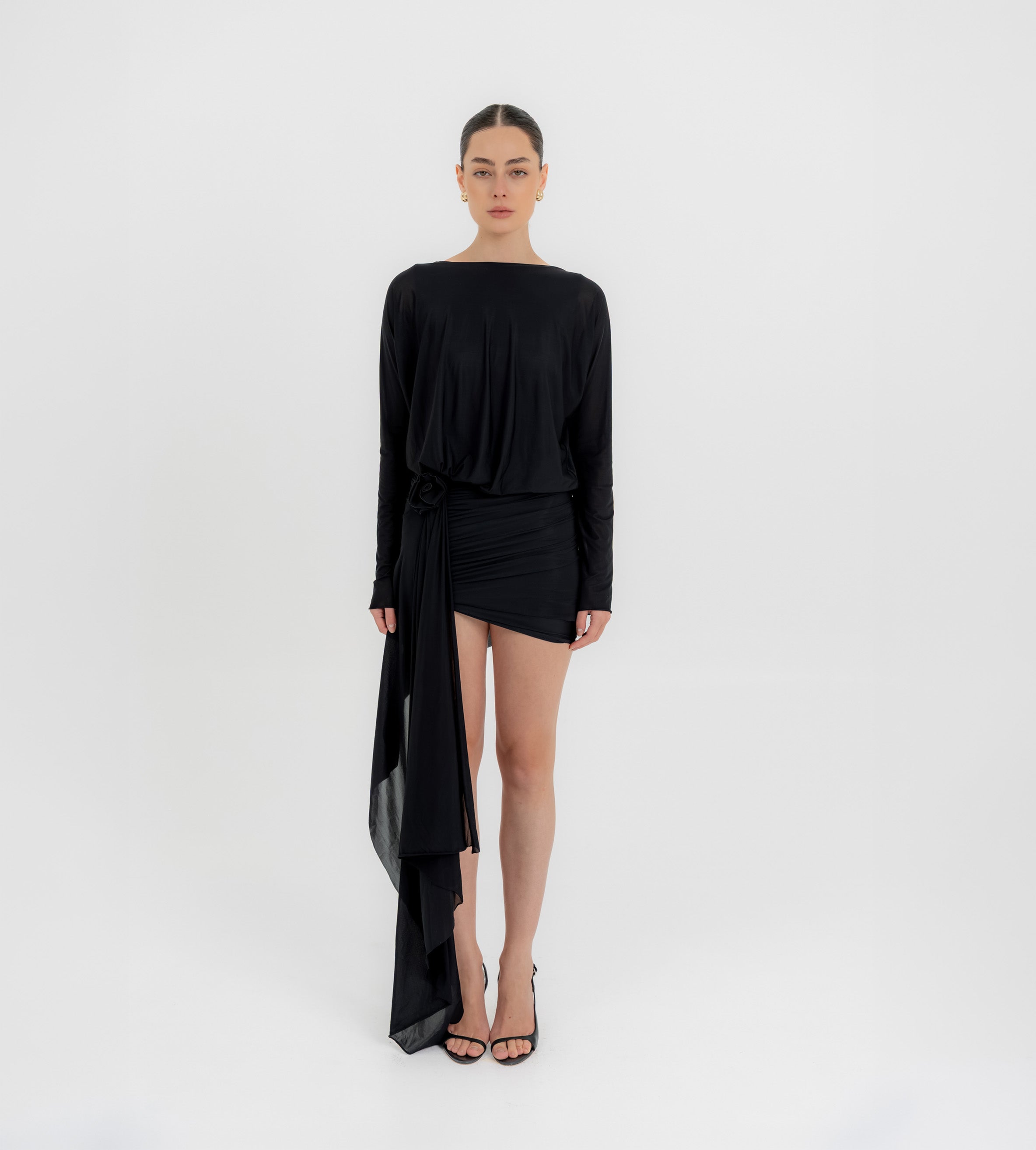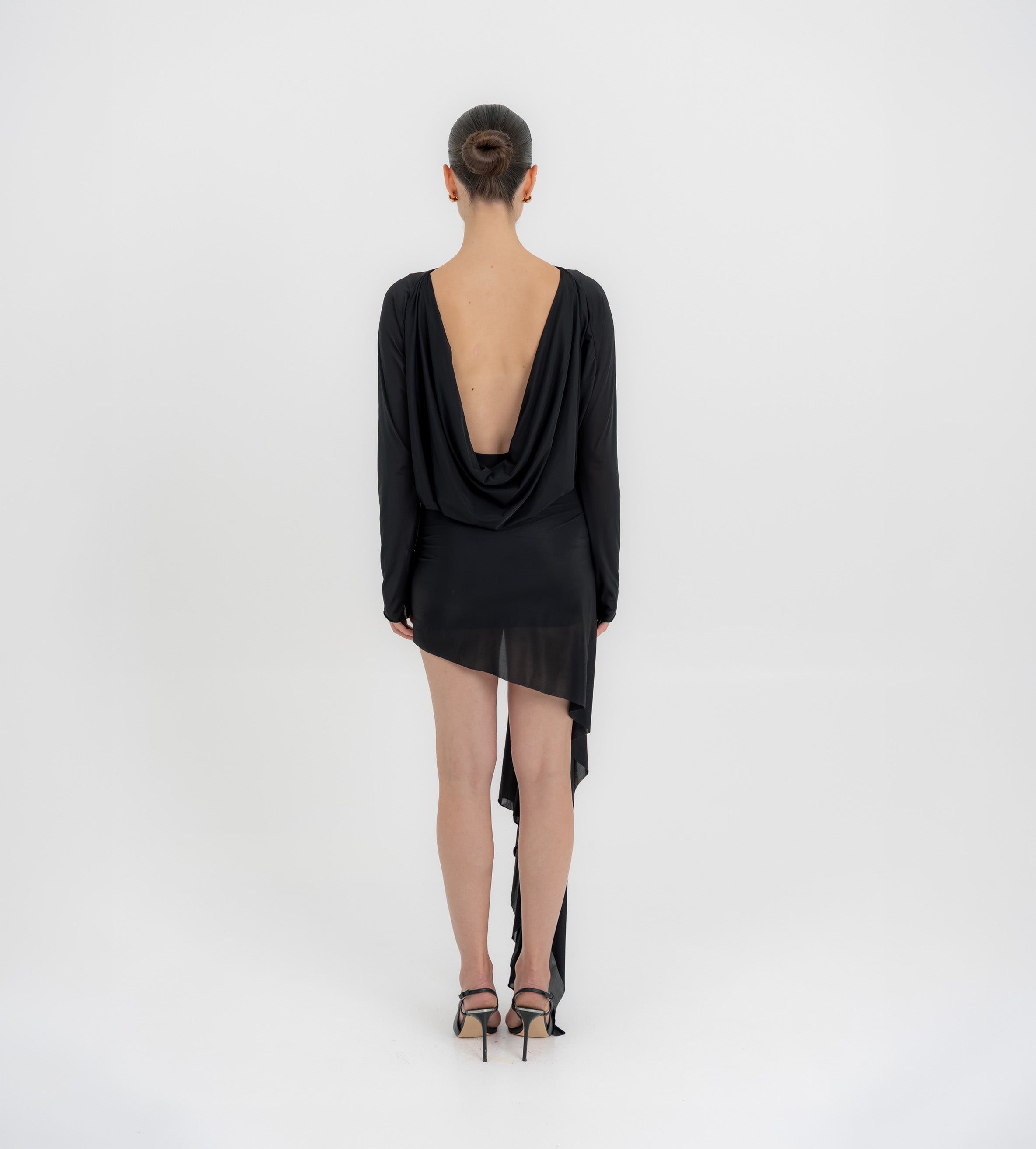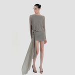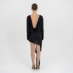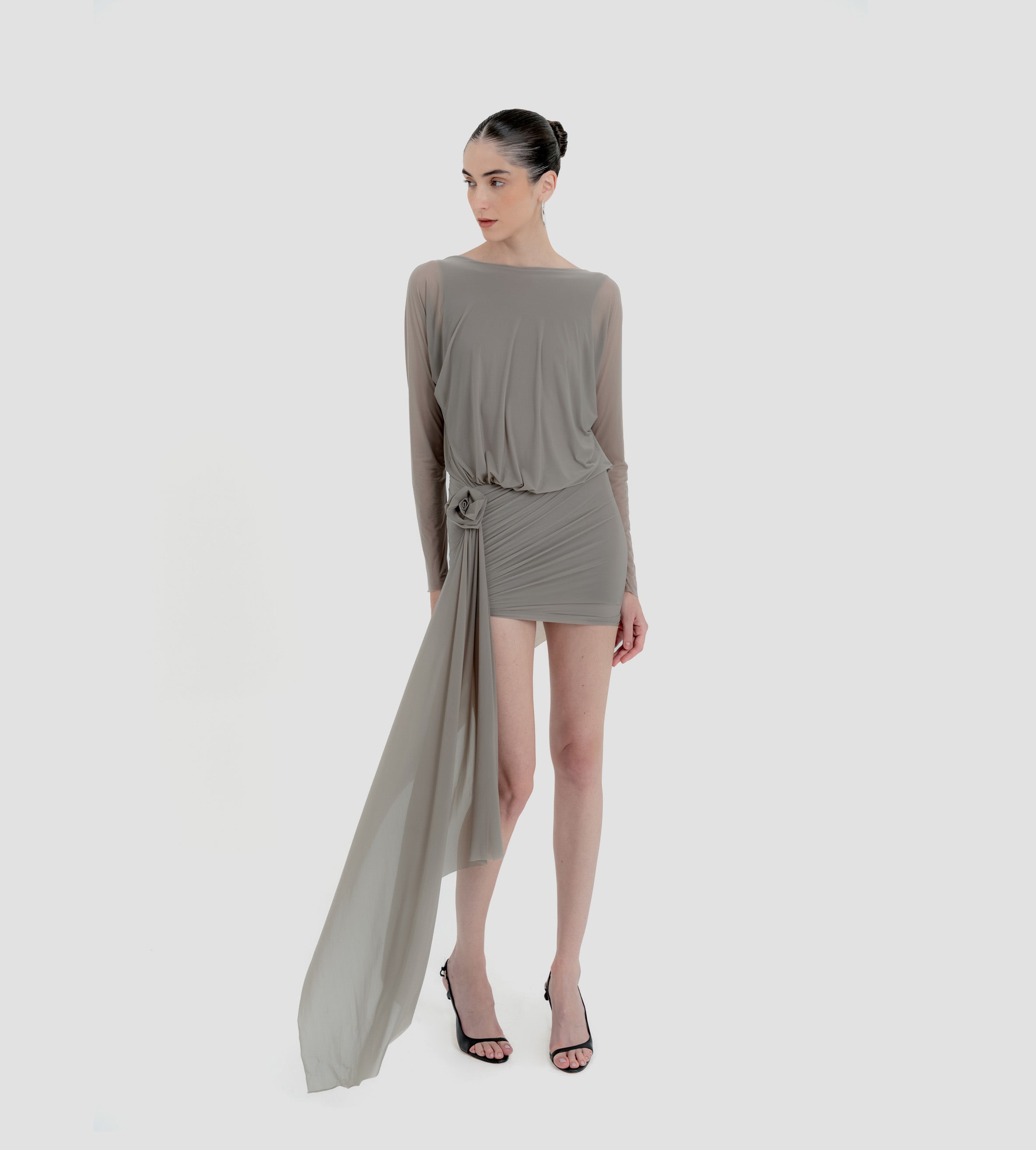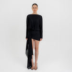 The Lumbre mini dress offers multiple styling options, featuring a bandeau neckline and a deep, draped open back framed by fitted long sleeves. The bodice softly gathers at the waist and flows into an asymmetric, ruched front skirt. A sculptural 3D floral detail completes the design, extending into a dramatic sash that adds movement to this statement piece.