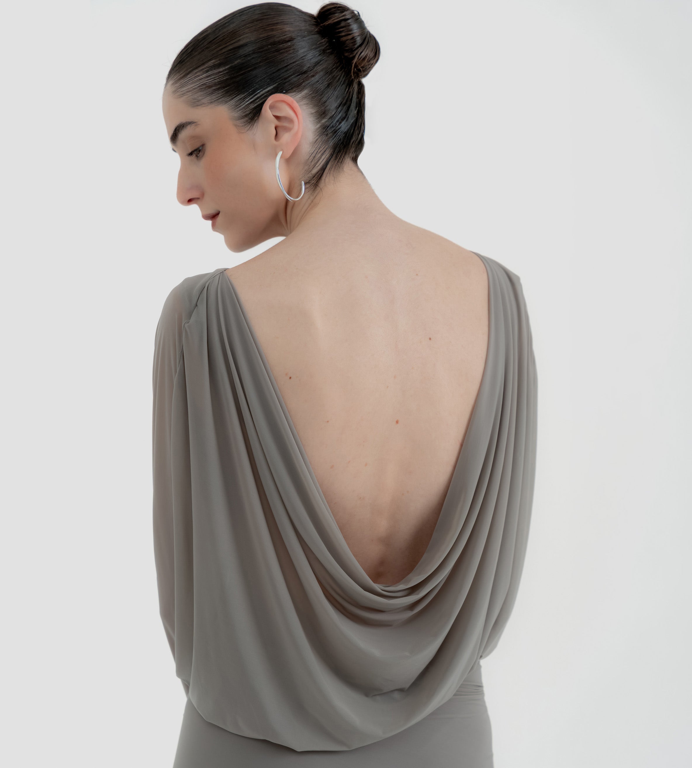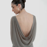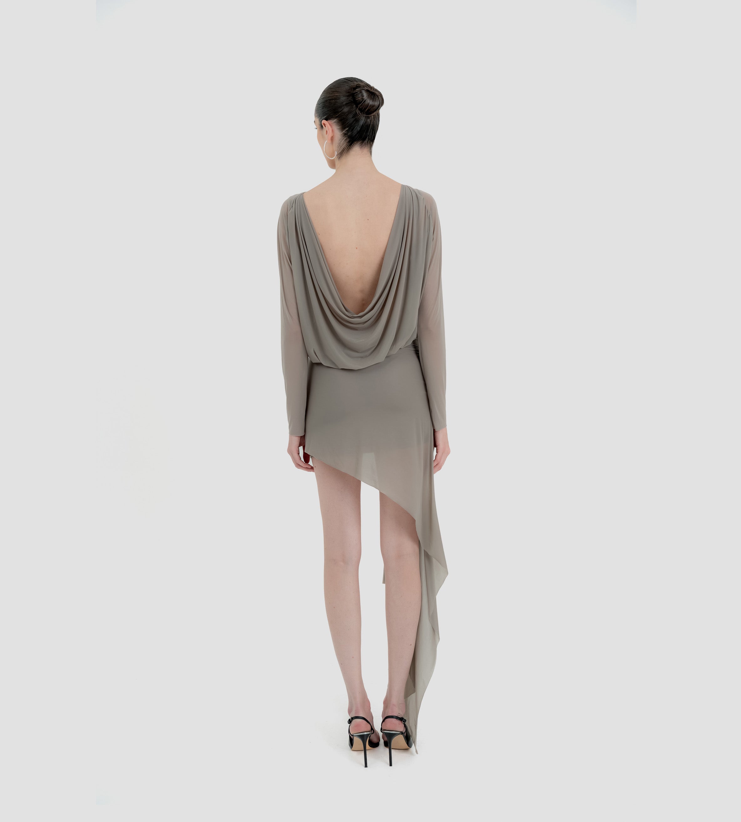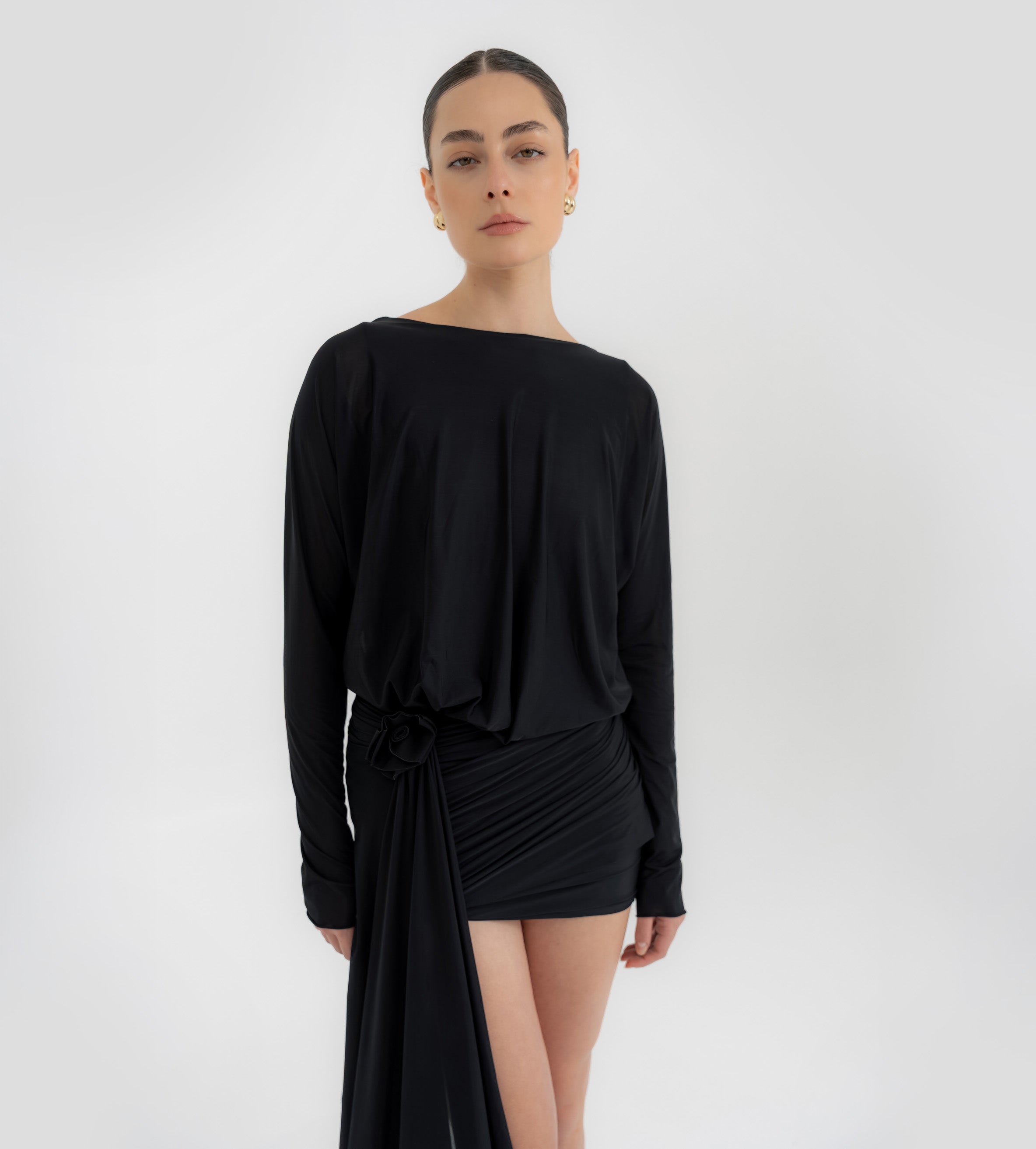 The Lumbre mini dress offers multiple styling options, featuring a bandeau neckline and a deep, draped open back framed by fitted long sleeves. The bodice softly gathers at the waist and flows into an asymmetric, ruched front skirt. A sculptural 3D floral detail completes the design, extending into a dramatic sash that adds movement to this statement piece.