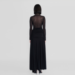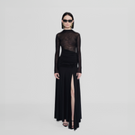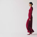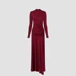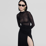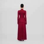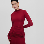 Turtleneck long dress with a second-skin feel at the top, smooth long sleeves and ruched detail from the waist to the hips, followed by a wide skirt with a front slit and 3D floral detail. For a timeless aesthetic, opt for our carmesi version, or for an alluring look, choose our black version, which features a combination of sheer fabric at the top and a stretch lycra skirt.