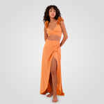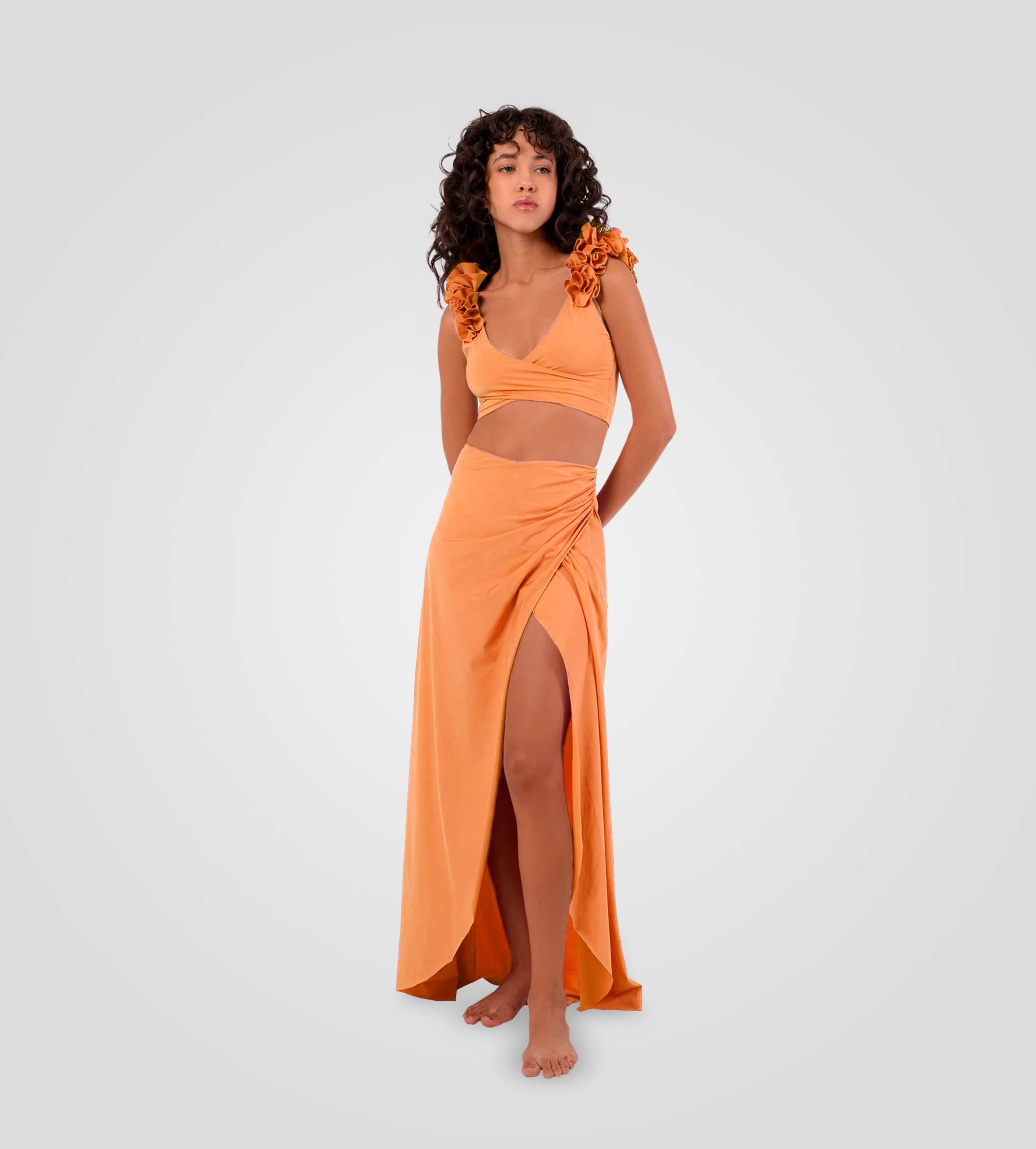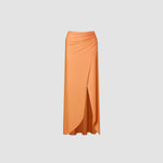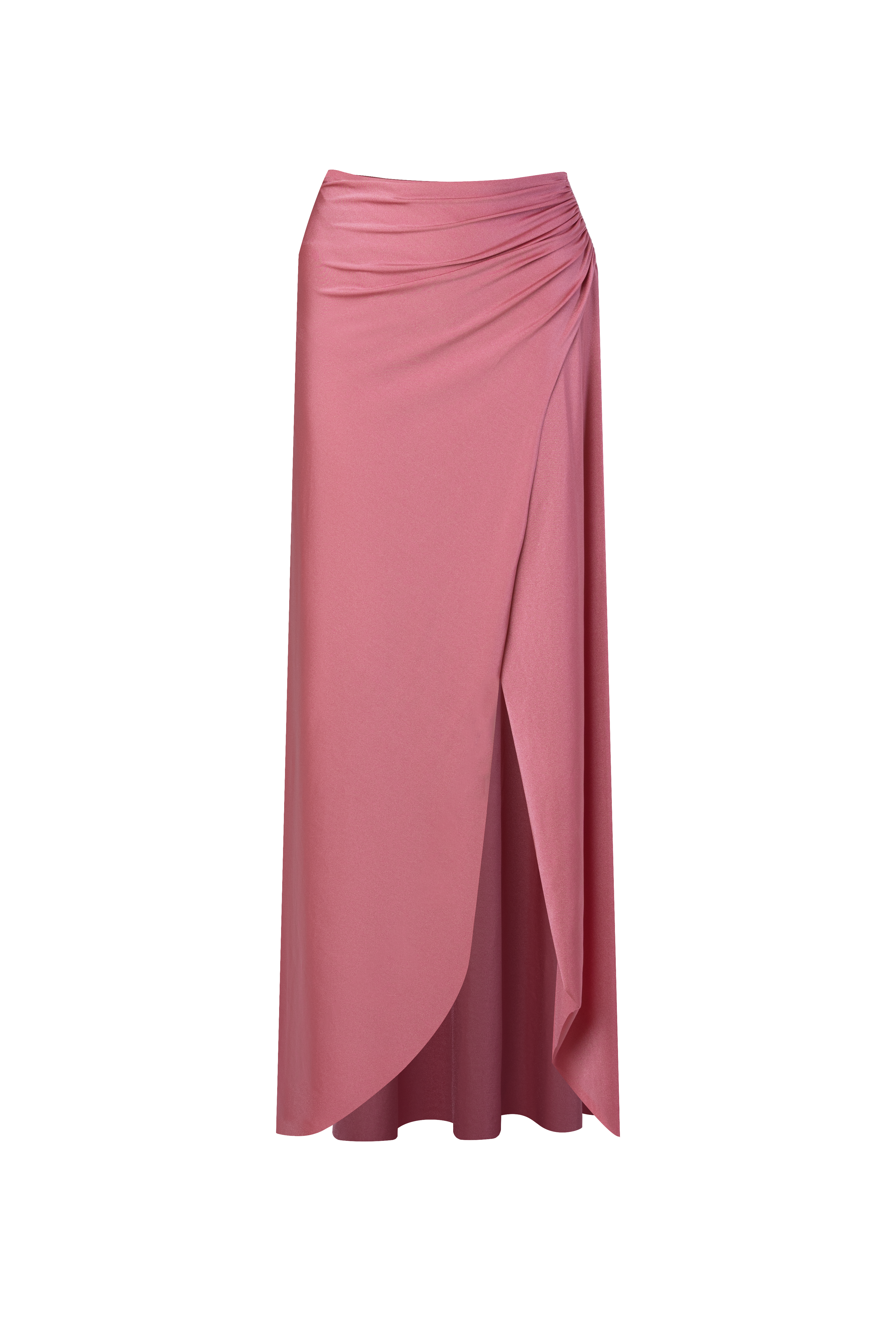 Long skirt with a ruched detail on one side and an eye-catching asymmetric wrap hem.