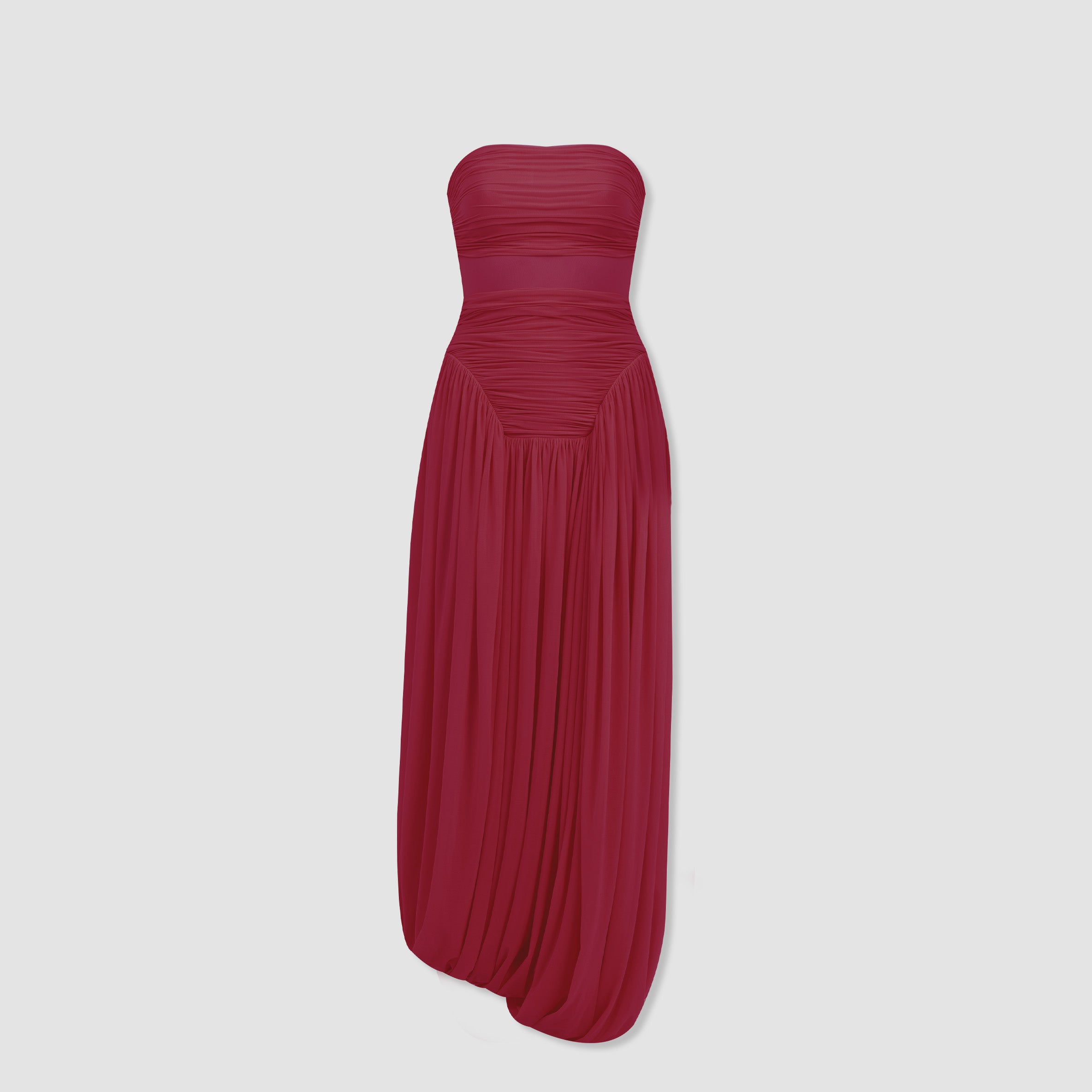The MAY DRESS LONG — LIMITED EDITION features a strapless neckline that leads into a soft draped design that wraps around the body and extends to a gathered back. A draped layer falls from the waist, creating a subtle cascading effect that flows naturally into a long, waterfall-style draped skirt, evoking timeless sophistication.