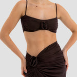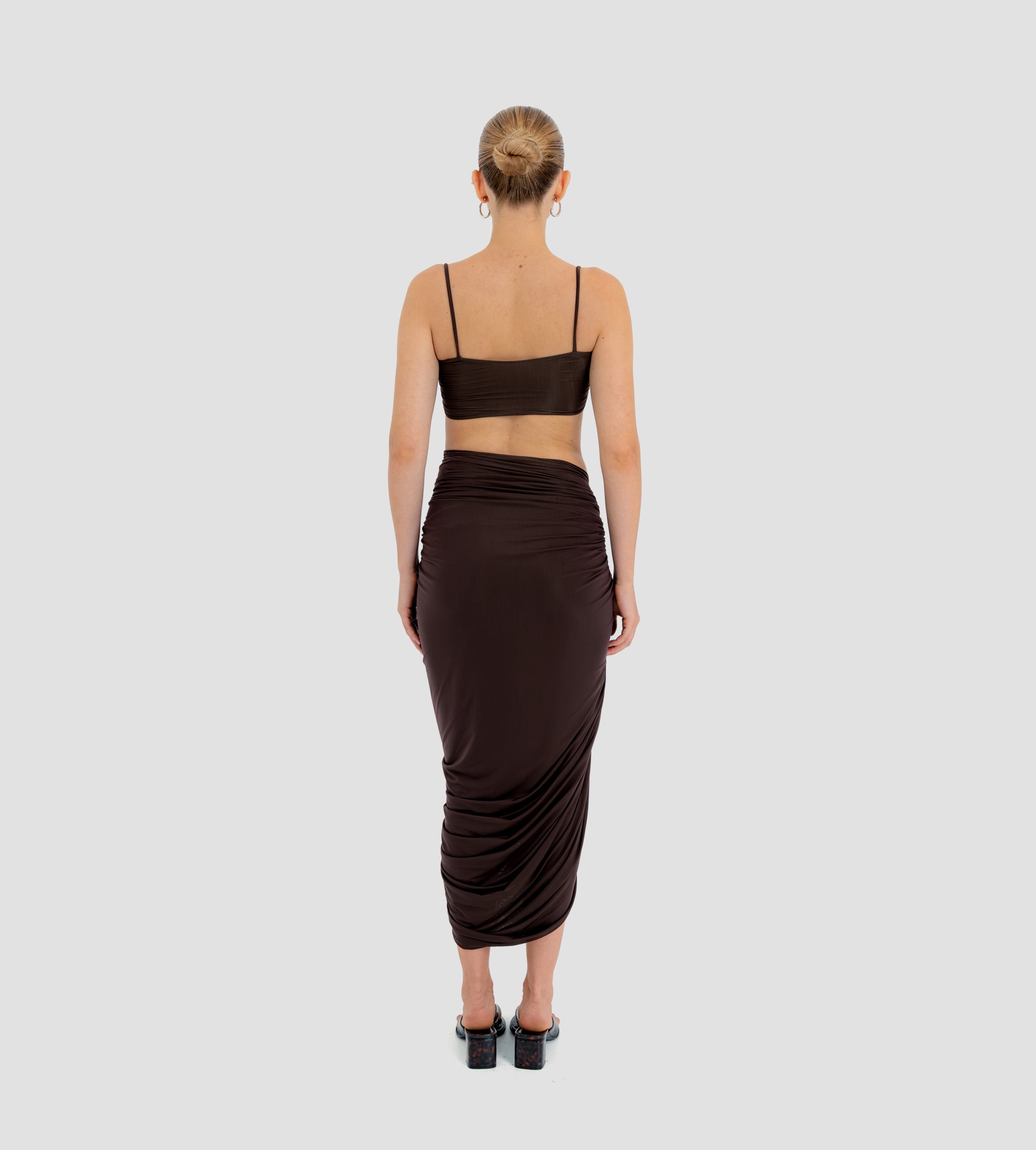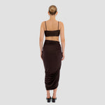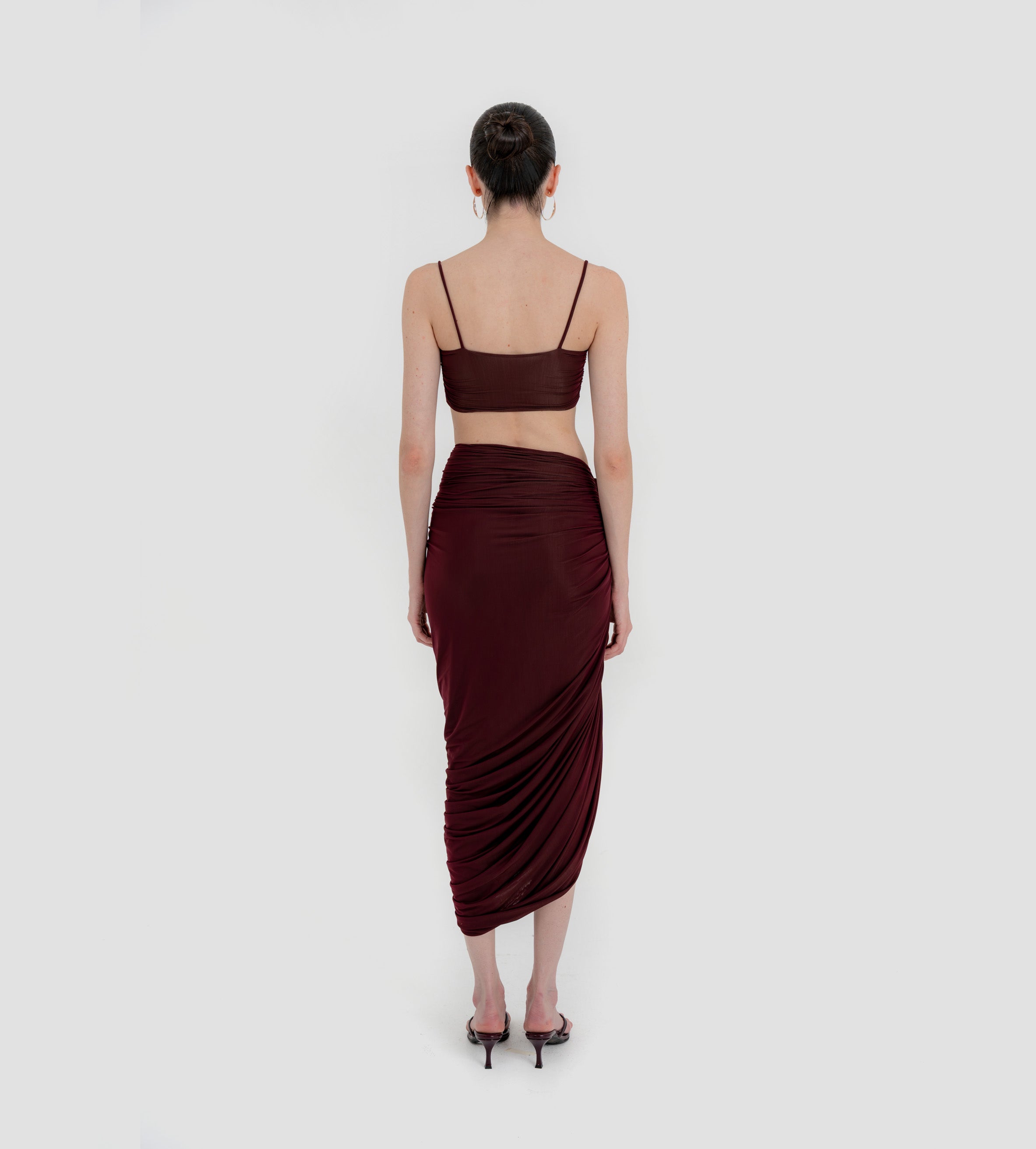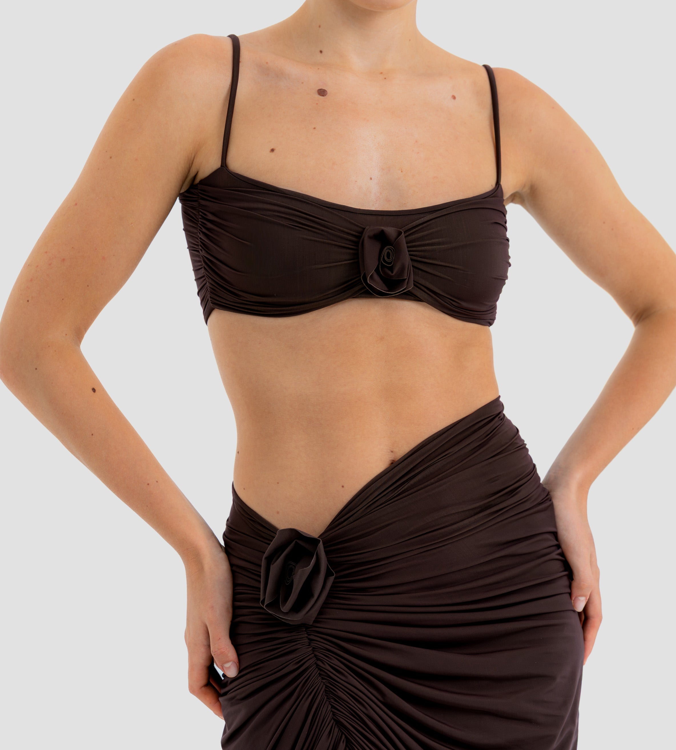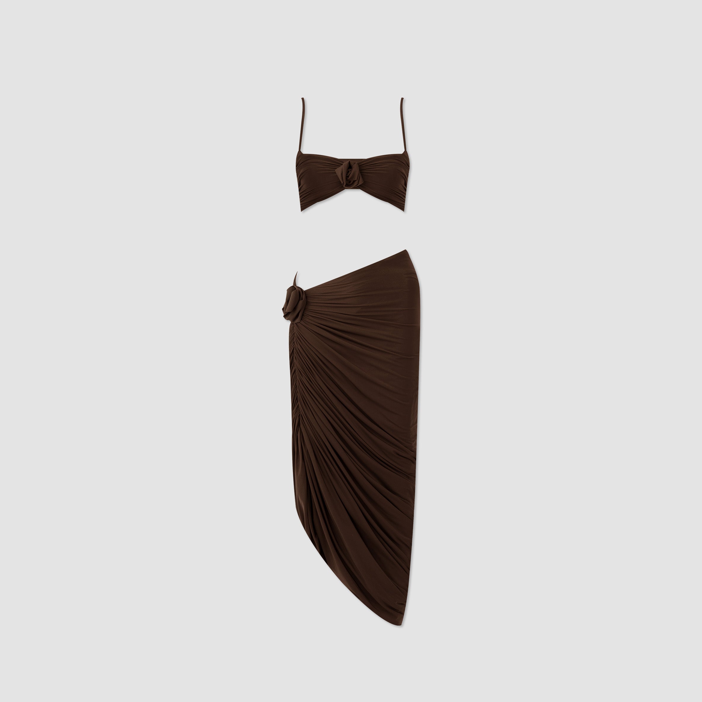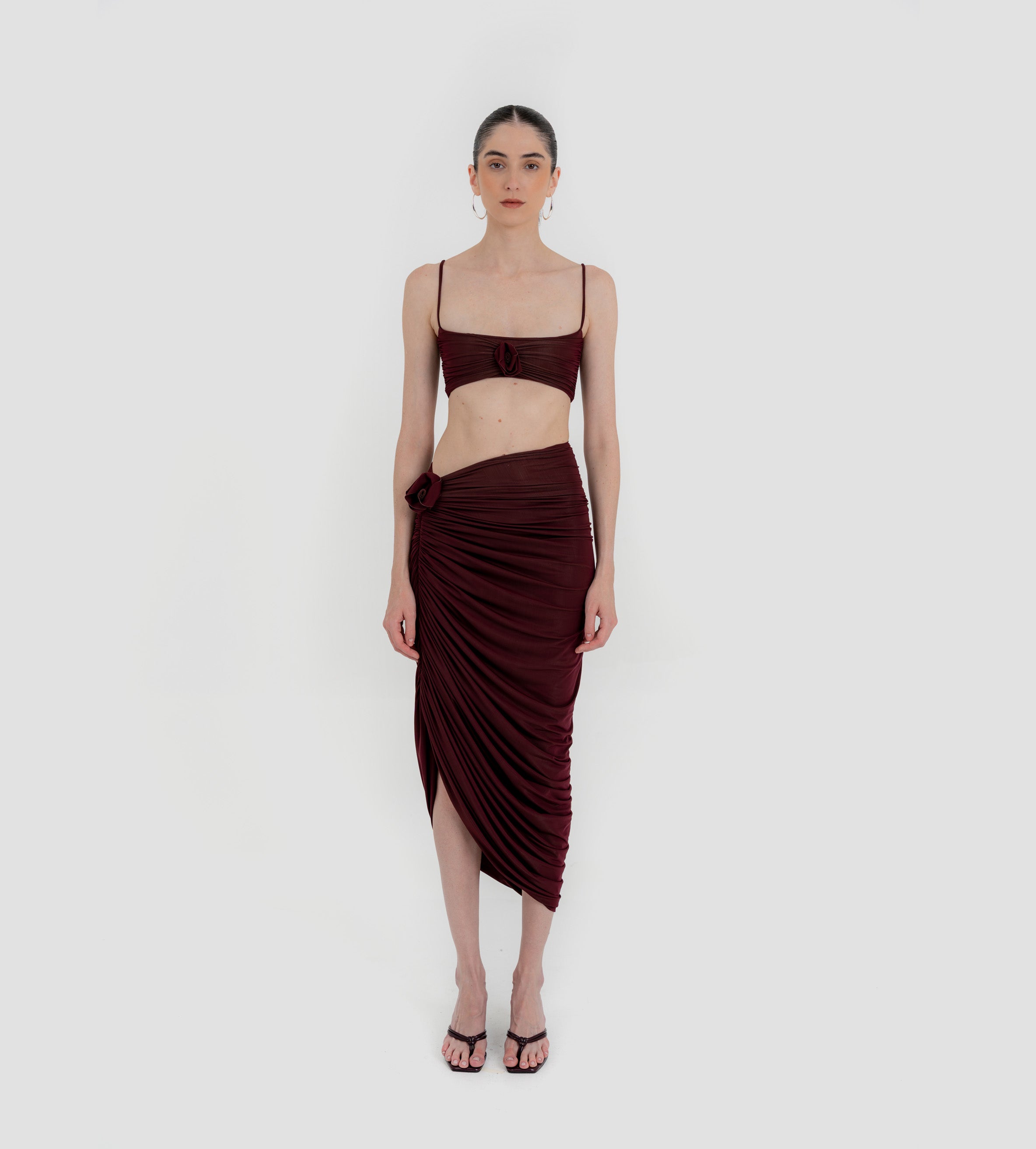 Our Medusa set features a soft straight neckline top framed by delicate thin straps. Crafted with a double-layered front, the first layer provides a smooth, fitted base, while the second features bold ruching and a central 3D floral detail. The look is paired with an asymmetric midi skirt that gathers and drapes from the side and is enhance by a delicate 3D floral embellishment.