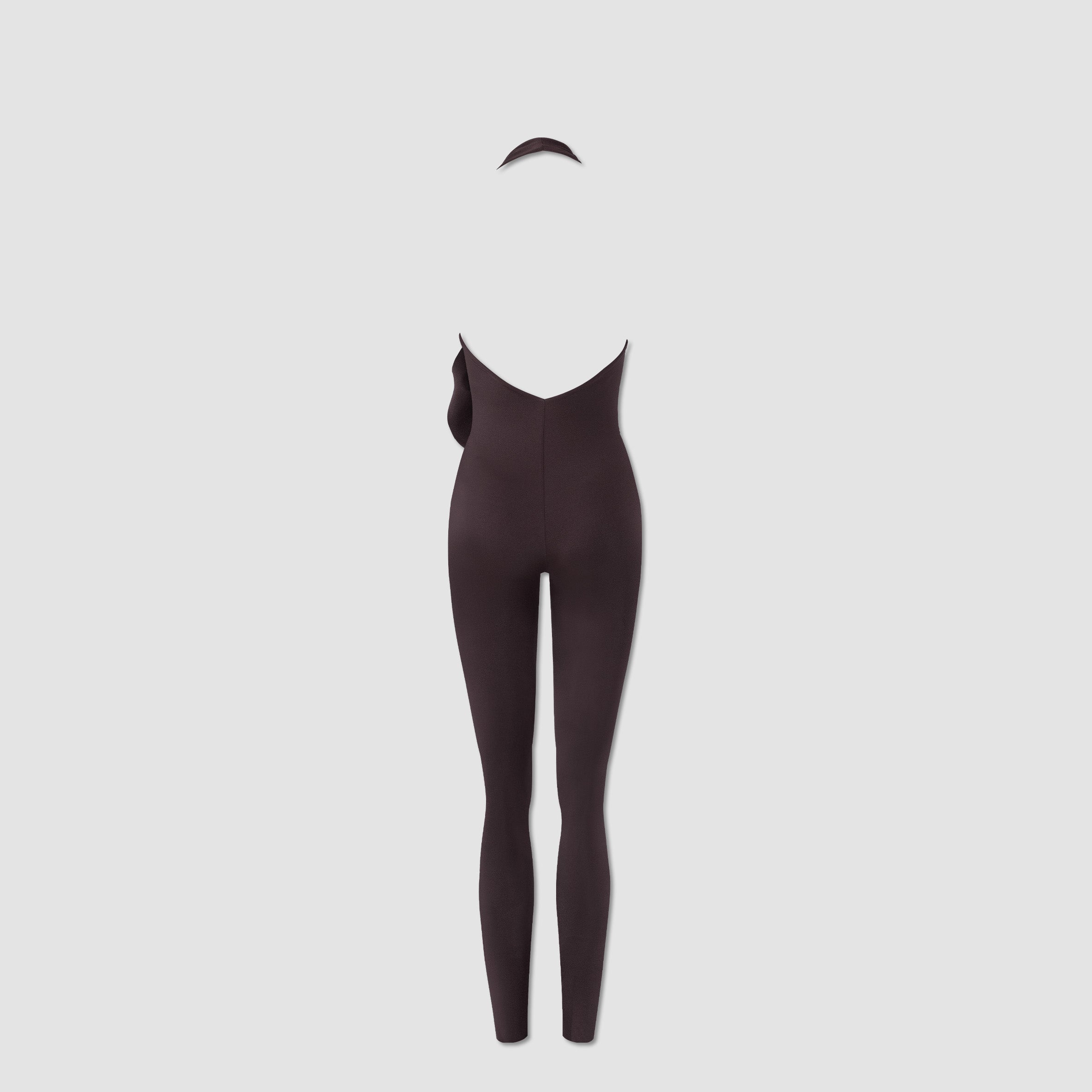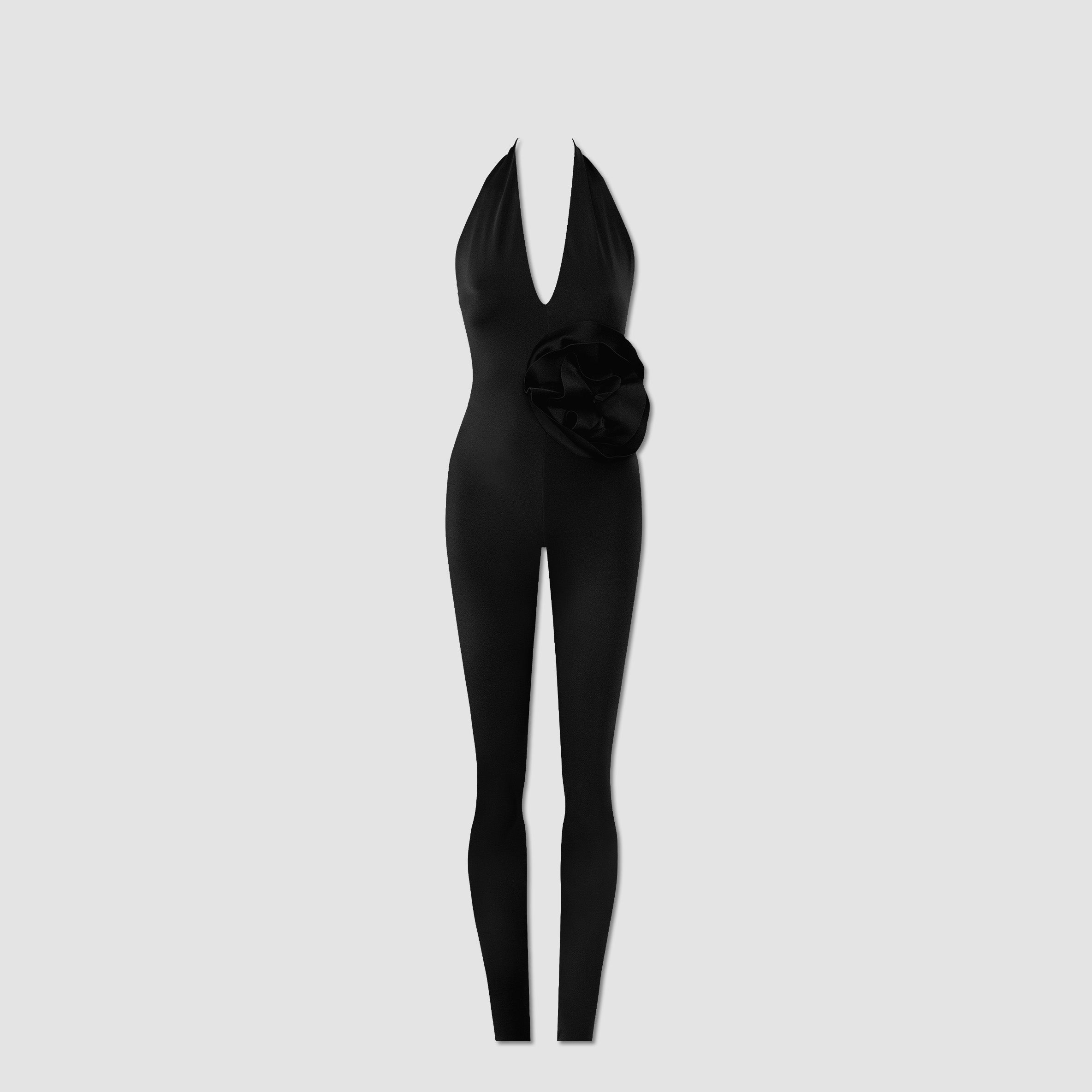 Fitted jumpsuit with a plunging neckline and voluminous floral detail at the waist, adding a sophisticated and feminine touch.