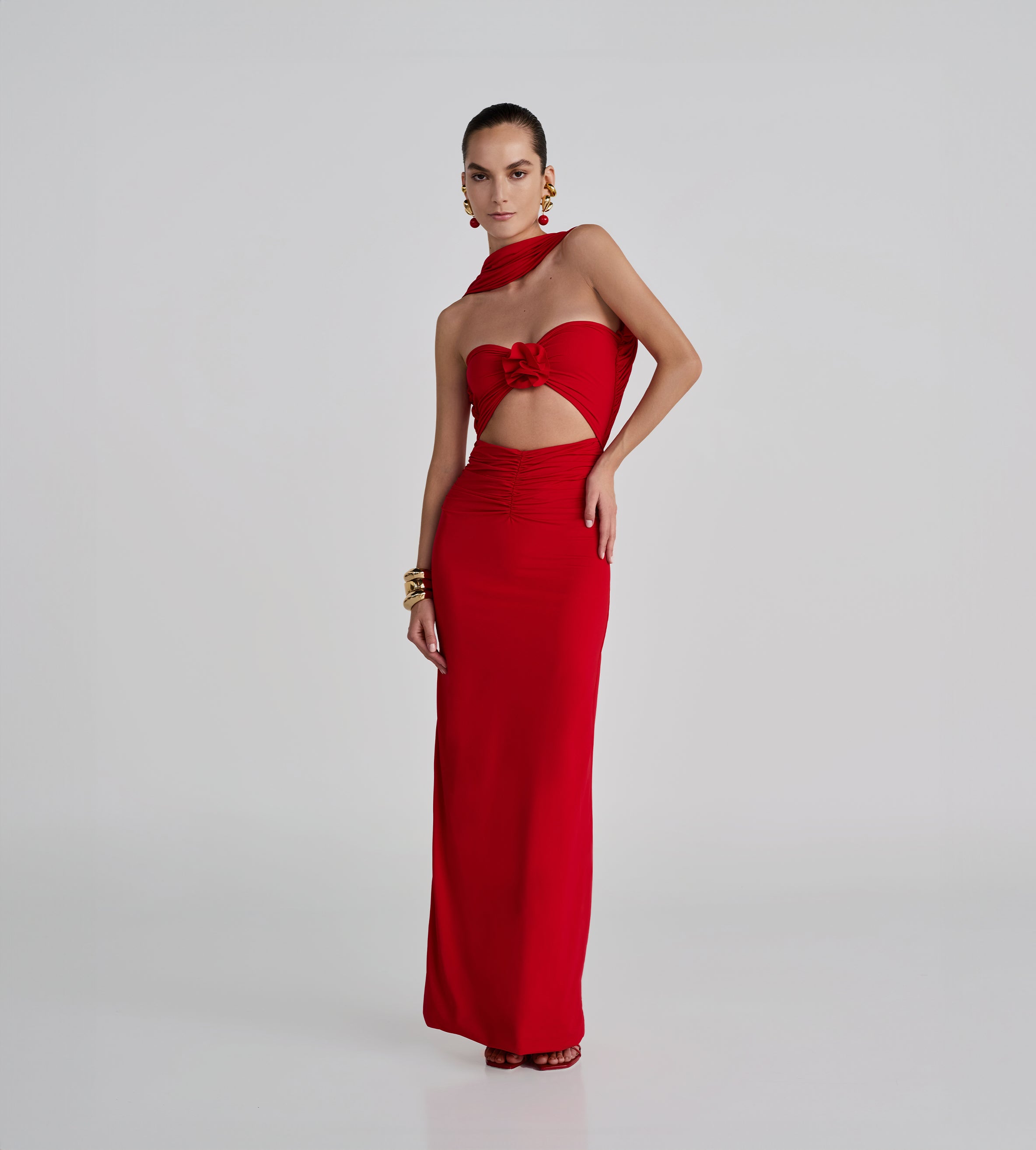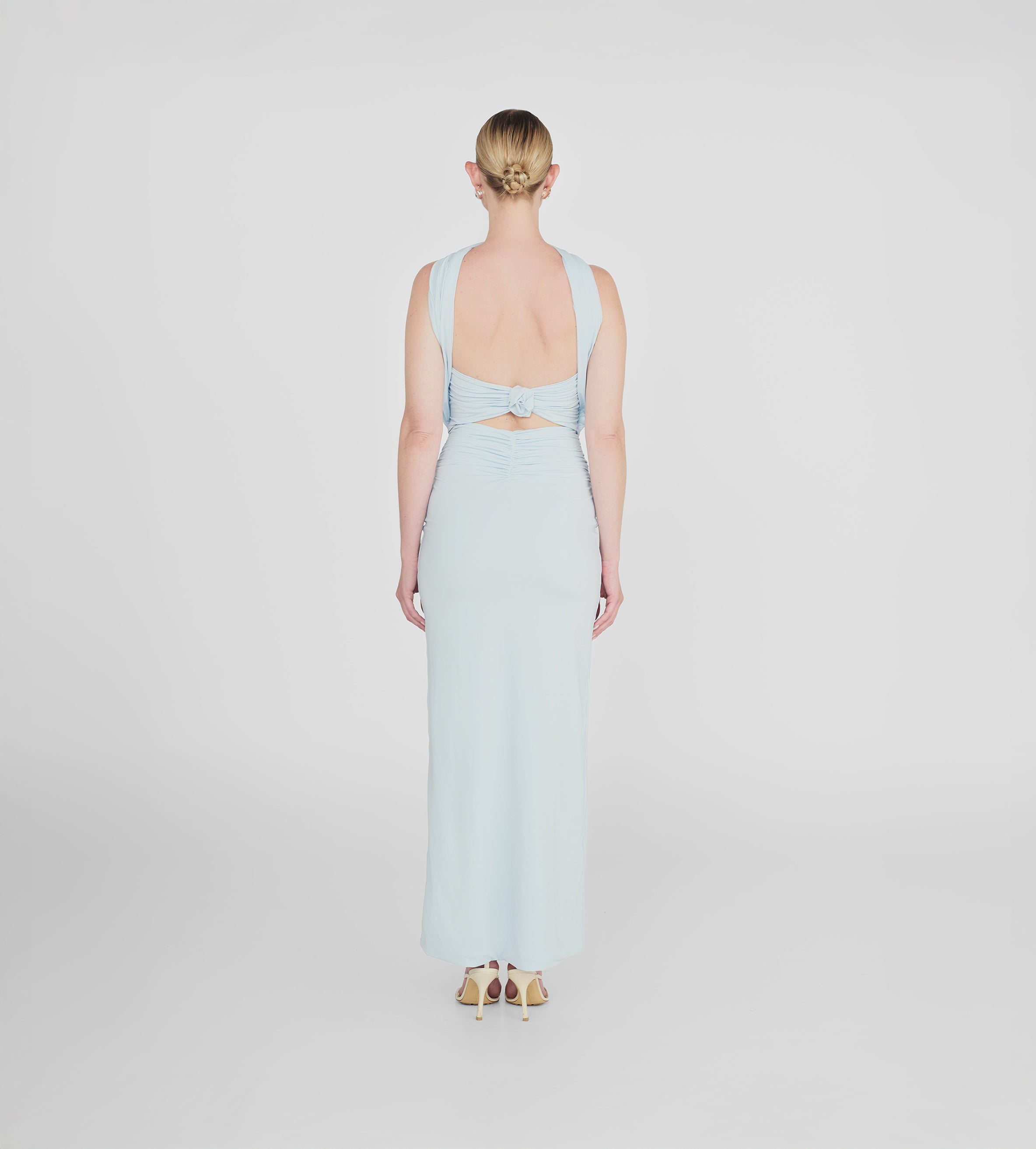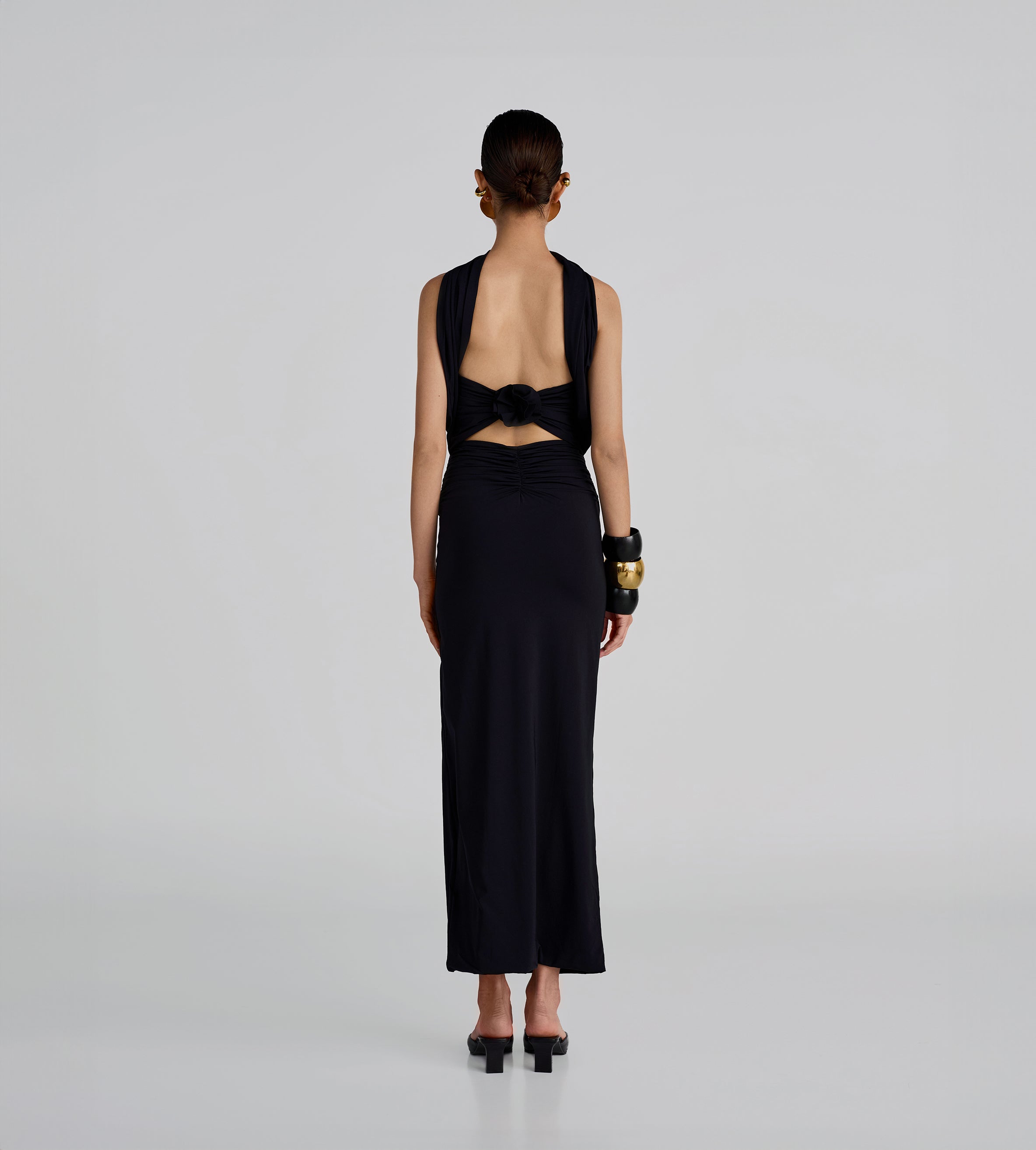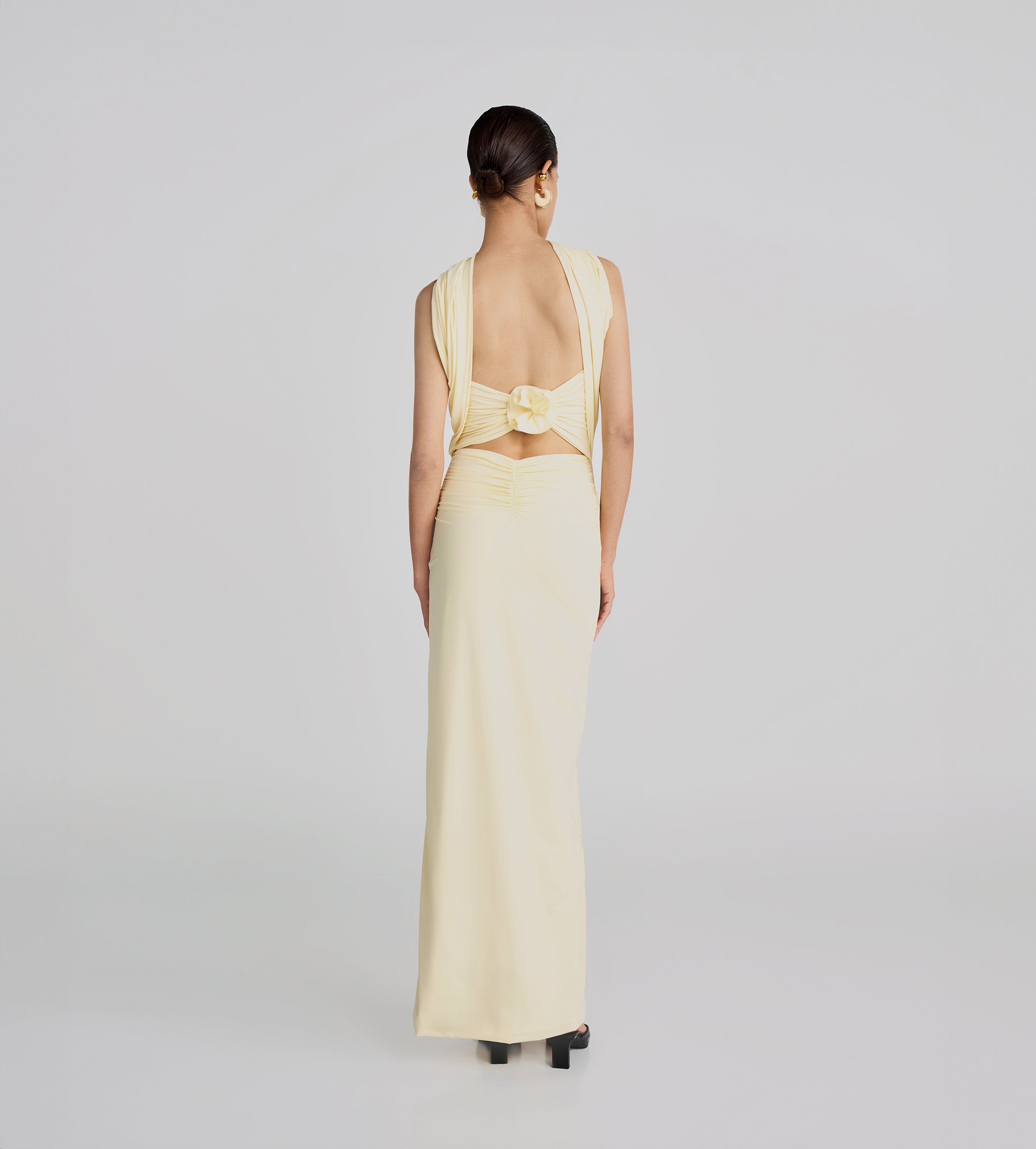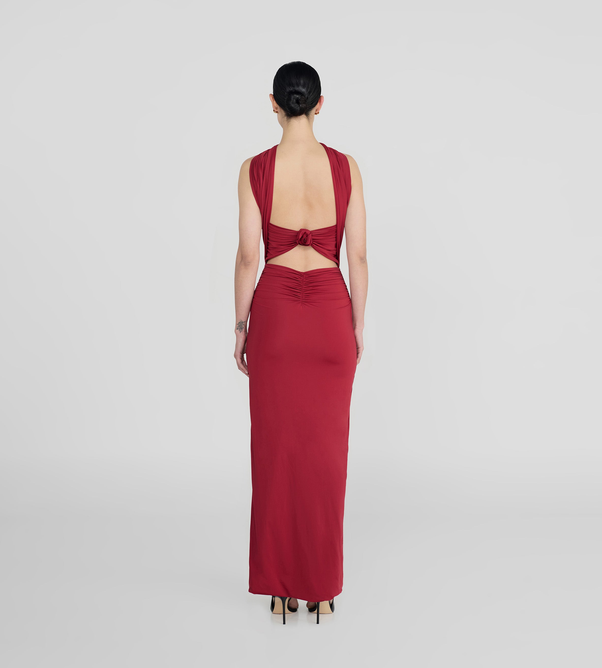 Playful and versatile, our Mulett long dress offers multiple styling options. Take your creativity to the next level and show us your favorite way to wear it! Featuring a straight neckline fitted ruched silhouette, multifunctional sash/straps detail, cut-out open back and 3D handmade floral detail, we provide you with 4 styling options — let's discover even more.