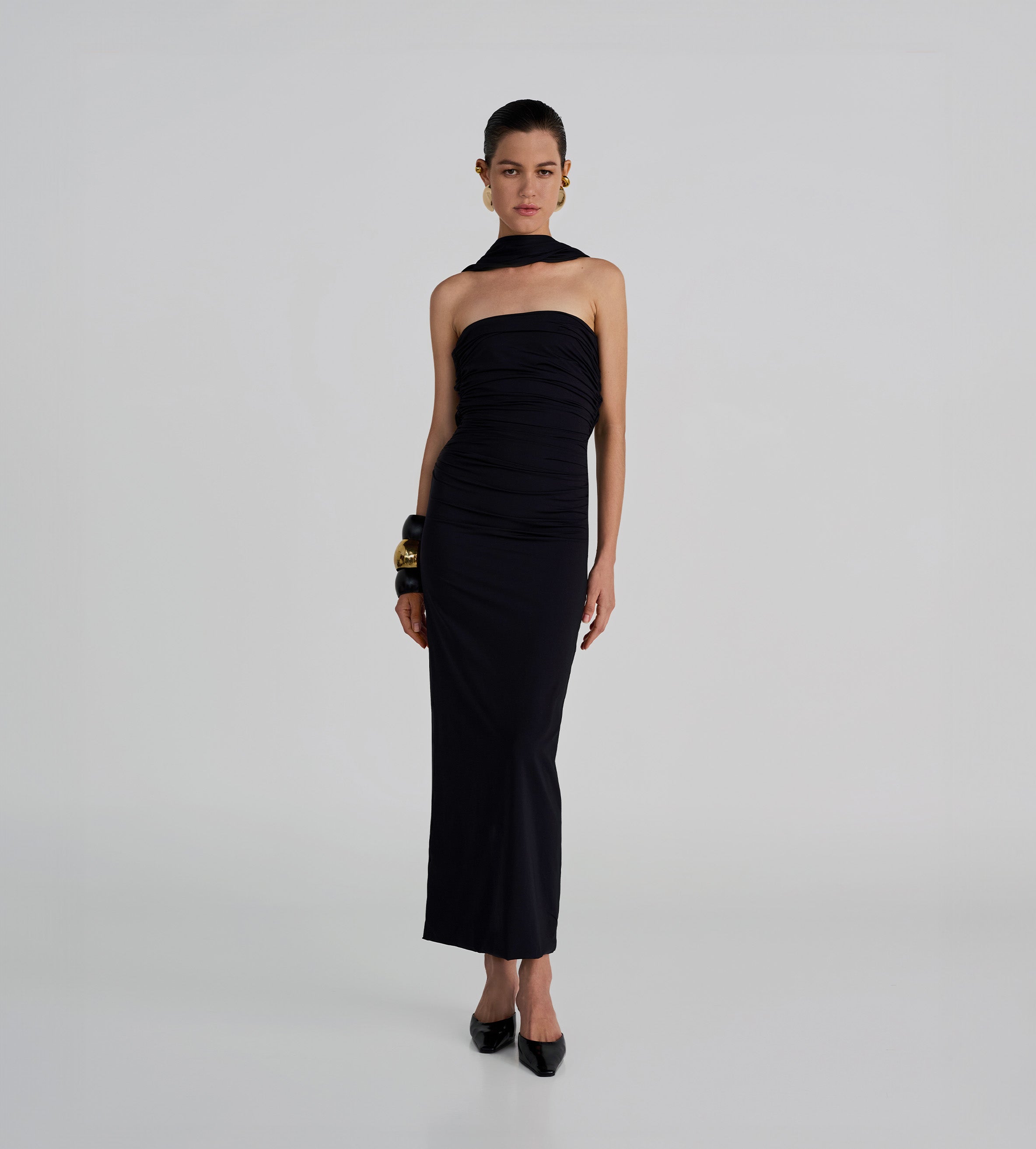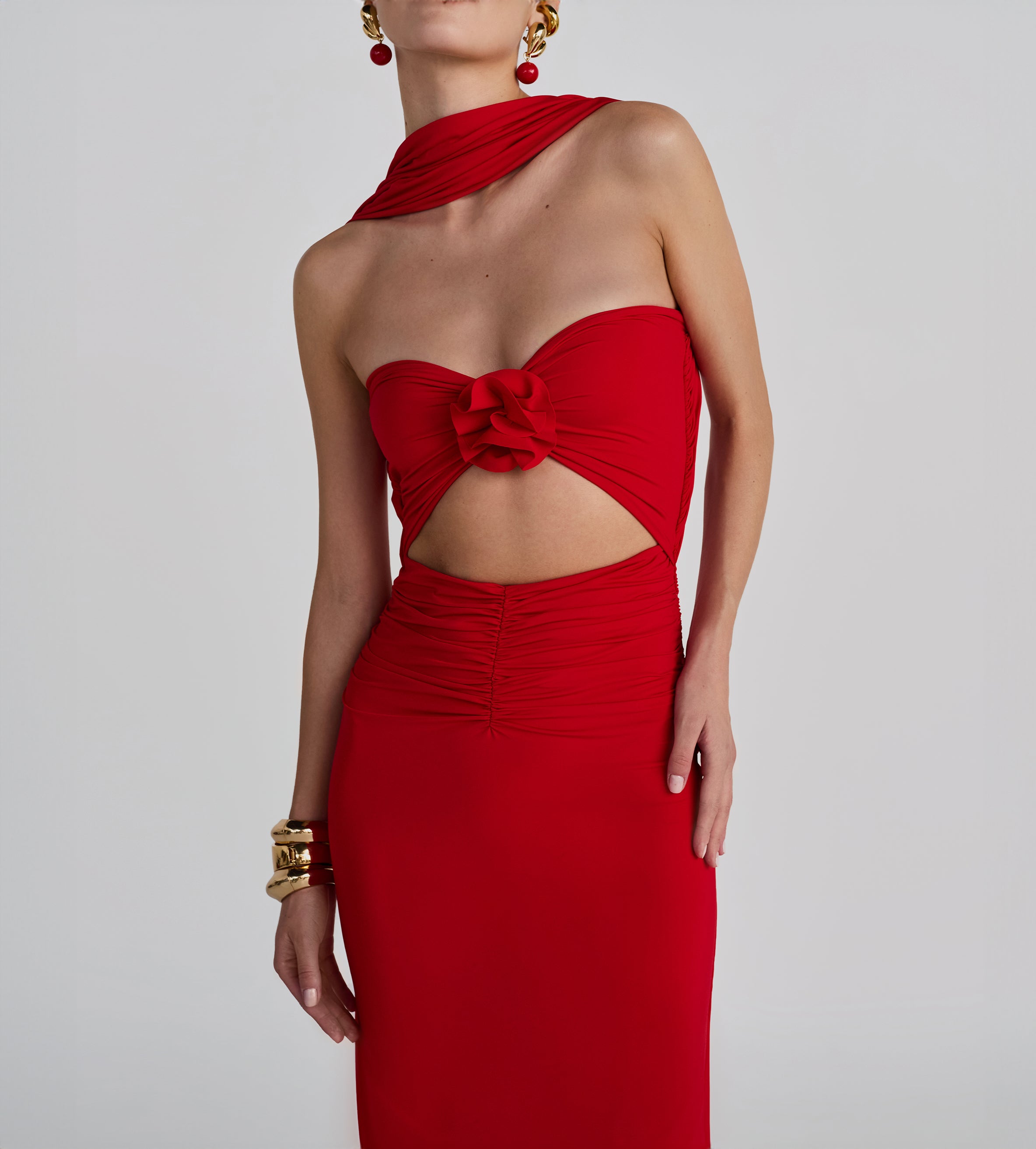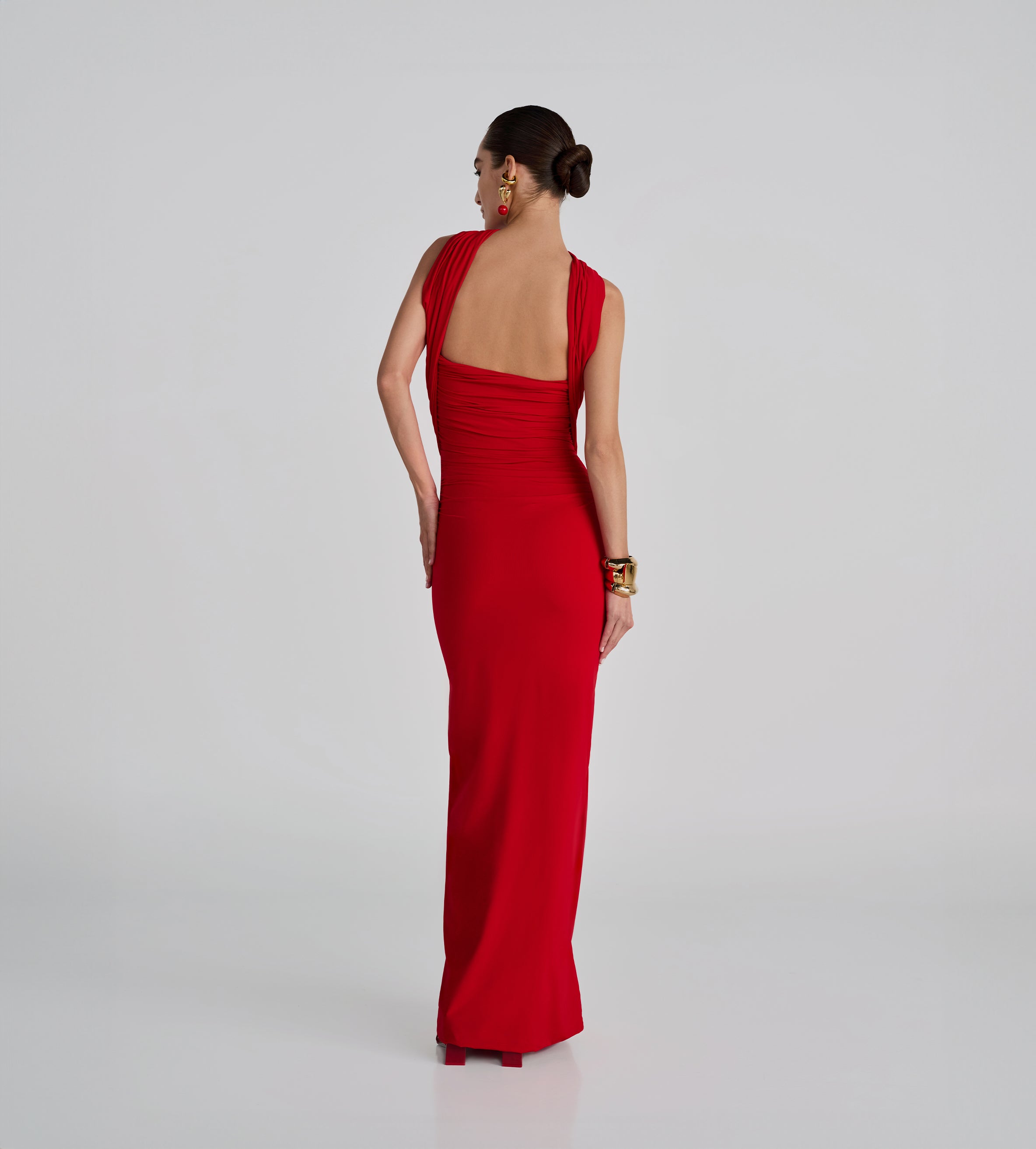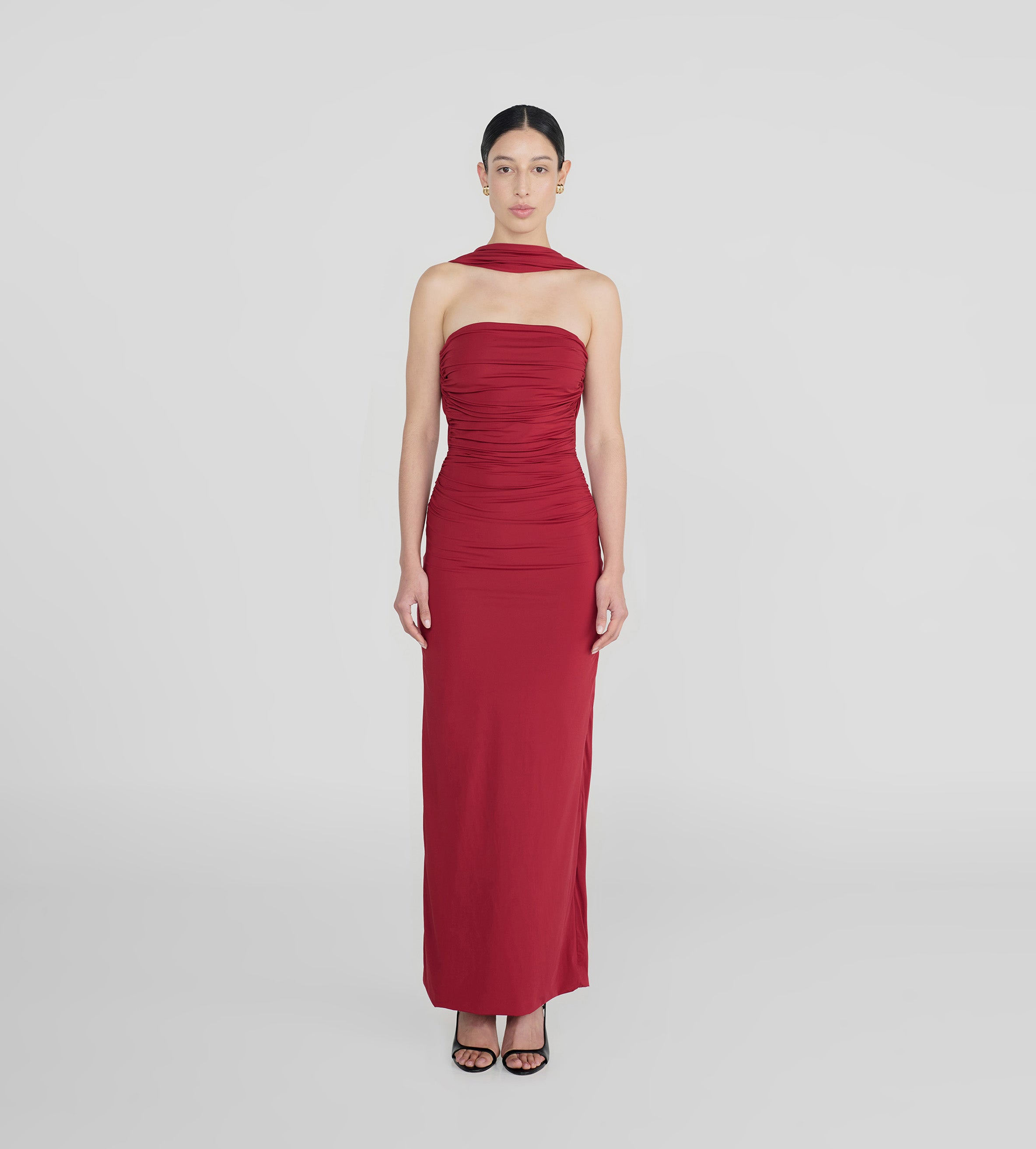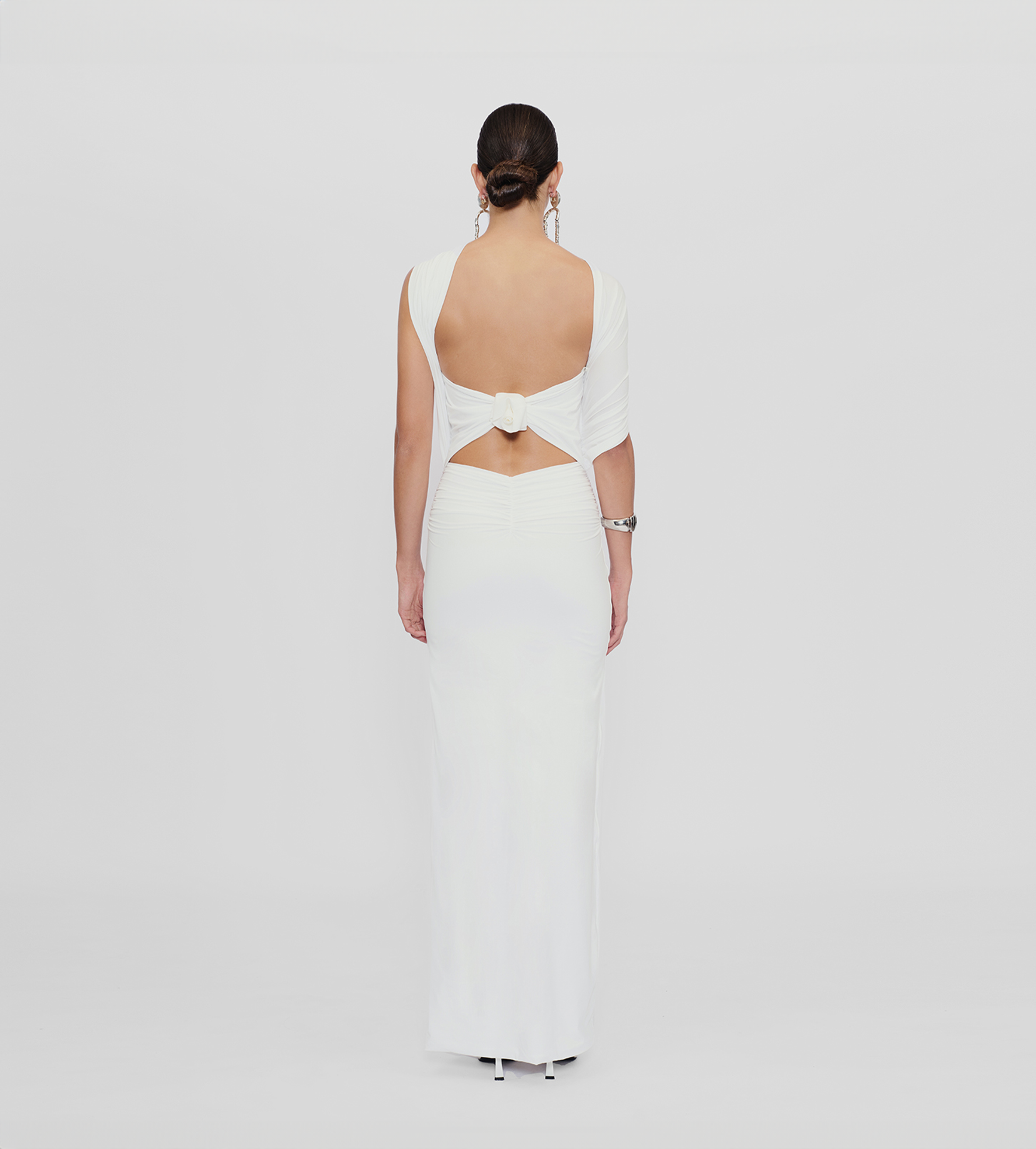 Playful and versatile, our Mulett long dress offers multiple styling options. Take your creativity to the next level and show us your favorite way to wear it! Featuring a straight neckline fitted ruched silhouette, multifunctional sash/straps detail, cut-out open back and 3D handmade floral detail, we provide you with 4 styling options — let's discover even more.