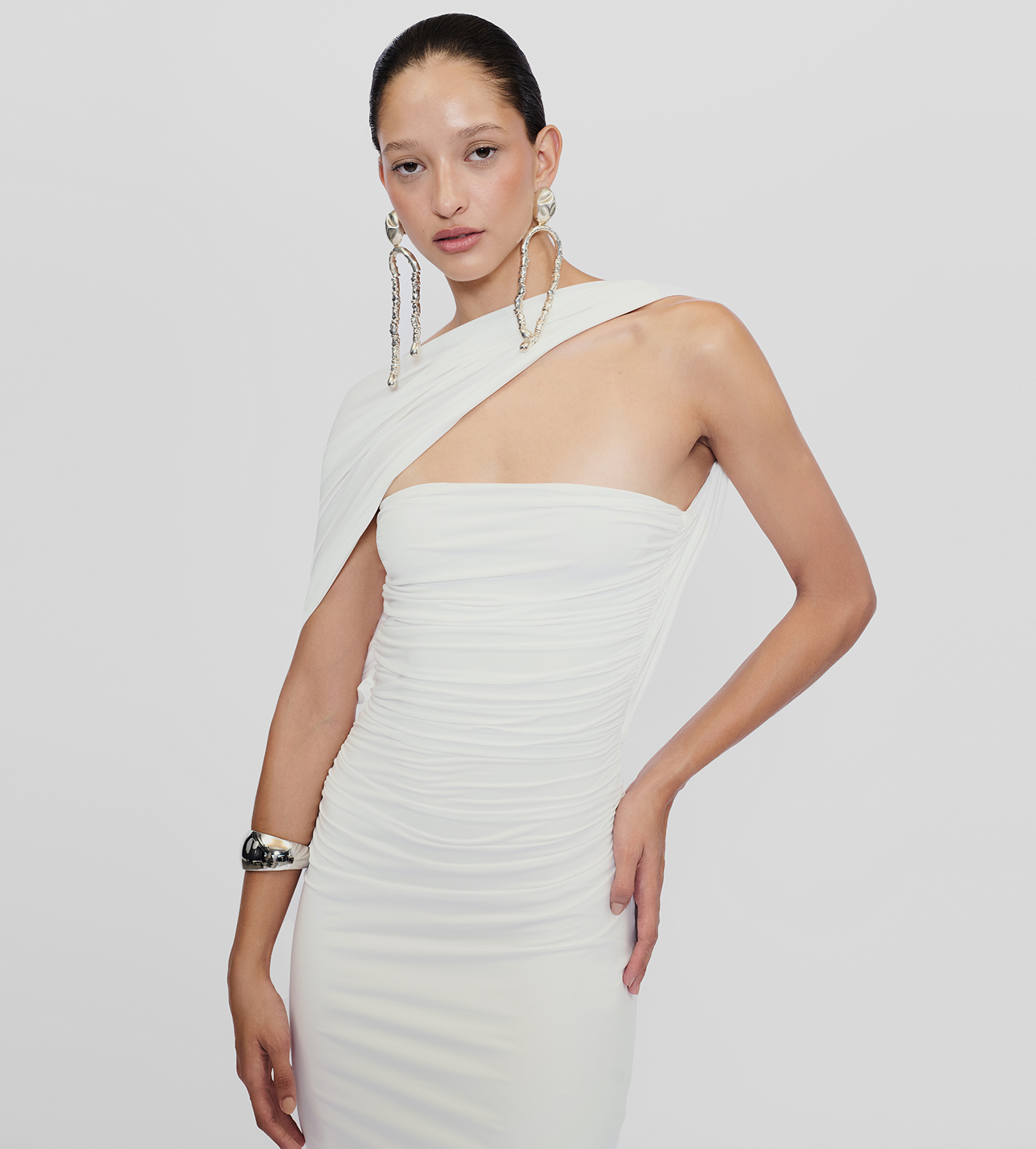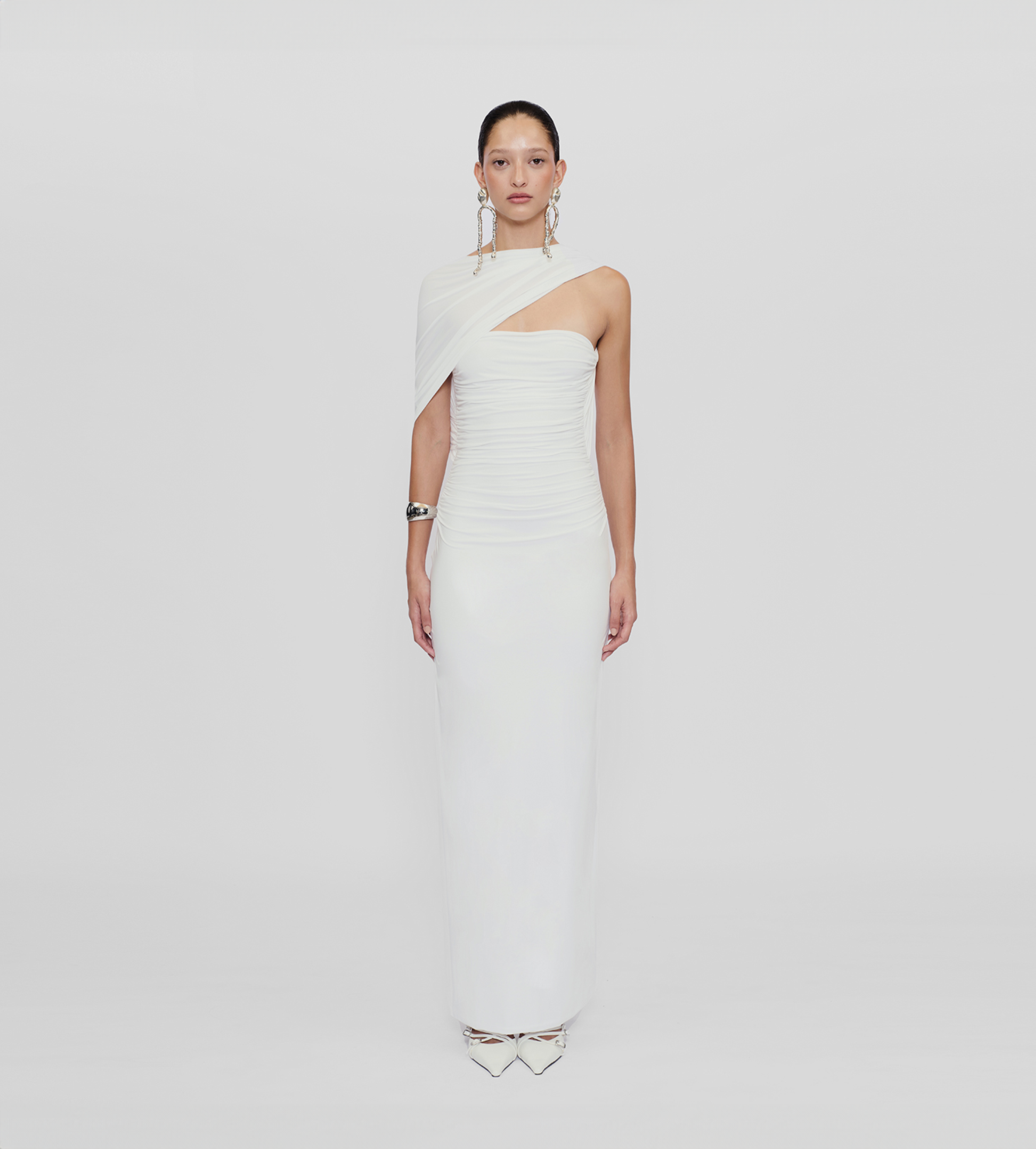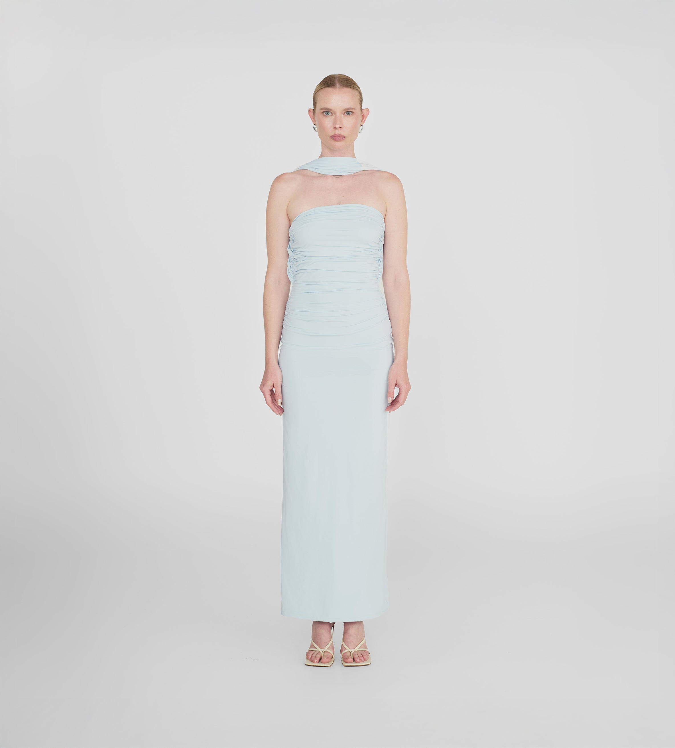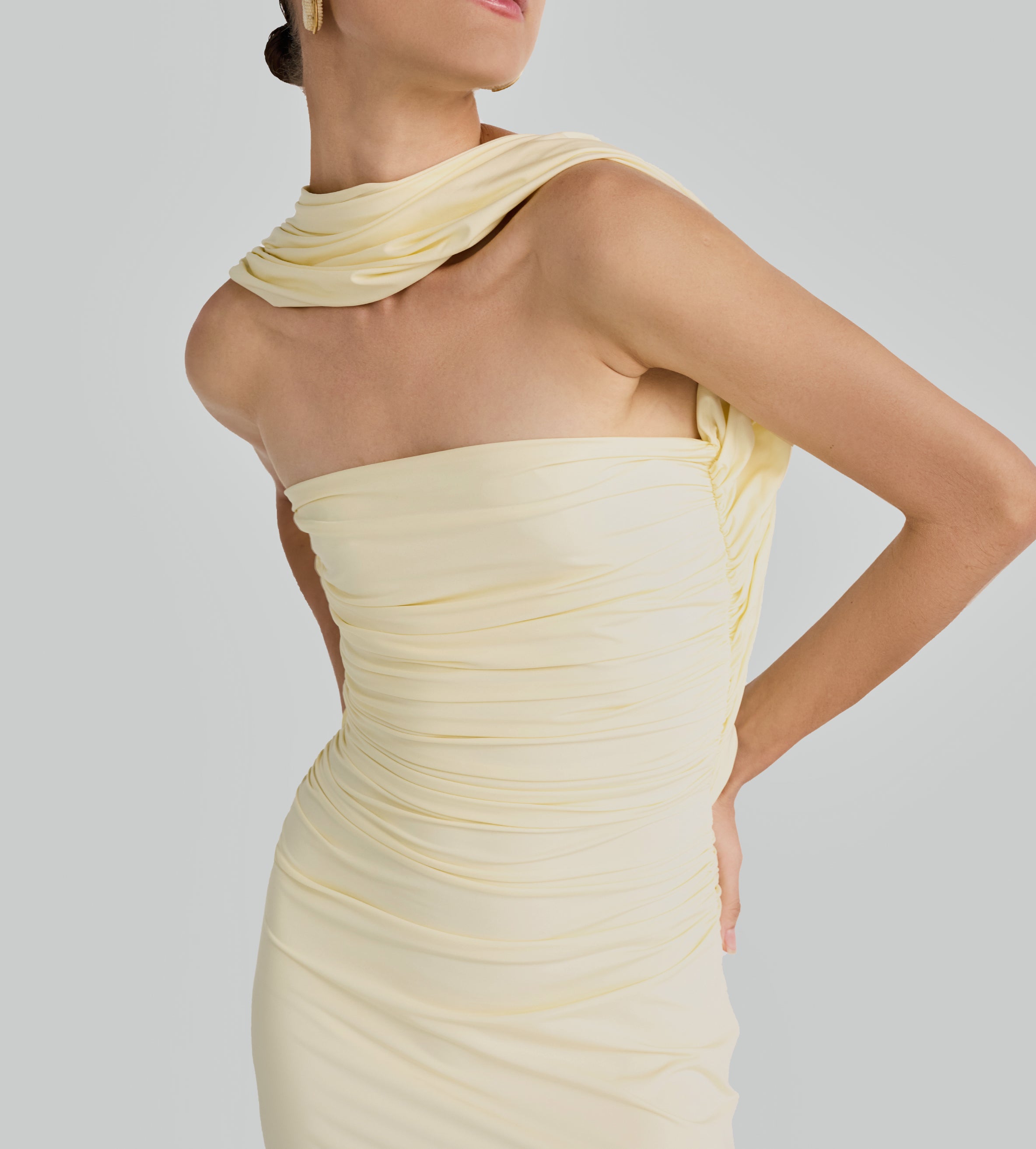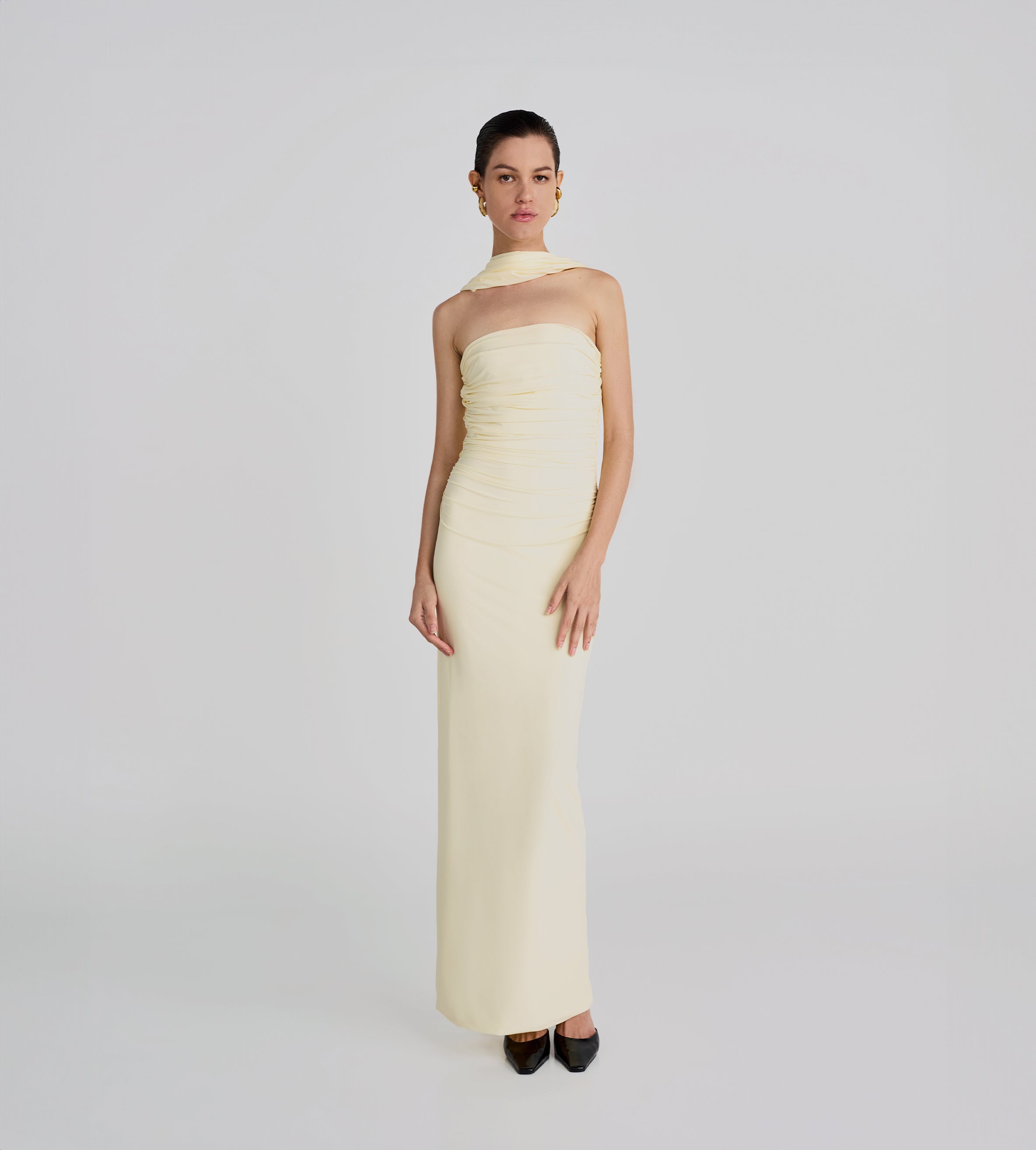 Playful and versatile, our Mulett long dress offers multiple styling options. Take your creativity to the next level and show us your favorite way to wear it! Featuring a straight neckline fitted ruched silhouette, multifunctional sash/straps detail, cut-out open back and 3D handmade floral detail, we provide you with 4 styling options — let's discover even more.