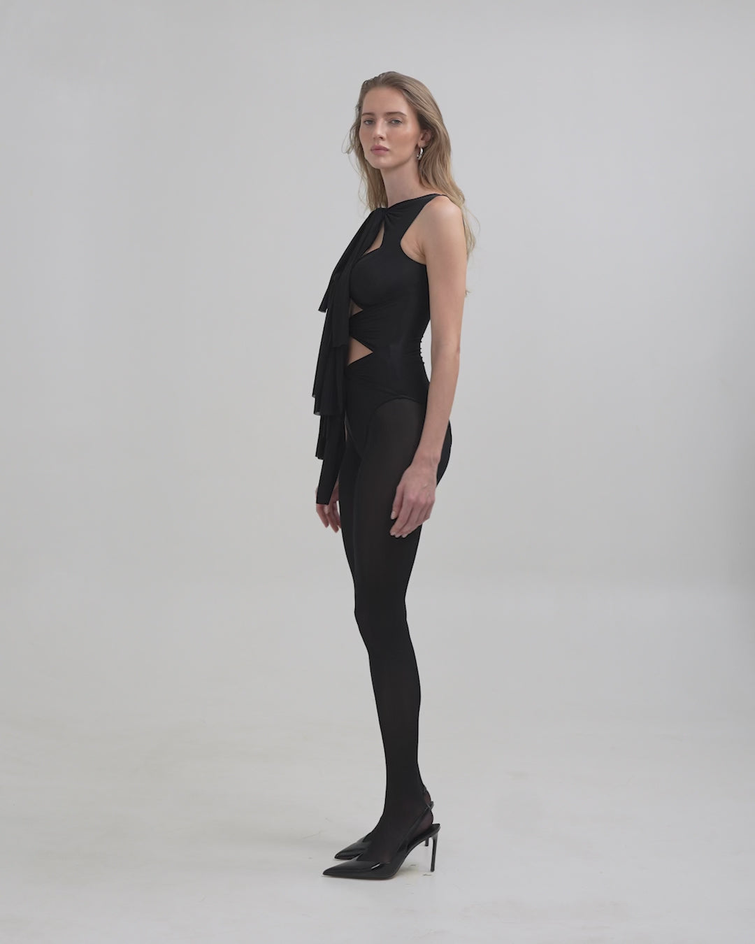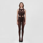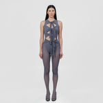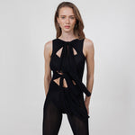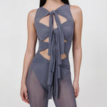 The Nebbia top is the ultimate statement piece, featuring a soft round neckline and four adjustable central knots that flow over captivating cut outs in a playful arrangement. Its modern, sleek back brings perfect balance to the design’s bold femininity.