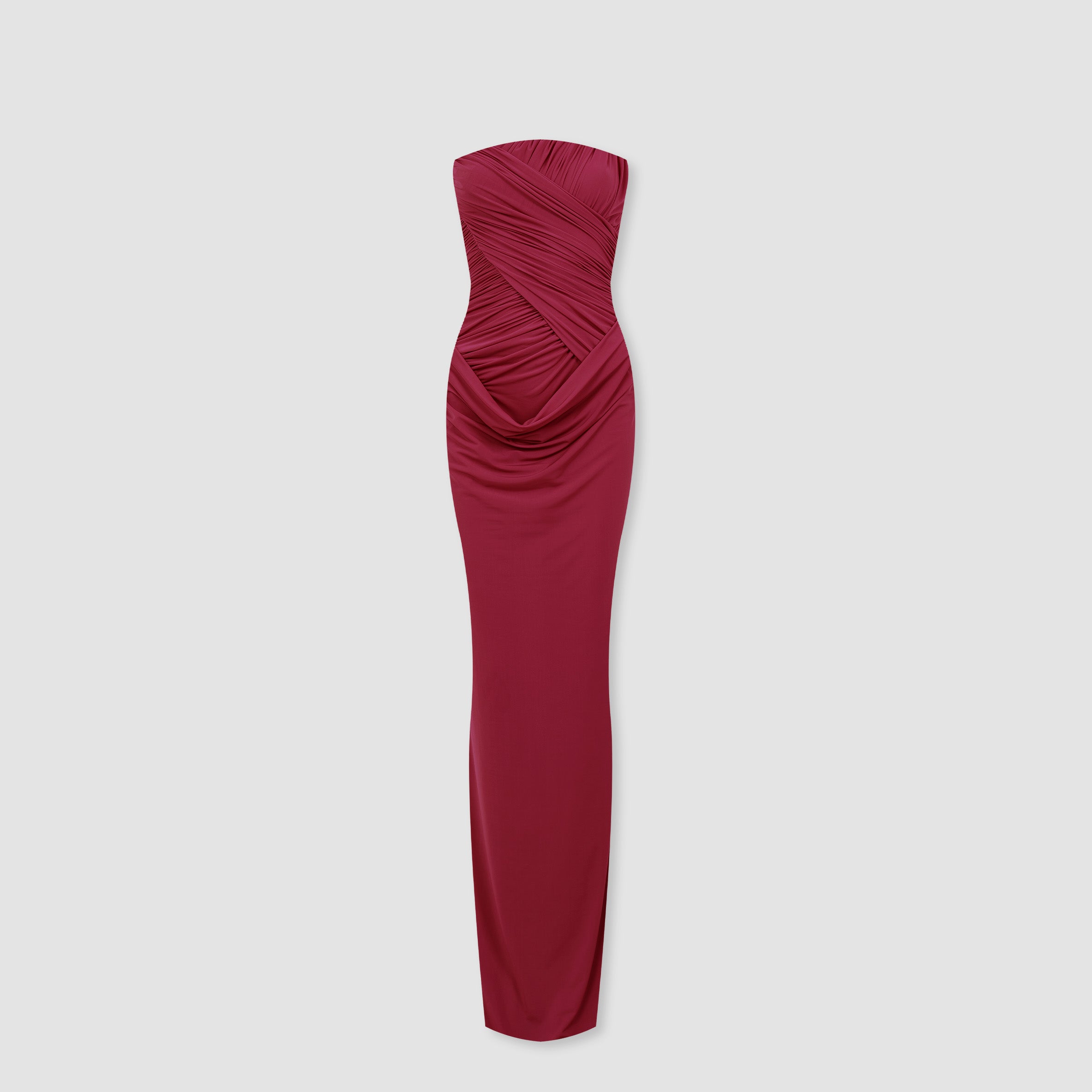 The long Noel dress features a strapless neckline that leads into a soft draping that wraps around the body in various directions, continuing into a gathered back. A draped layer falls from the waist, creating a subtle cascading effect that flows naturally into a long, sleek column-style skirt, evoking timeless sophistication.