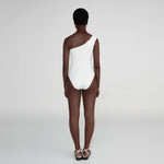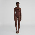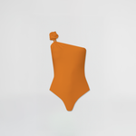 One-shoulder asymmetric one-piece with a 3D handmade flower detail, a sophisticated yet classical look perfect to be worn on every occasion.