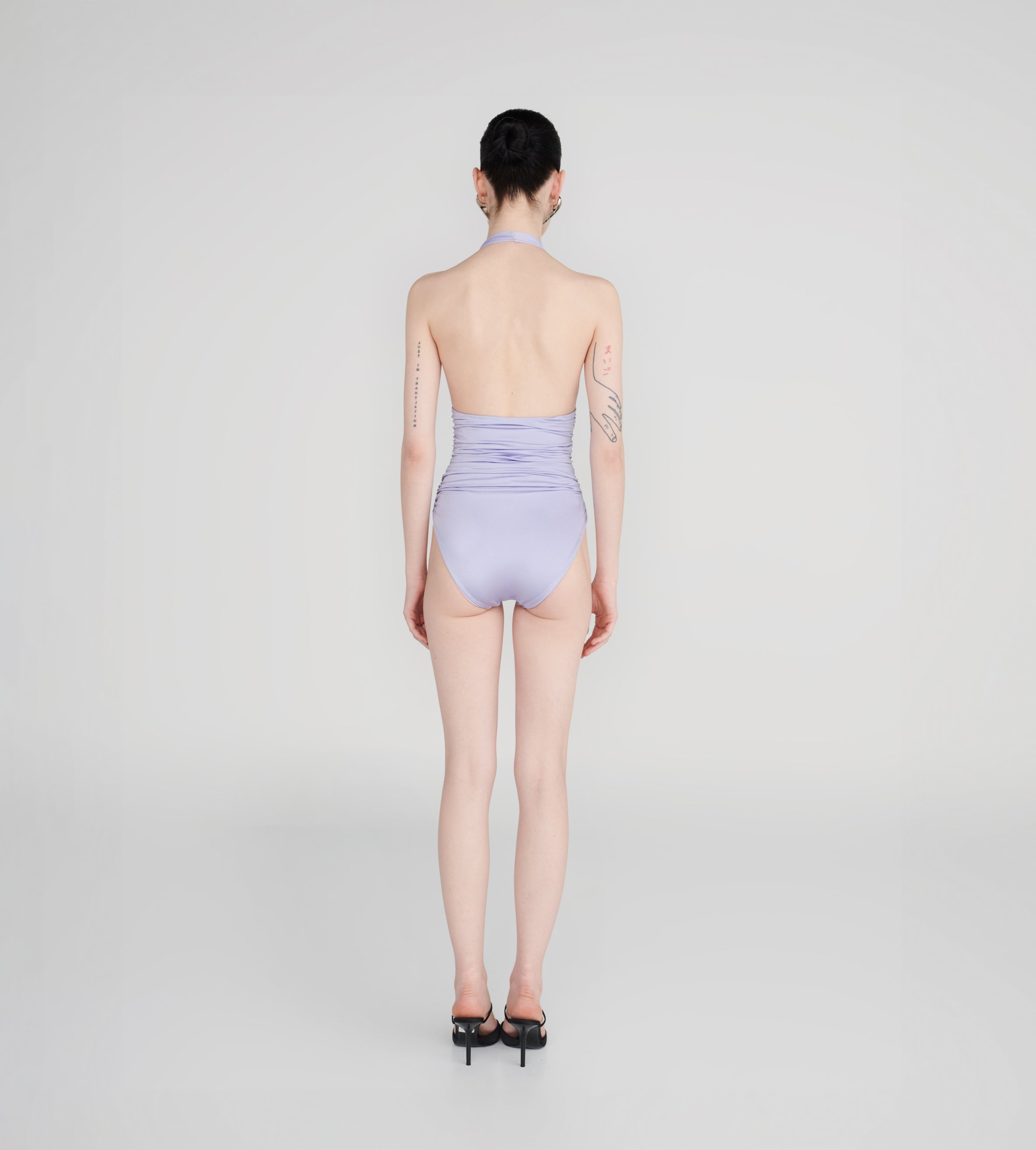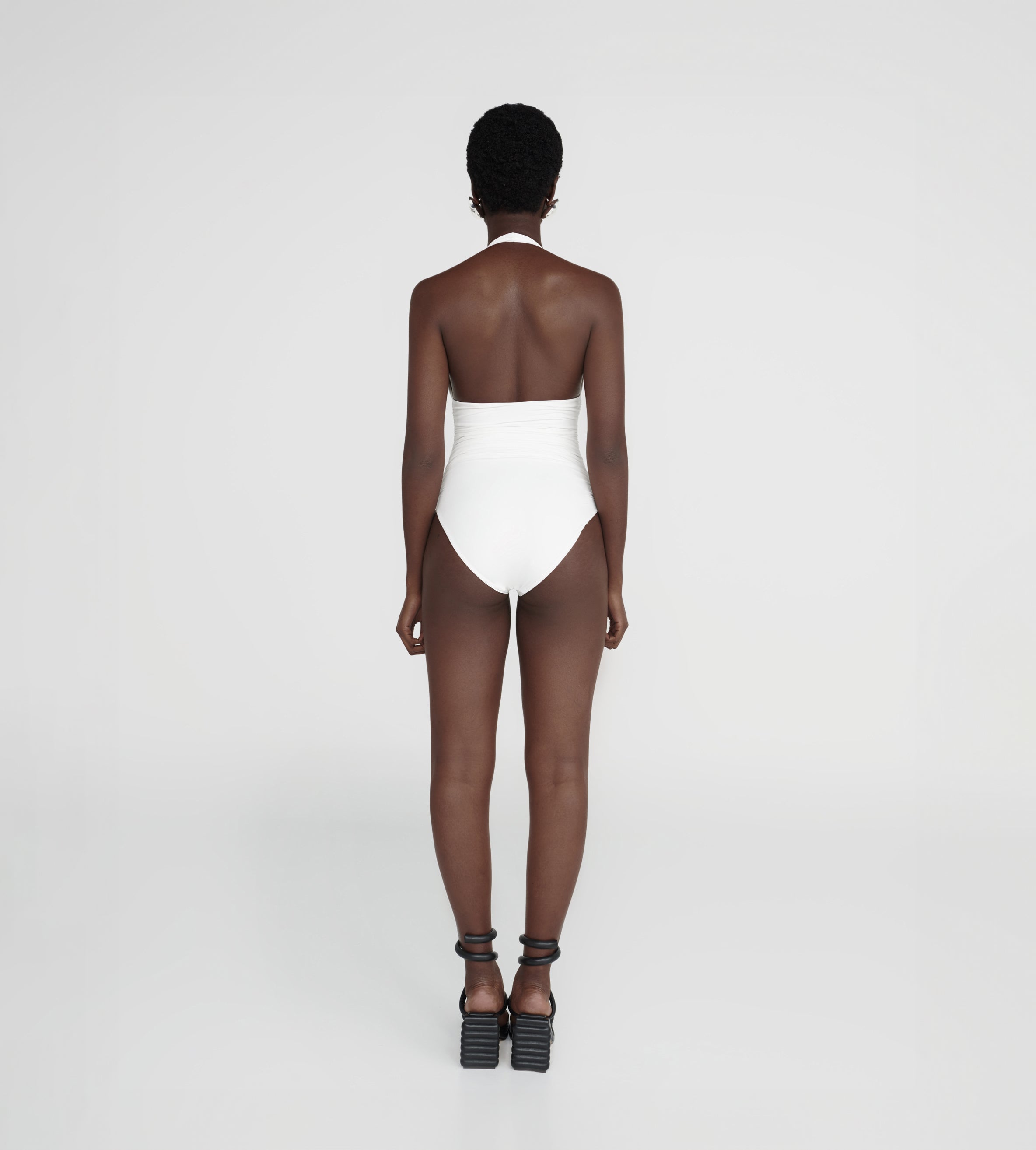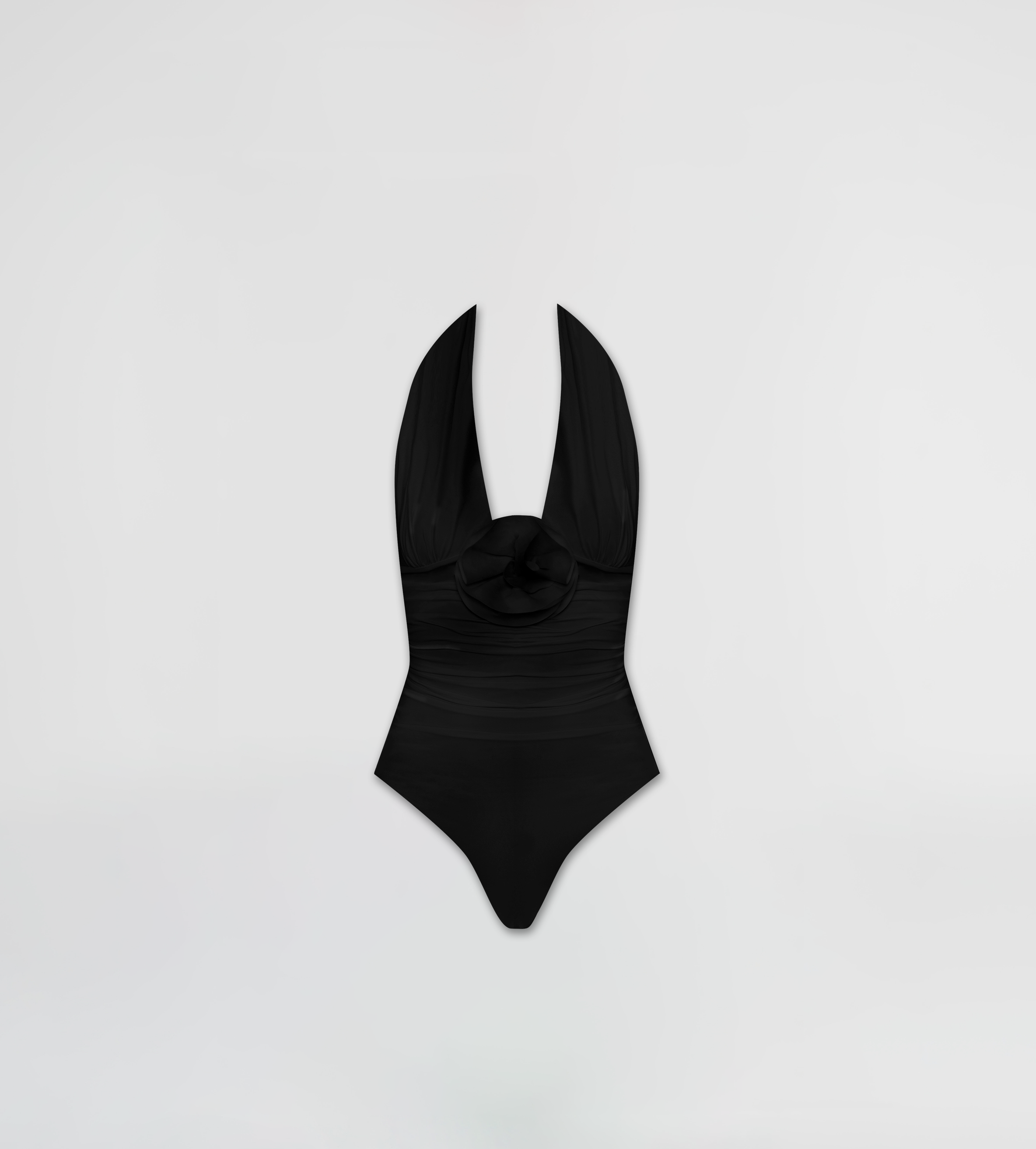 Deep halter neckline one-piece with an open back, ruched bodice that flatters and hugs the curves of every woman's body and a 3D handmade flower detail that represents the ever-blooming and changing Latin woman.