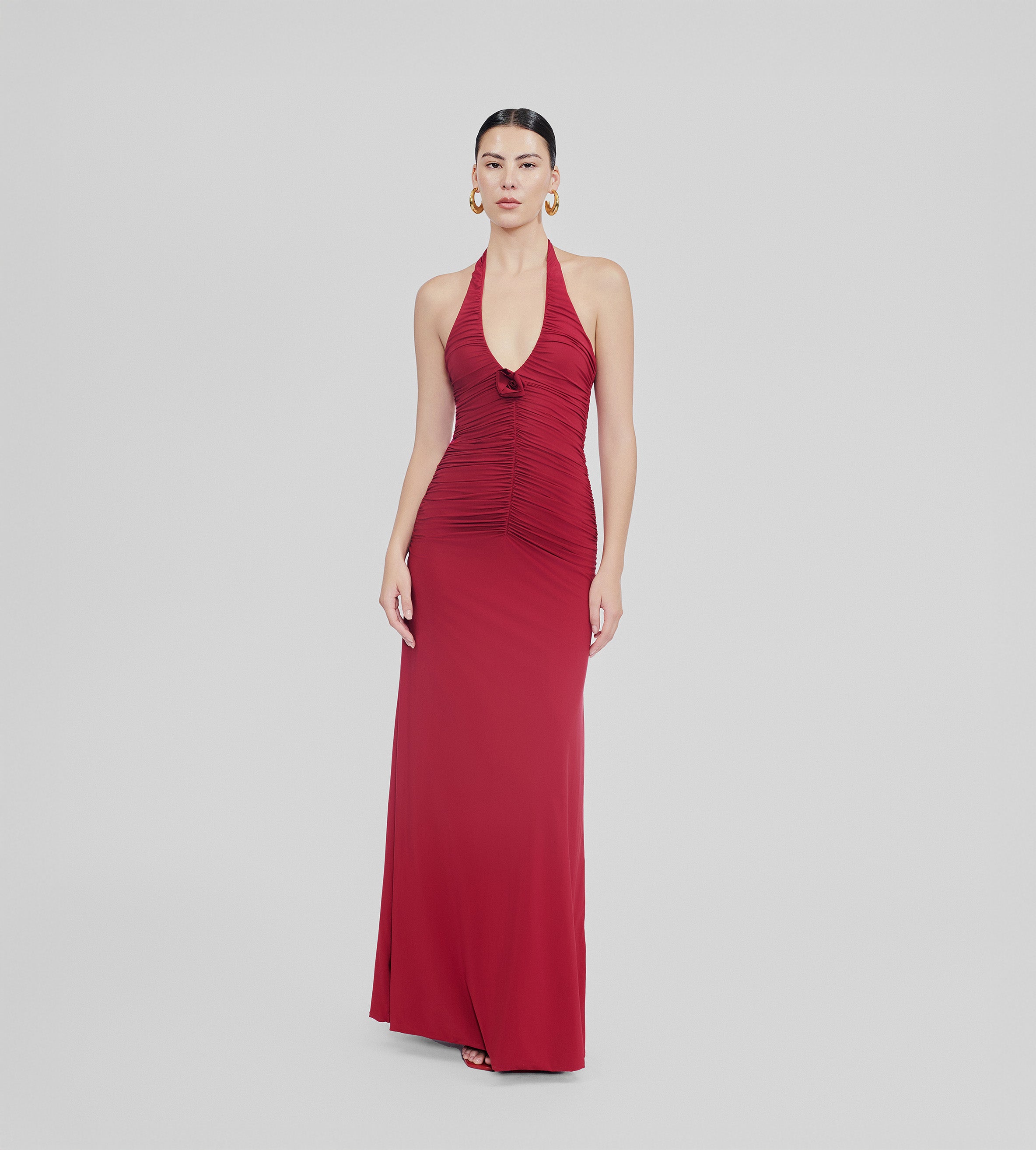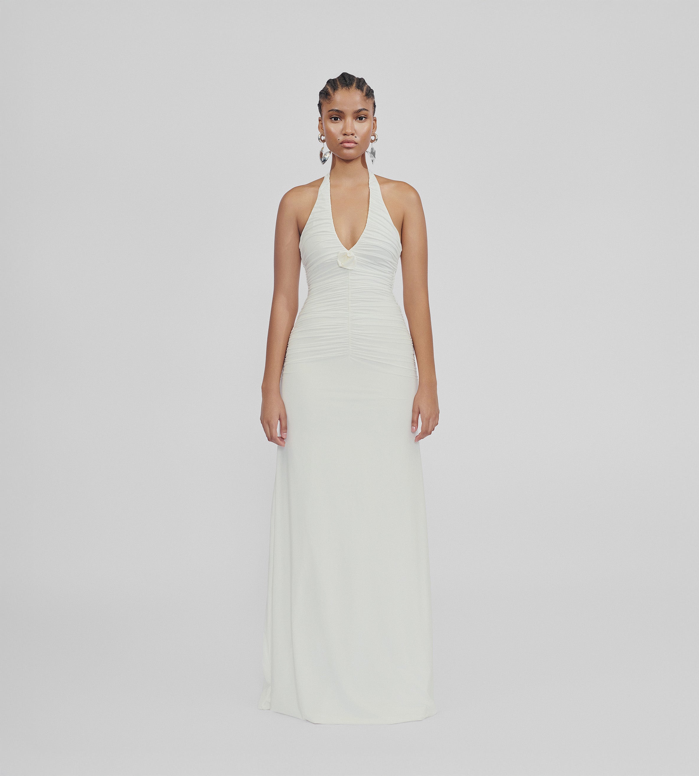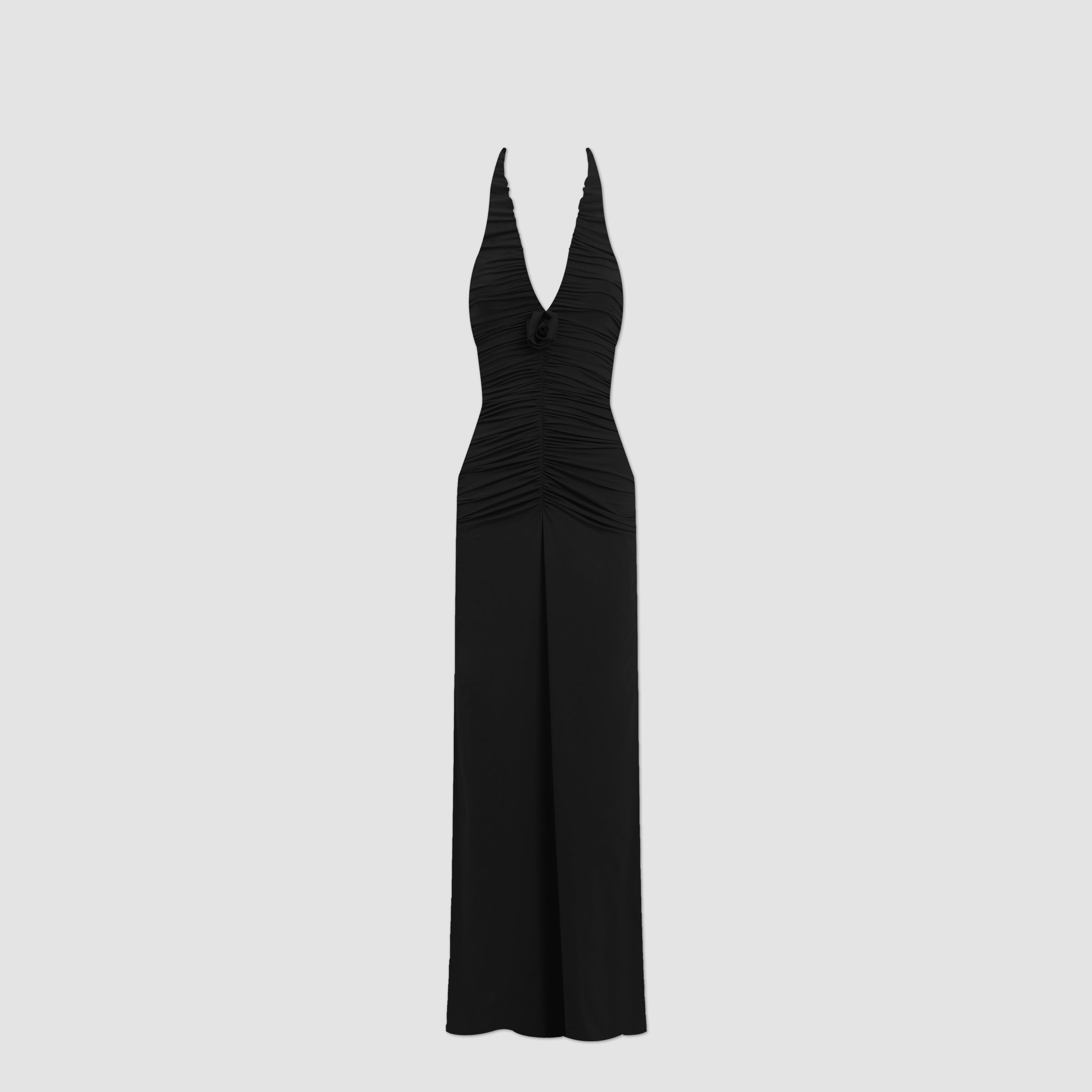 The Román dress features a halter-style neckline with a plunging V-shape, accentuated by ruching at the front and back that beautifully contours the bust and torso. A central 3D handcrafted floral accent adds a delicate touch of femininity and refinement, seamlessly flowing into a graceful A-line skirt.