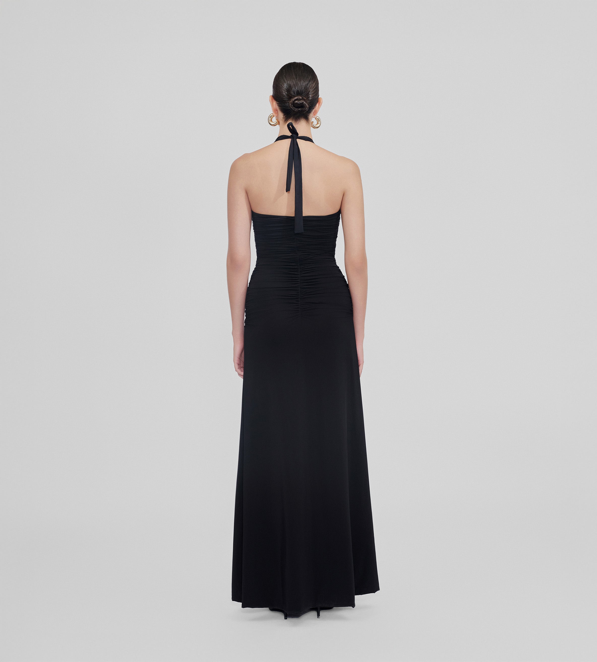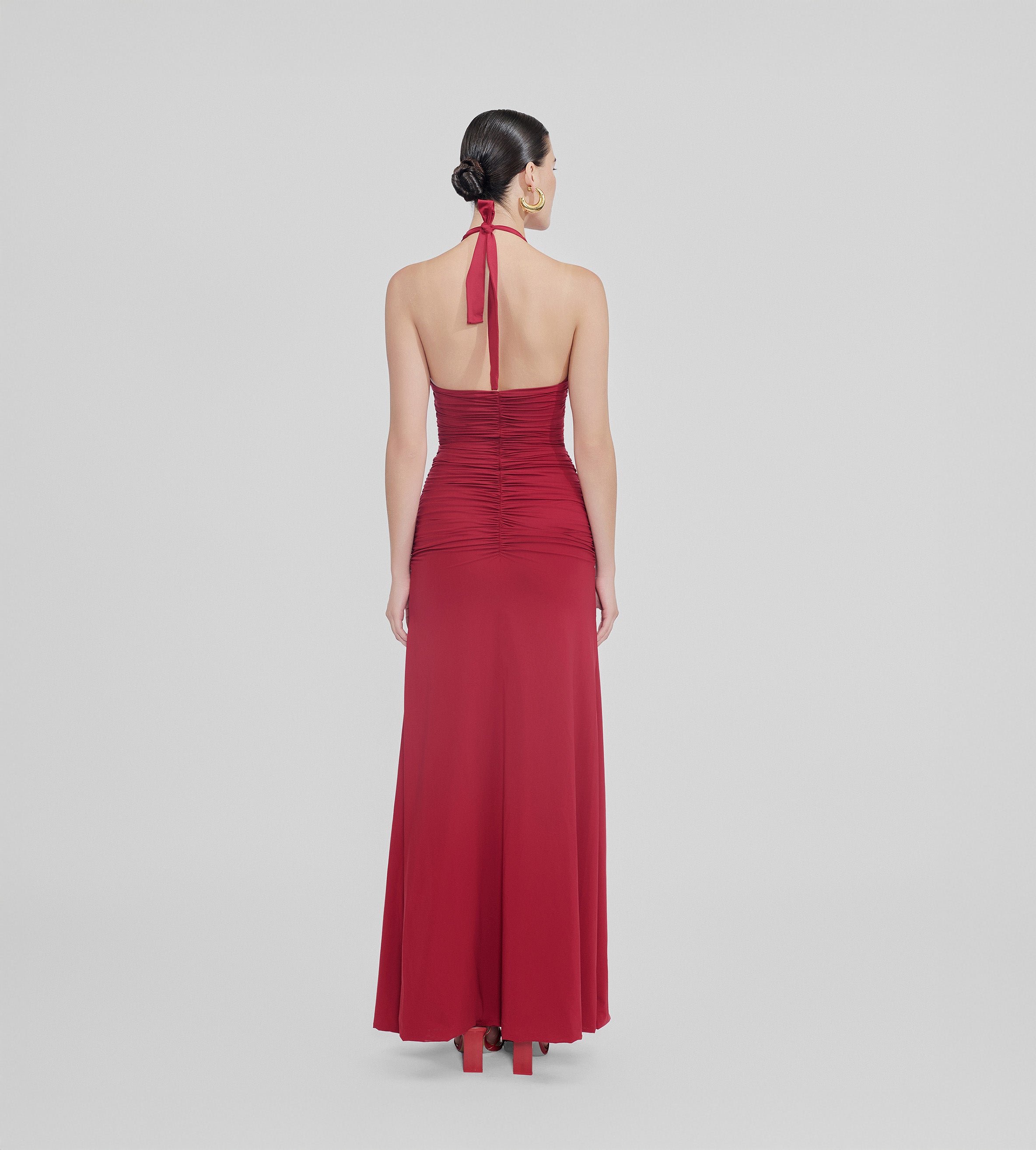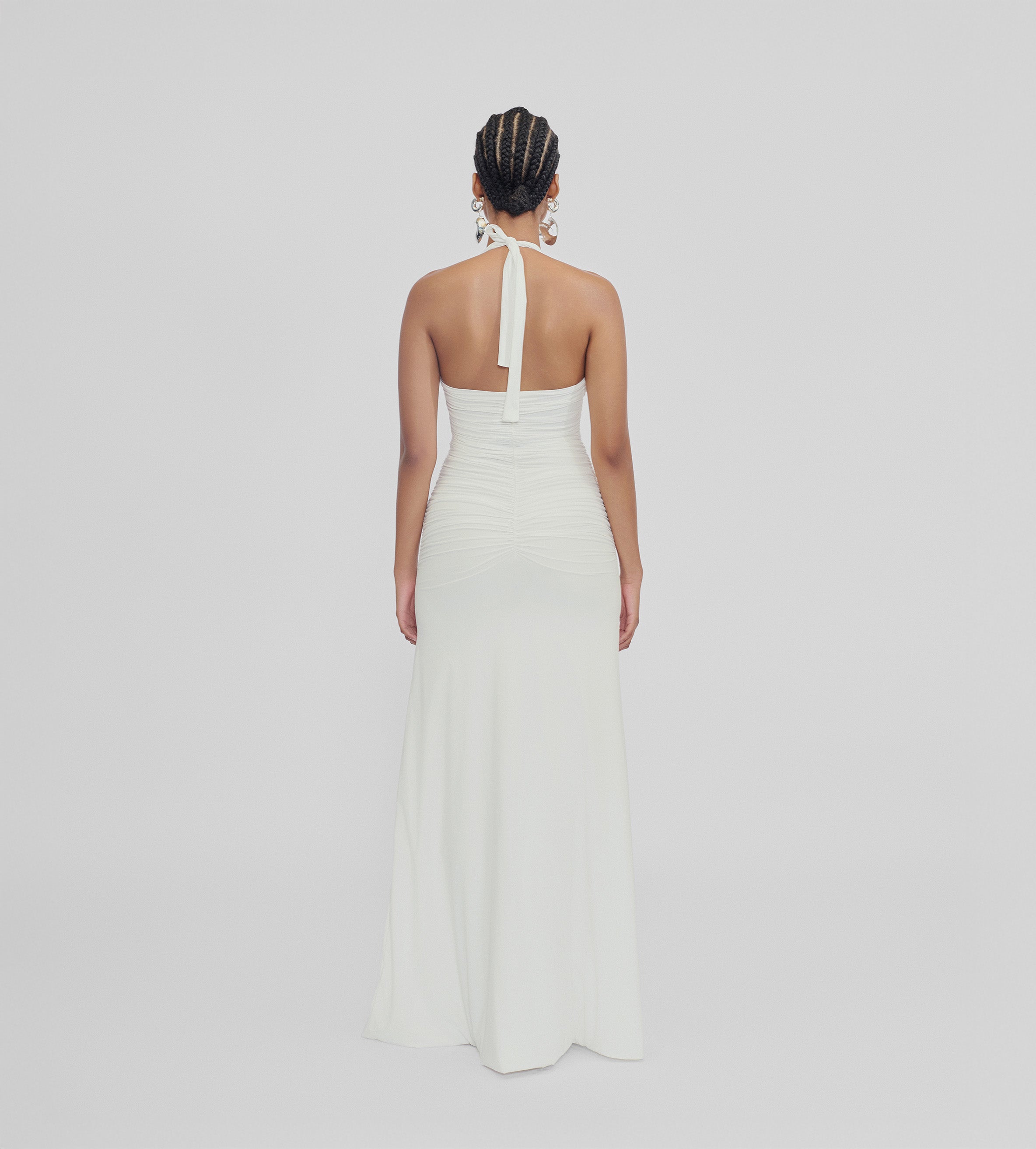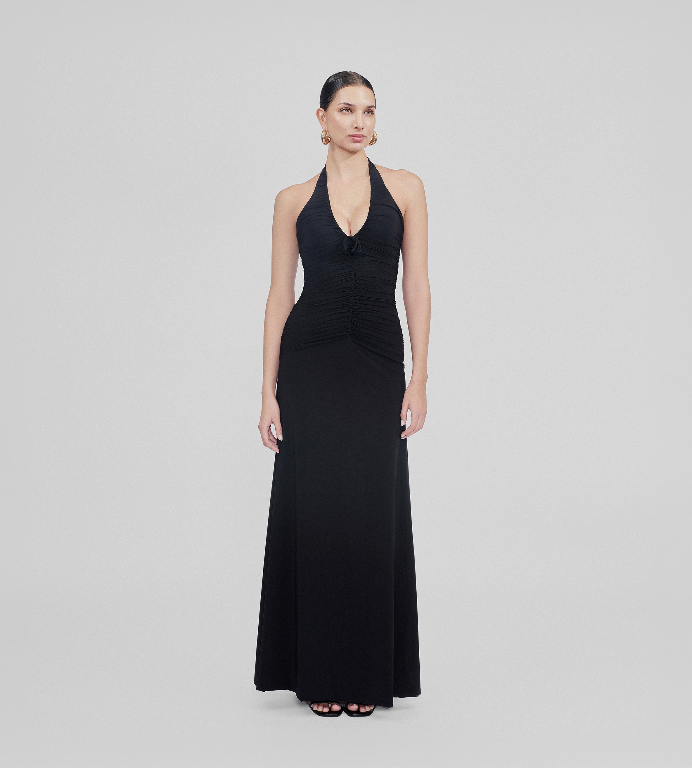 The Román dress features a halter-style neckline with a plunging V-shape, accentuated by ruching at the front and back that beautifully contours the bust and torso. A central 3D handcrafted floral accent adds a delicate touch of femininity and refinement, seamlessly flowing into a graceful A-line skirt.