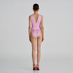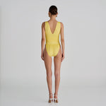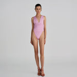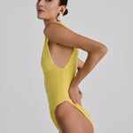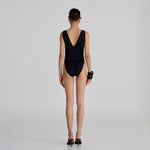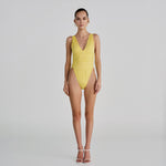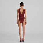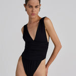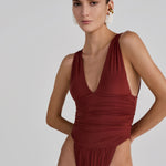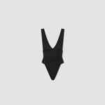 Deep-V neckline one-piece with ruched bodice and low coverage ruched bottom, a sexy and posh design that represents our always playful and alluring aesthetic.