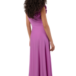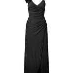 Long dress with a deep V neckline, thin straps and flower ruffle detail, one side rushing and asymmetric wrap hem.