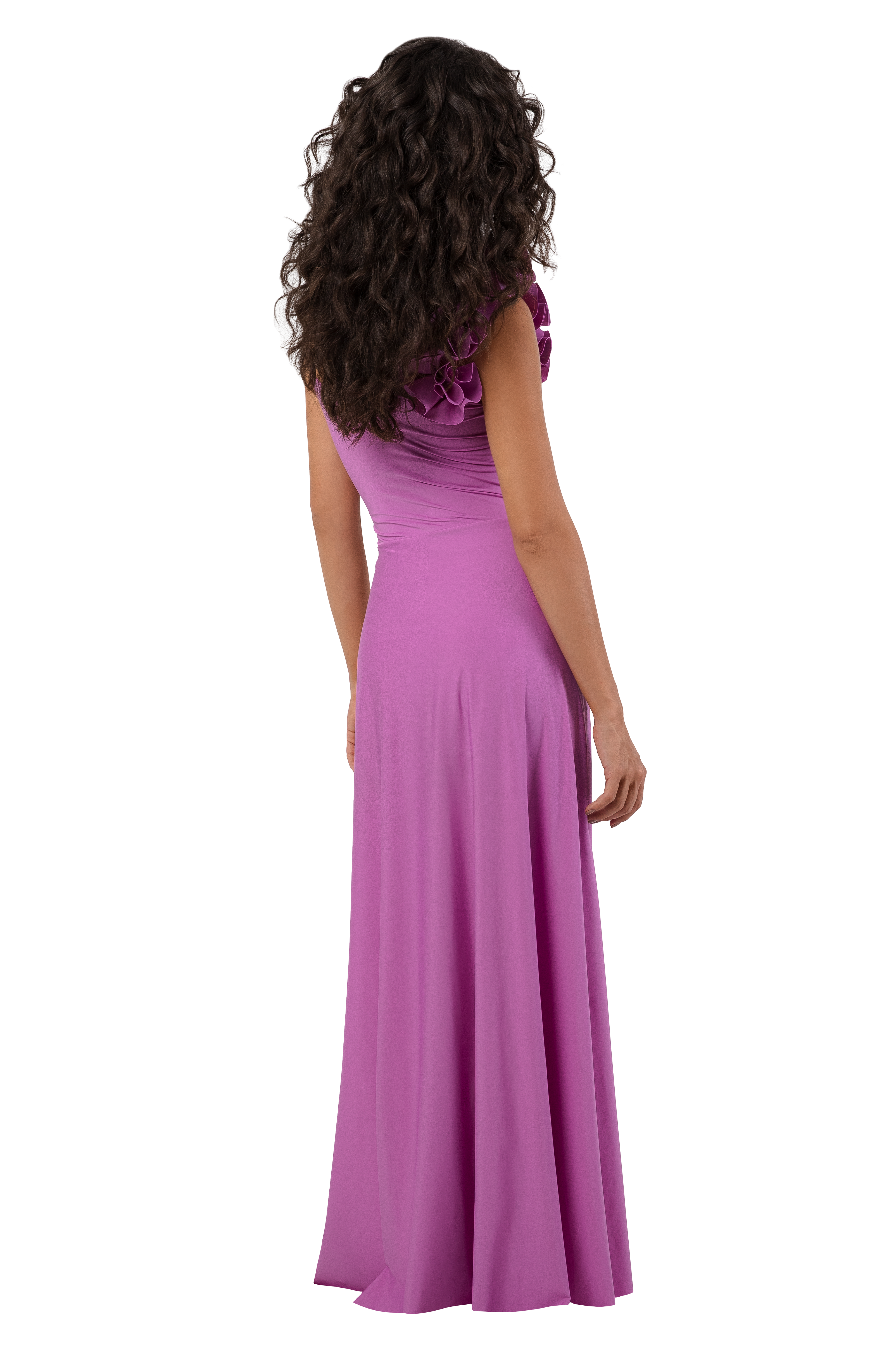 Long dress with a deep V neckline, thin straps and flower ruffle detail, one side rushing and asymmetric wrap hem.
