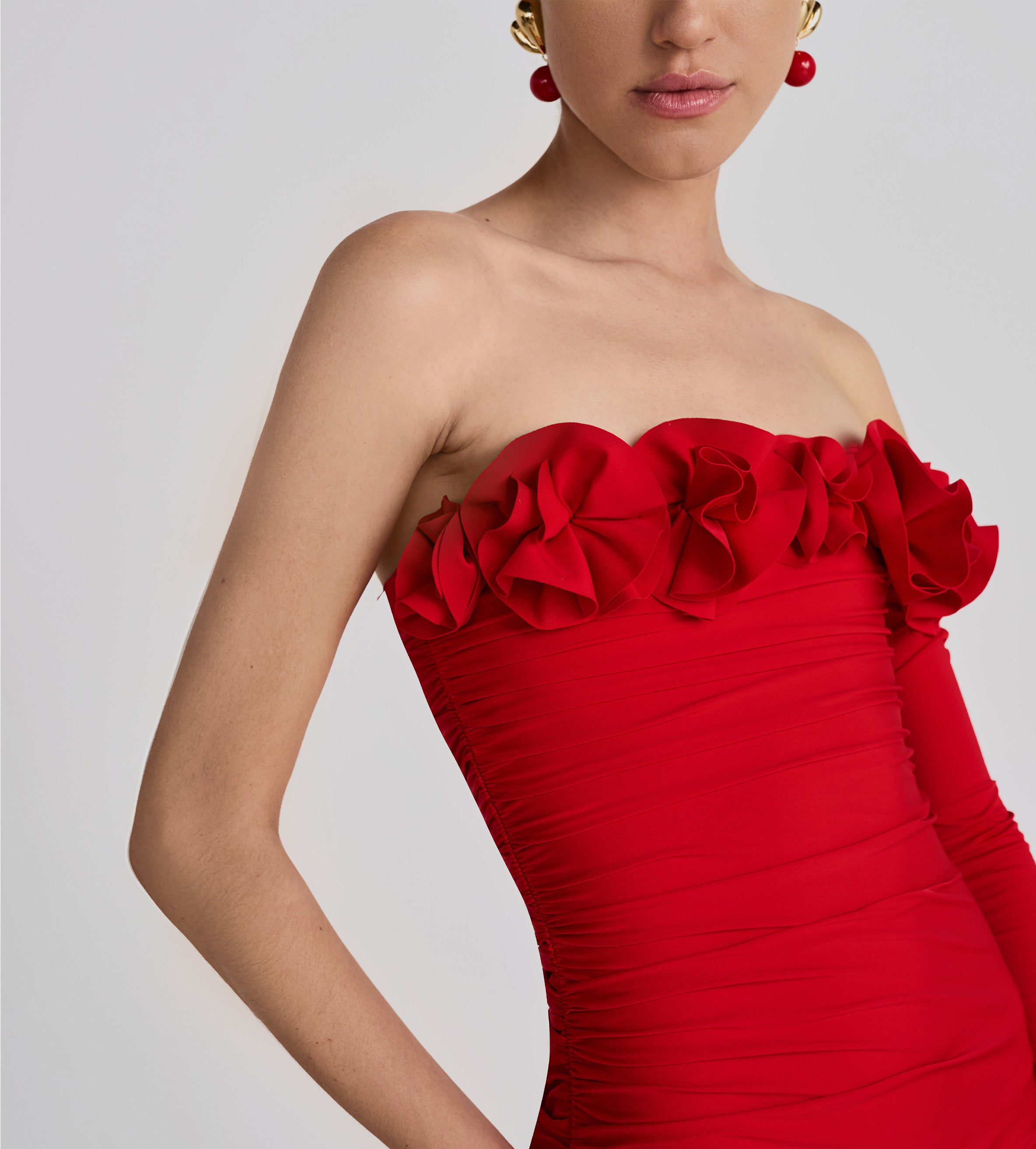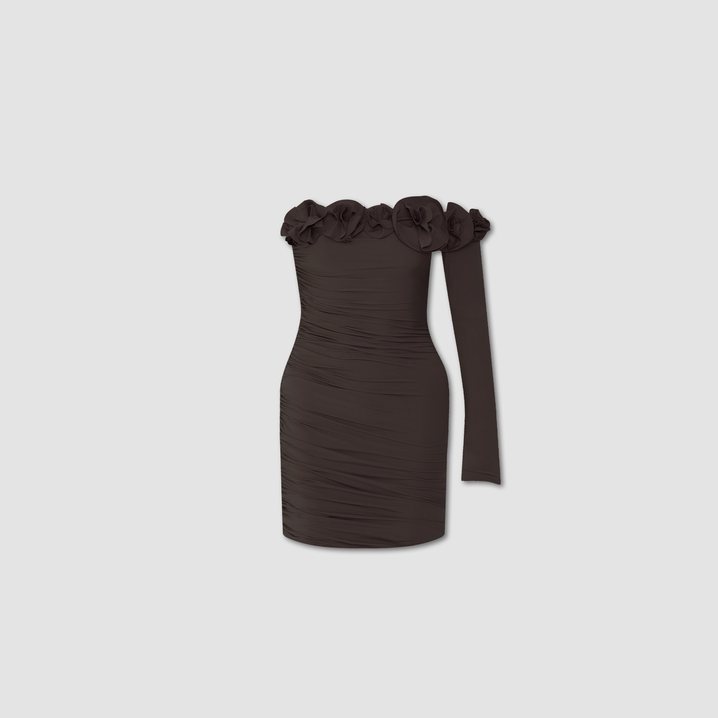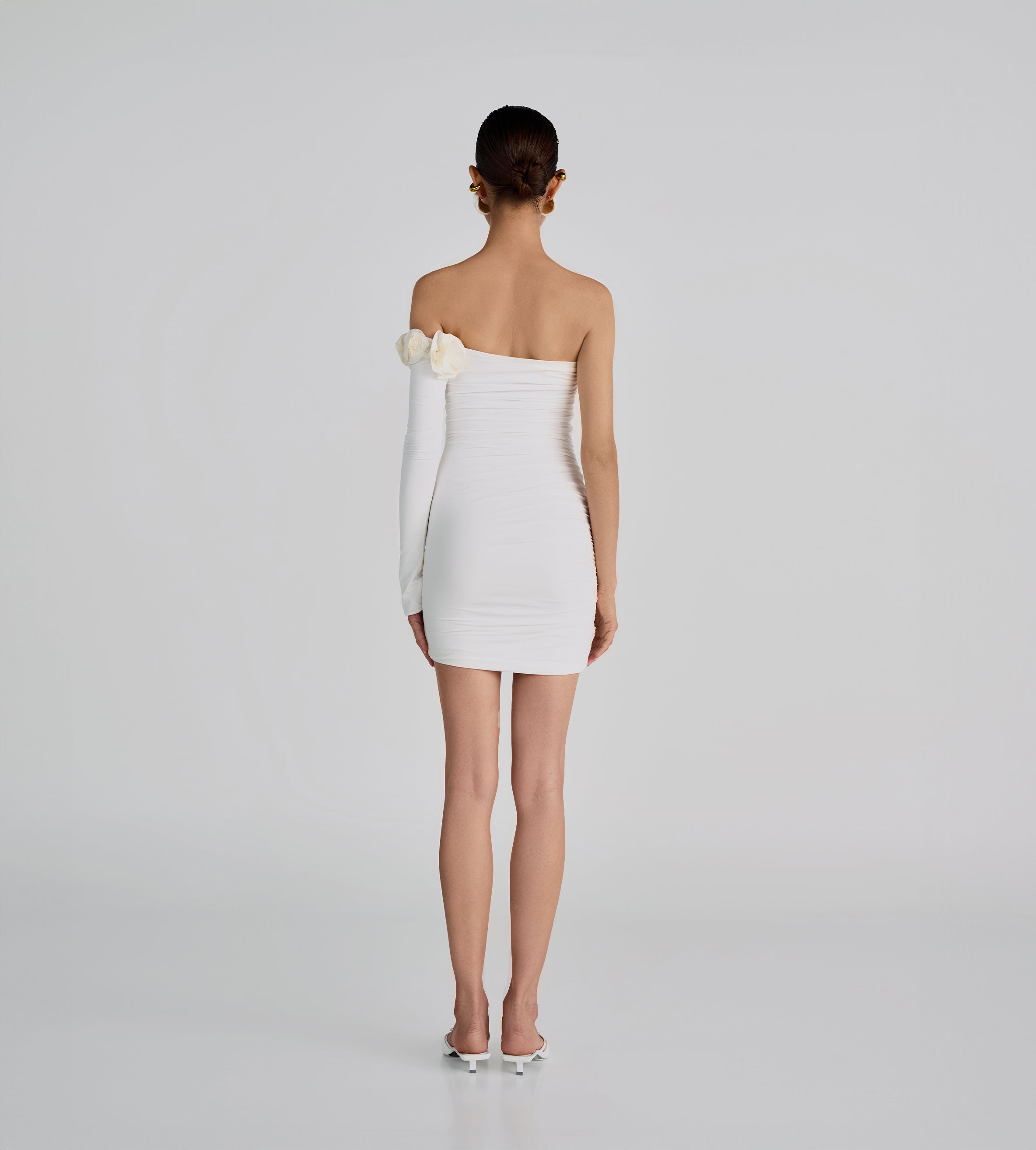 Our Selvaggio mini dress features an off-shoulder neckline adorned with a variety of 3D handmade flowers, a fitted ruched design with one long, sleek sleeve wrapping-up the perfect mini dress assemble.