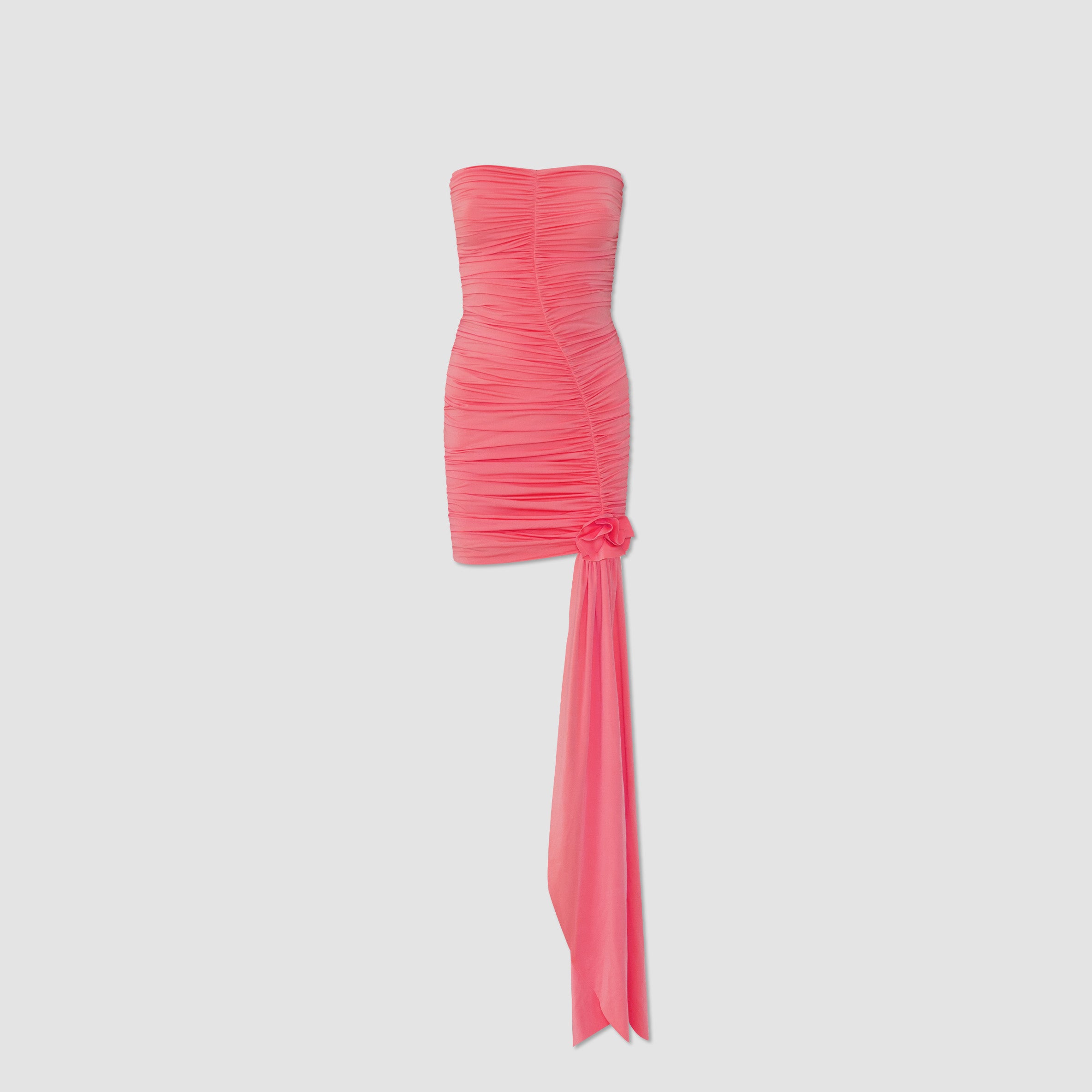 Sweetheart strapless mini dress with a wave-shaped ruched design at the front and perpendicular ruching at the back; this mini dress is a must-have in your vacation suitcase. Complemented with a 3D handmade flower detail at the hem and a sensual long sash.